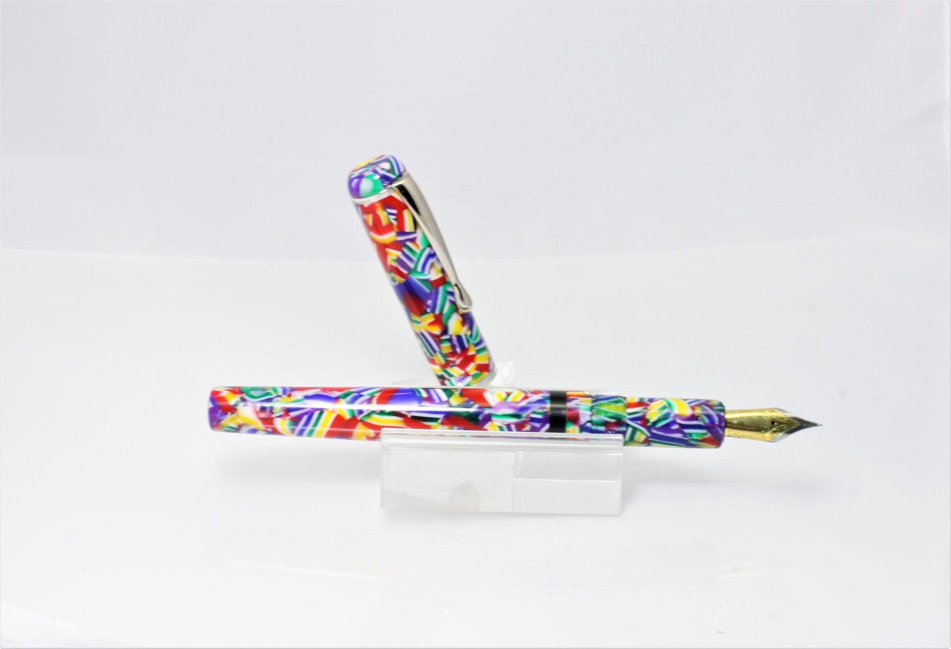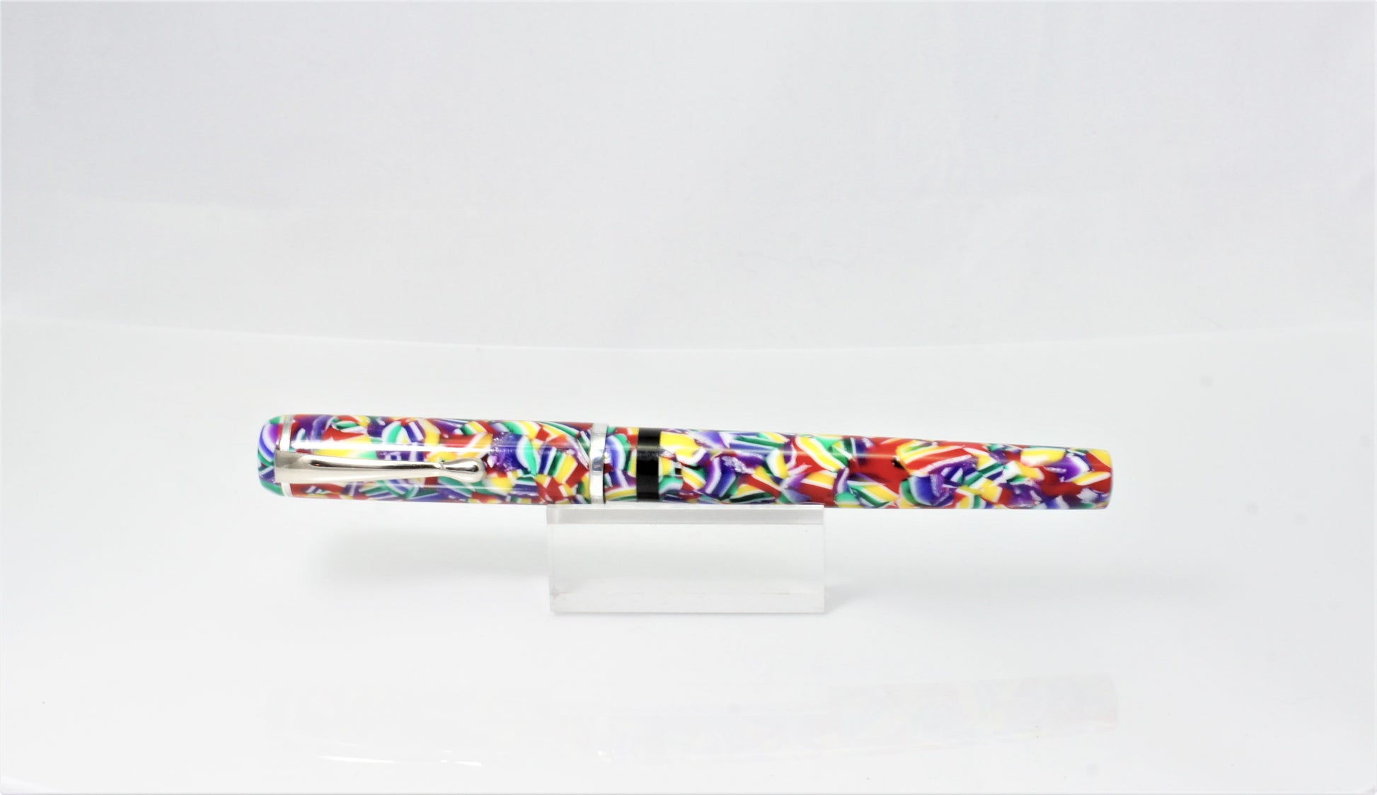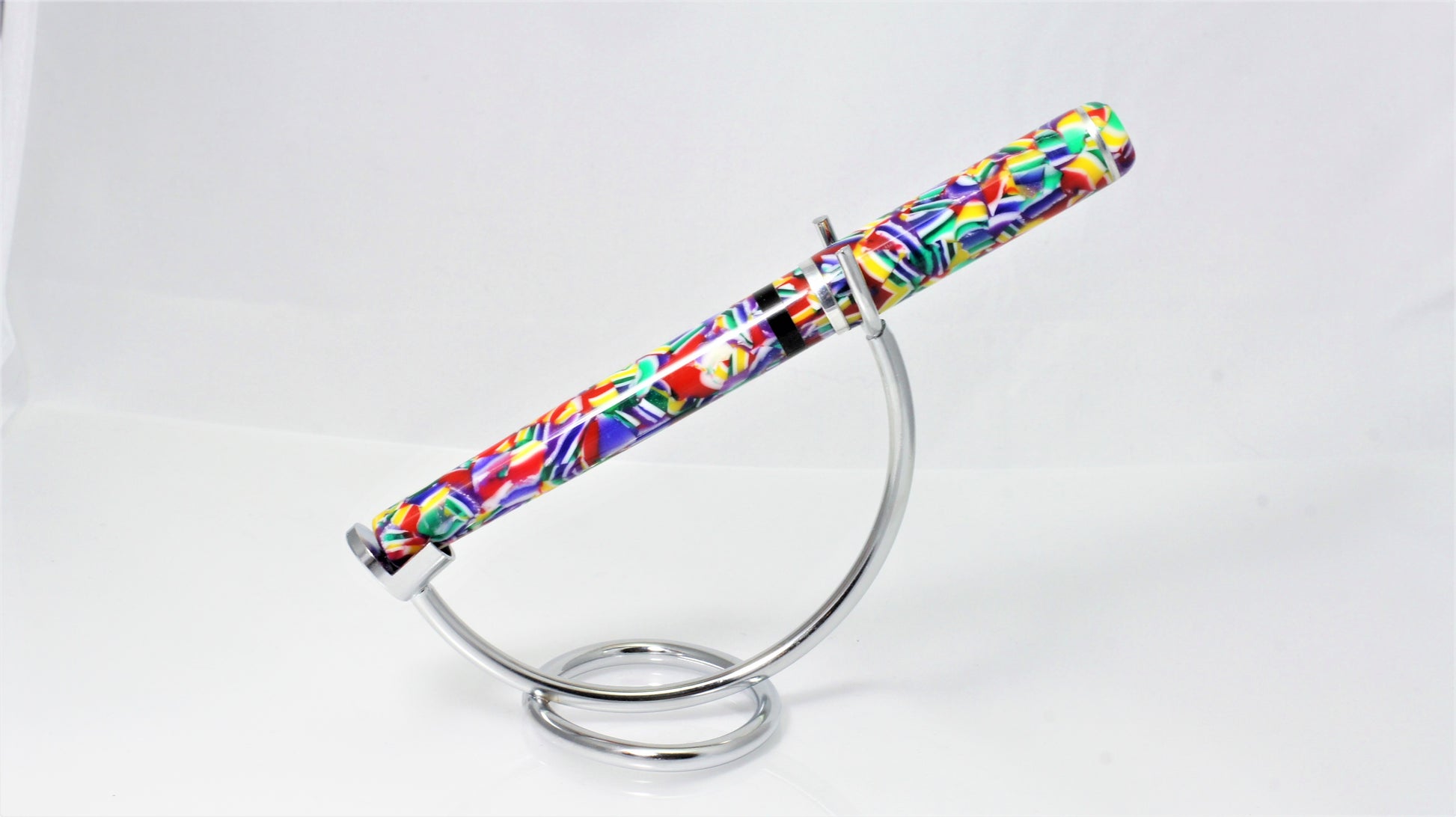 This is just a cool looking pen. The body is very BOLD, sporting reds, blues, yellows, greens, white, and black. This is a long slender pen, easy to hold posted or not. Its longer straight section makes it comfortable for both petite and extra large fingers. This pen makes a statement...