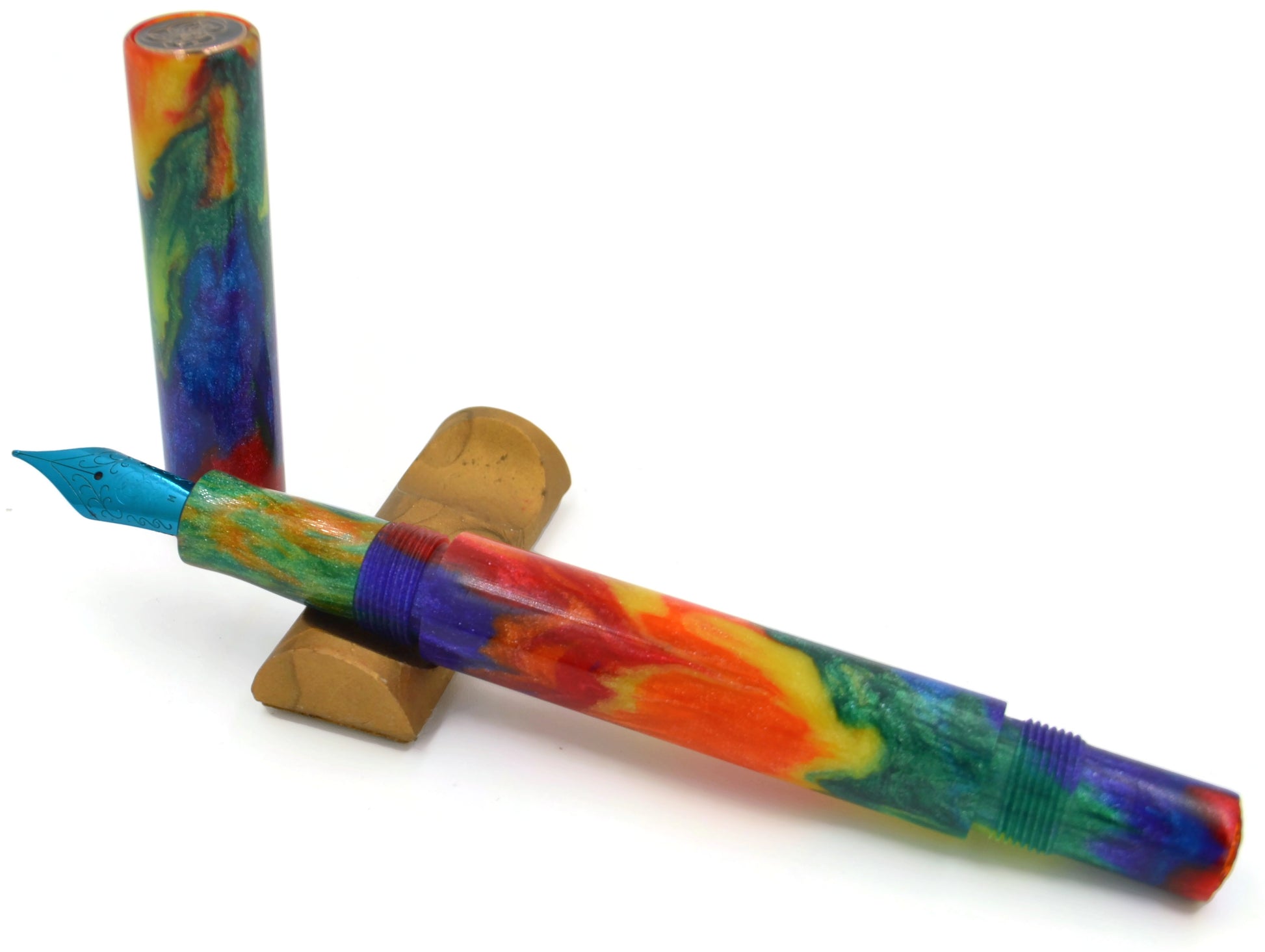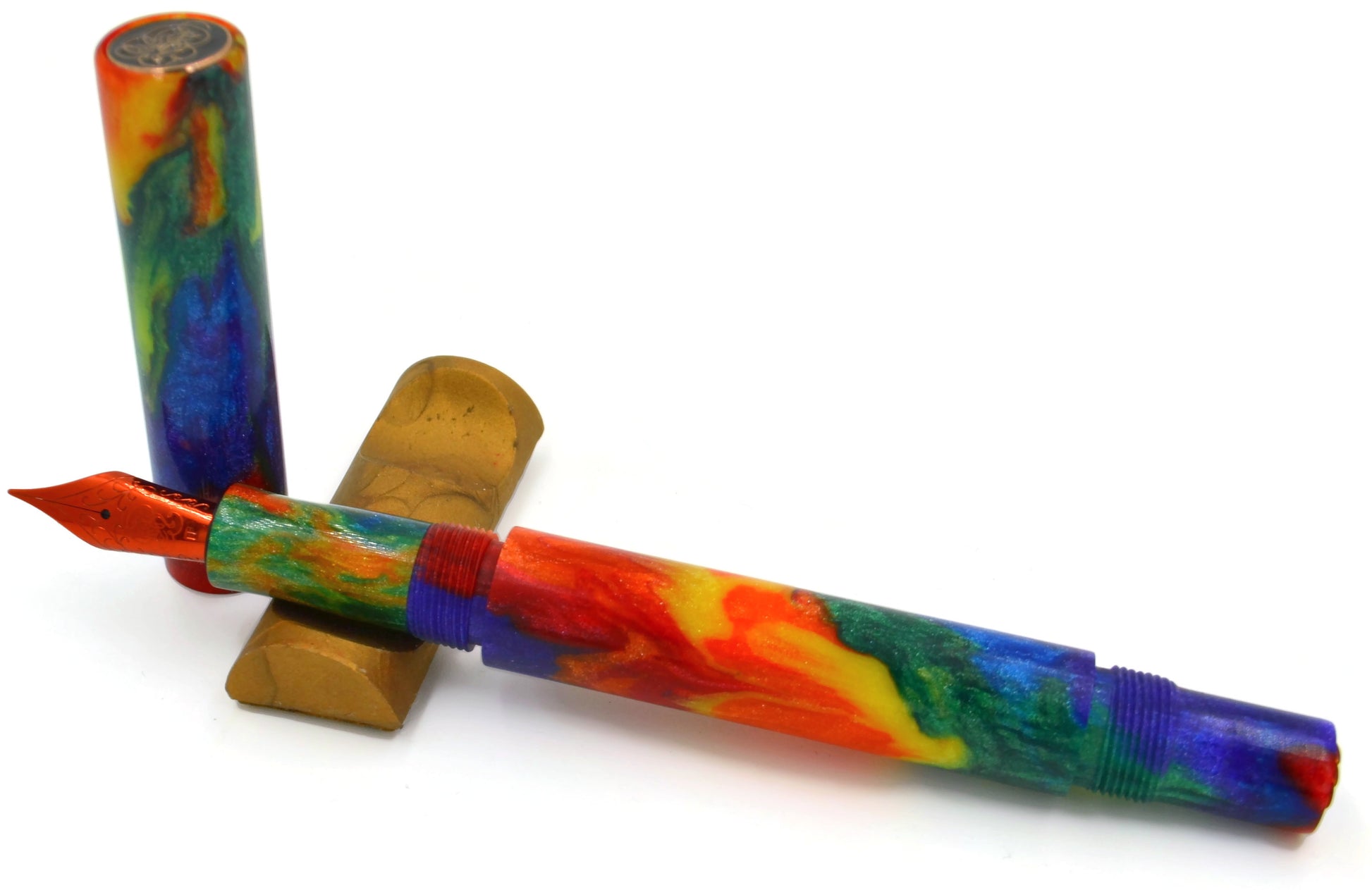 The original rainbow custom pen. From our friends at Diamondcast, we present a beautiful, multi-color swirled pen they have called the oil slick. We created this model back in early 2018 and debuted at the DC Pen show. We named it Bifrost after the old Norse mythological "Rainbow Bridge" connecting the realms of the universe.
