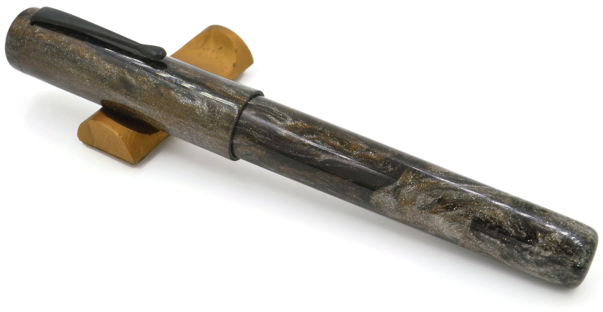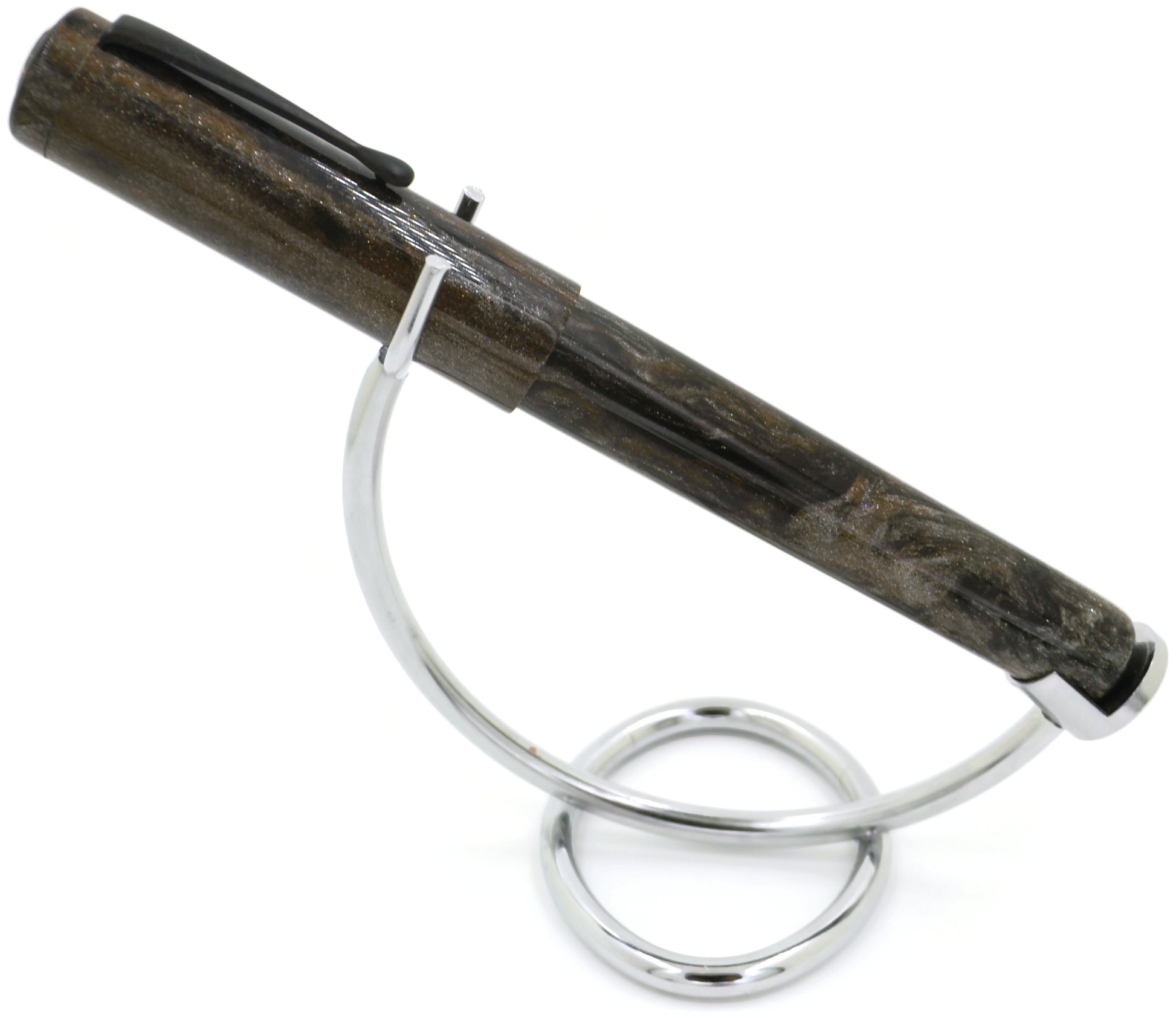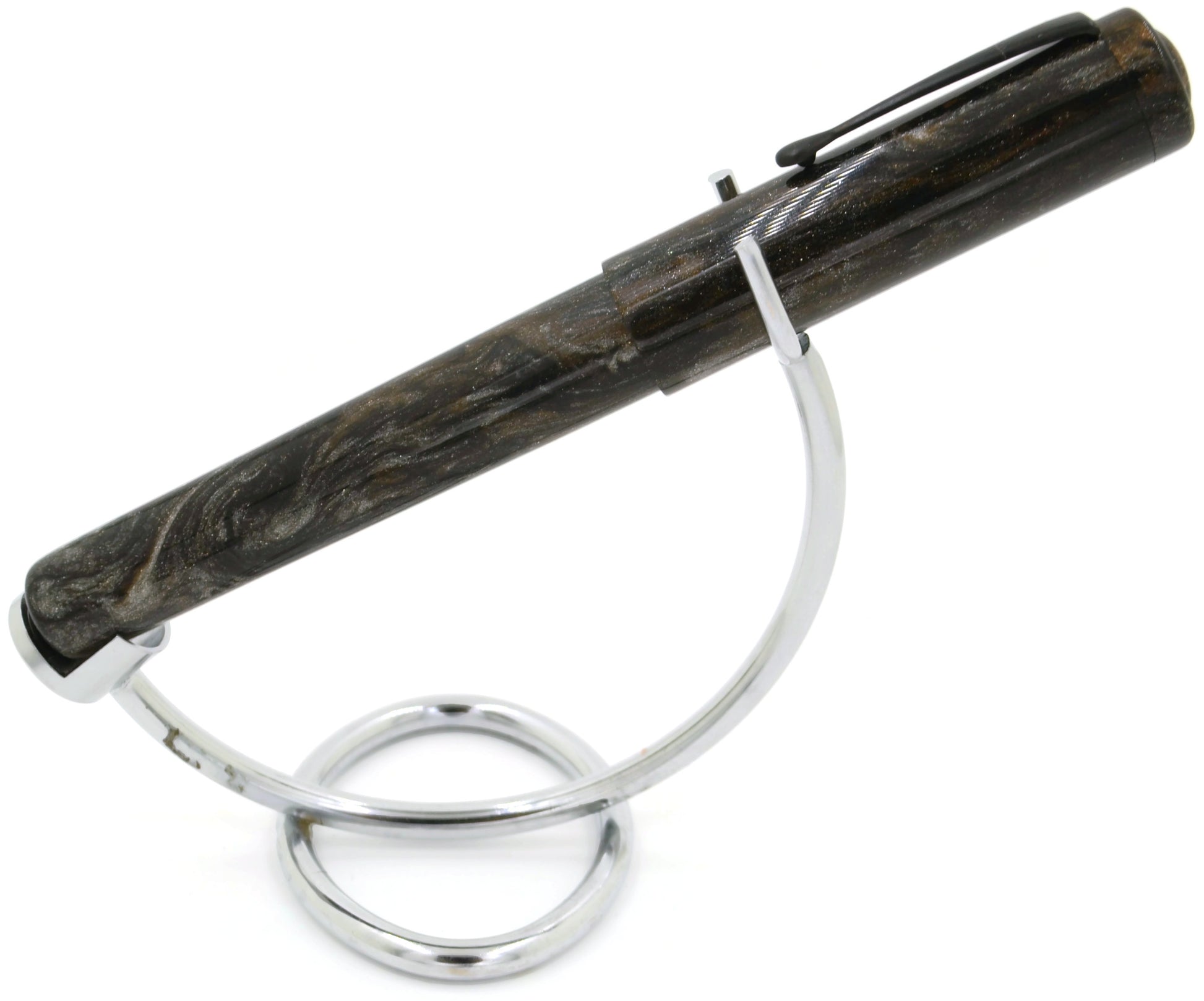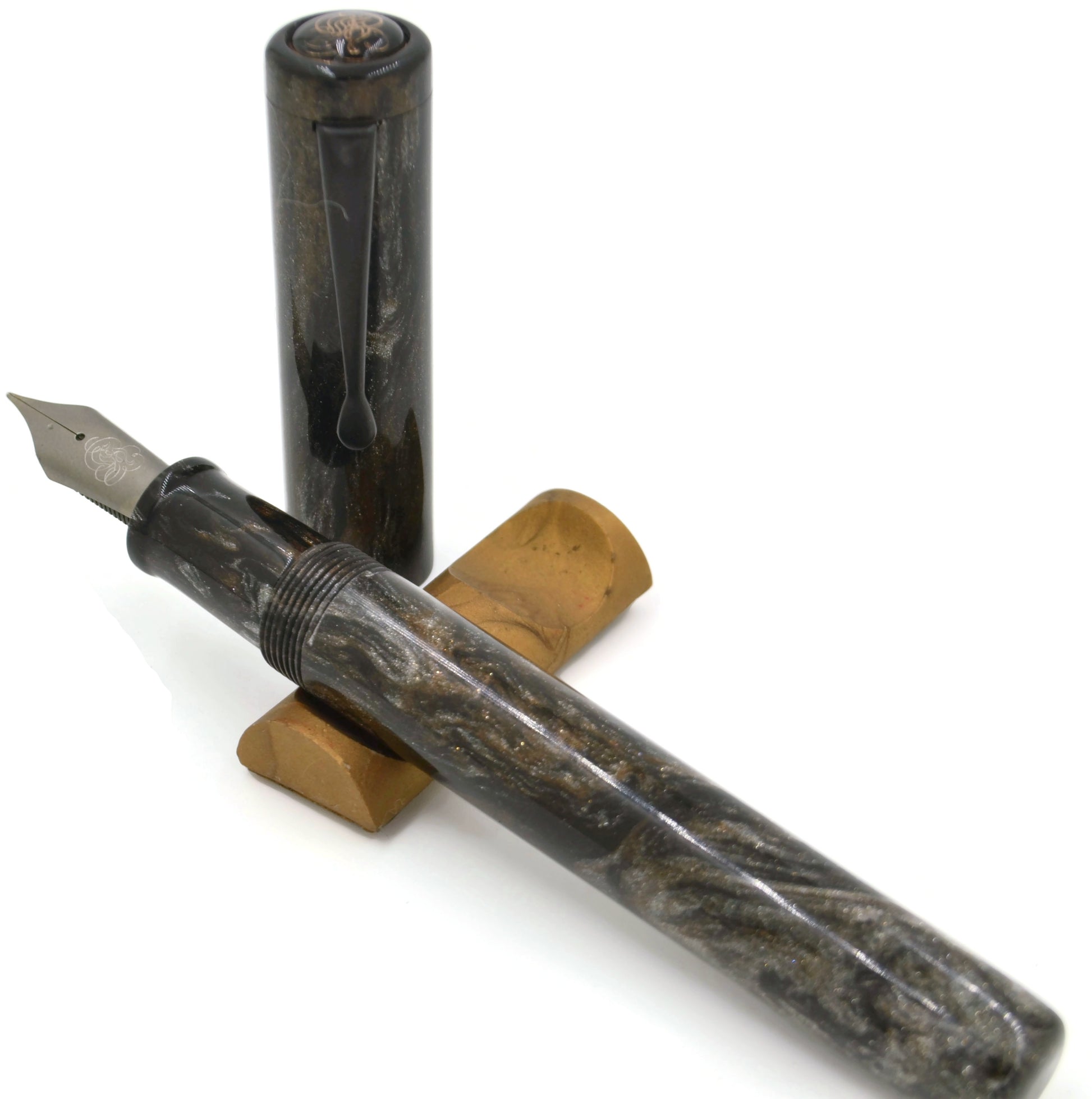 When we created the Bifrost, we wanted a pen to pair with it. Running on the norse theme (mythology being a hobby of mine), I set out in collaboration with our friends at Diamondcast to create a pen big enough and bold enough to pair with our "rainbow bridge" pen. Taking hints from mythology and current popular culture, we created this silver, bronze, and black beauty.