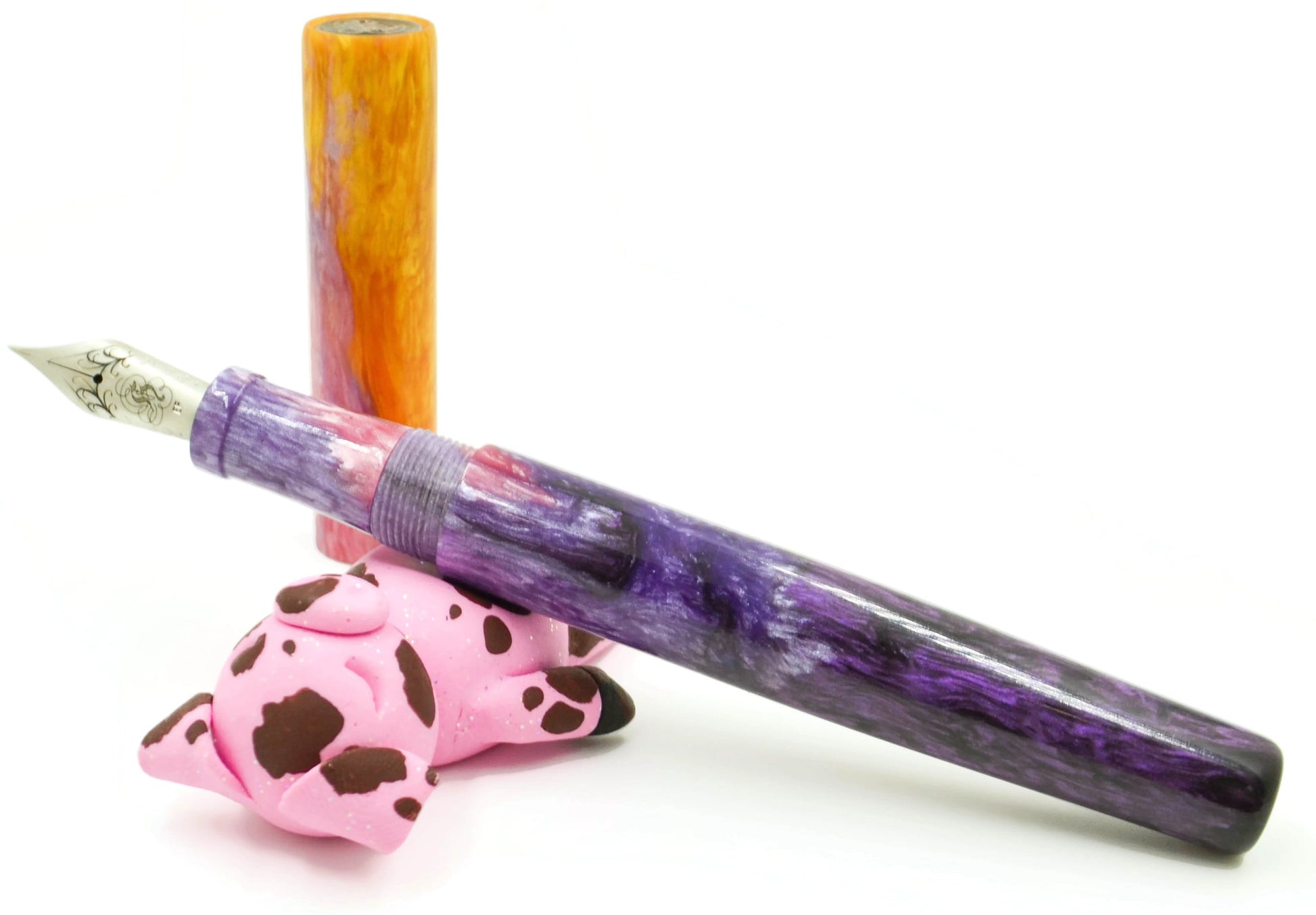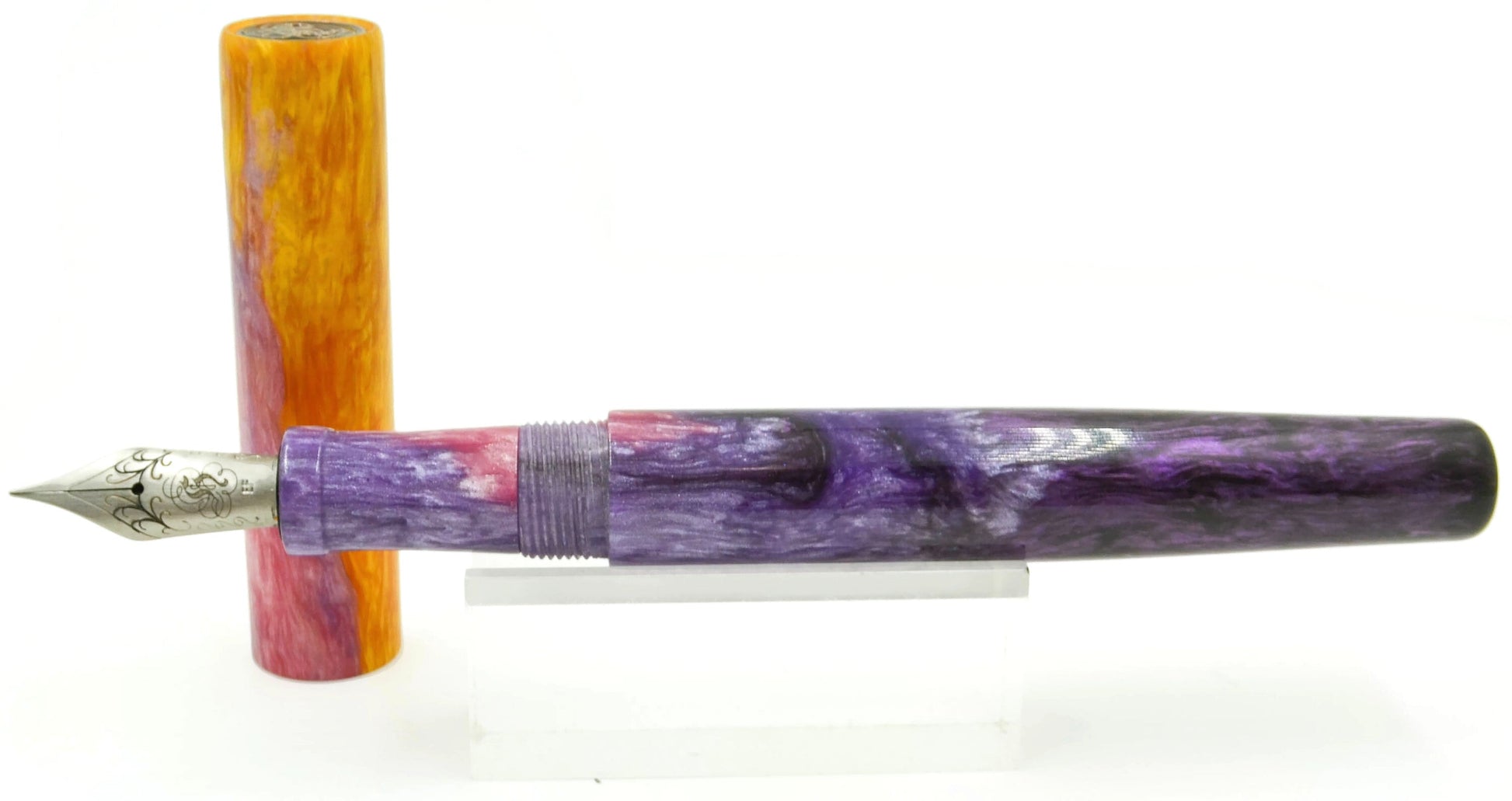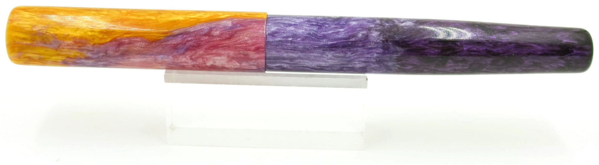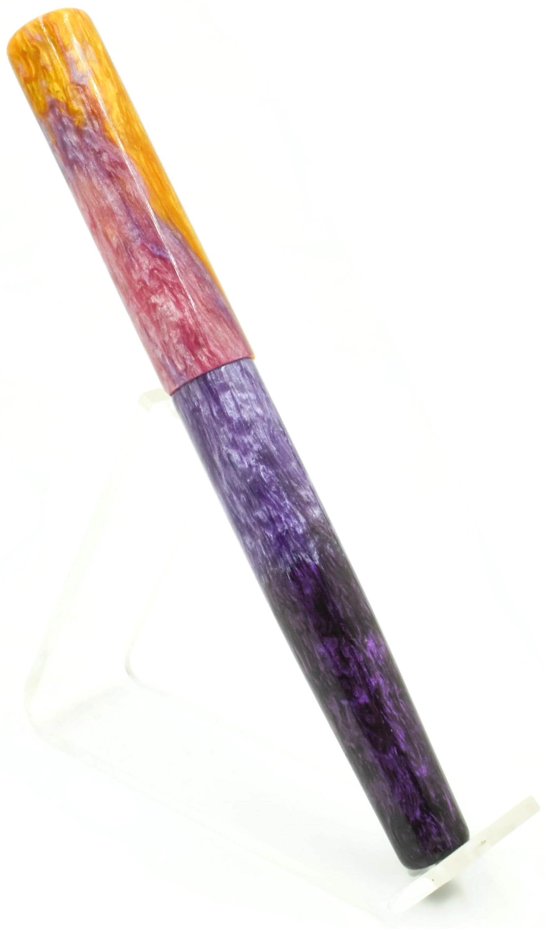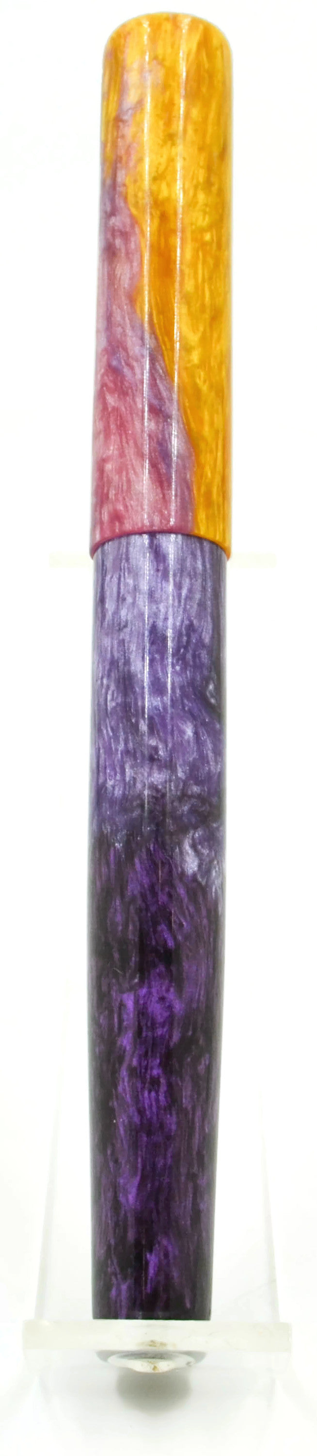 Inspired by a background image (see below the description for credit to the image) Elyce's daughter brought to her, we have her latest resin masterpiece... gradients of purple flow up to a brilliant yellow-orange, matching the background incredibly well... if you like purple, this is a pen for you.