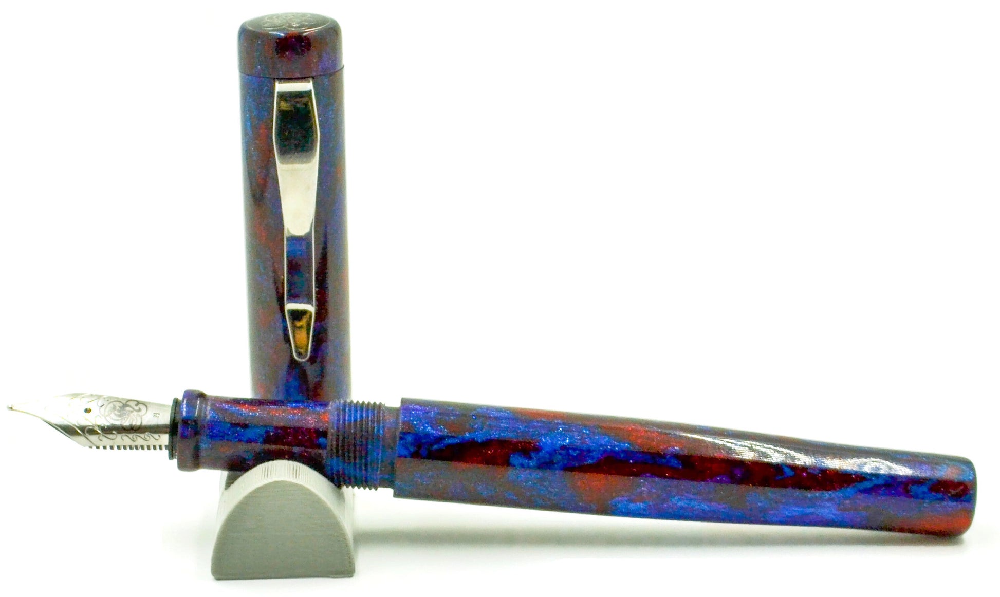 Beautiful diamondcast blank. Dark blue (in places almost black) and red swirl about.. giving the appearance of a nebula in space. Works equally well with a red or blue nib.