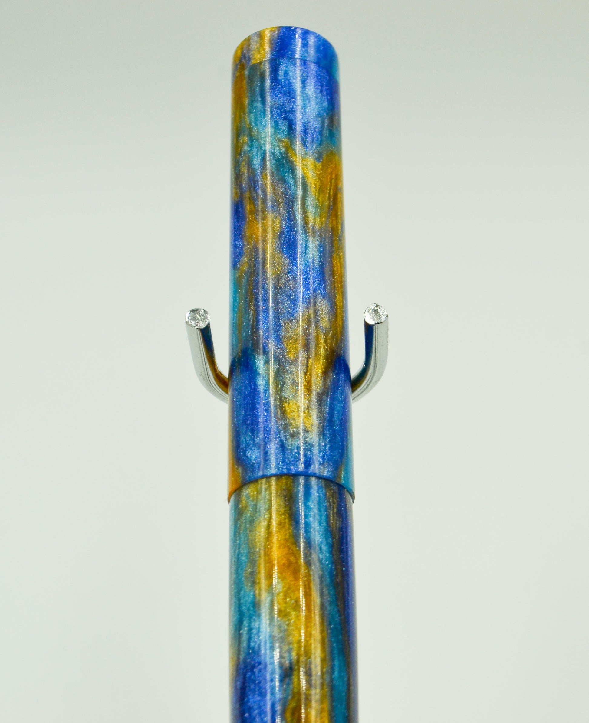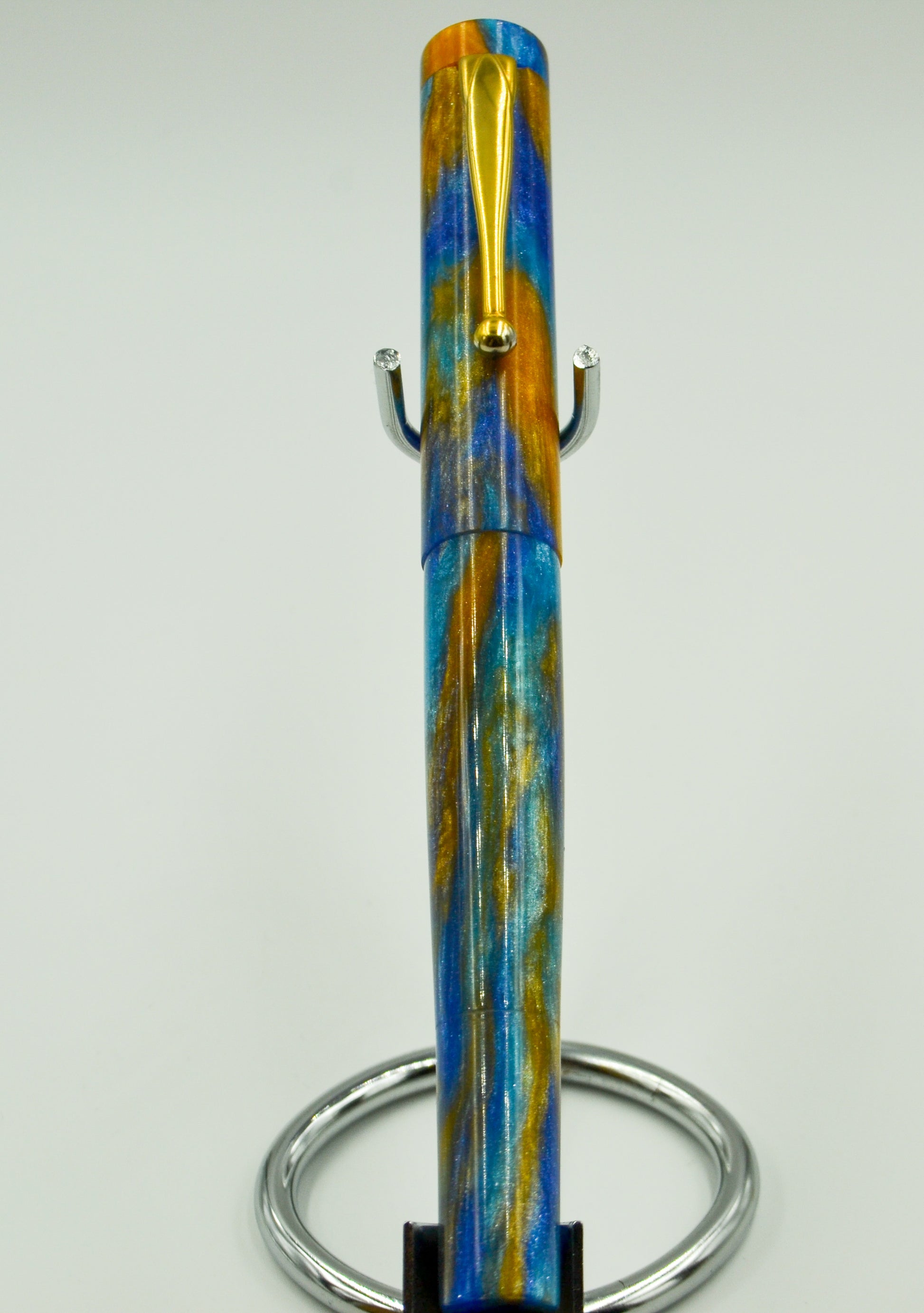 From our friends at DiamondCast, blue, white, and gold diamond infused material really makes for a stunning pen. This is one of my favorite stock DiamondCast materials. This pen is postable, and features a gold vintage inspired clip.