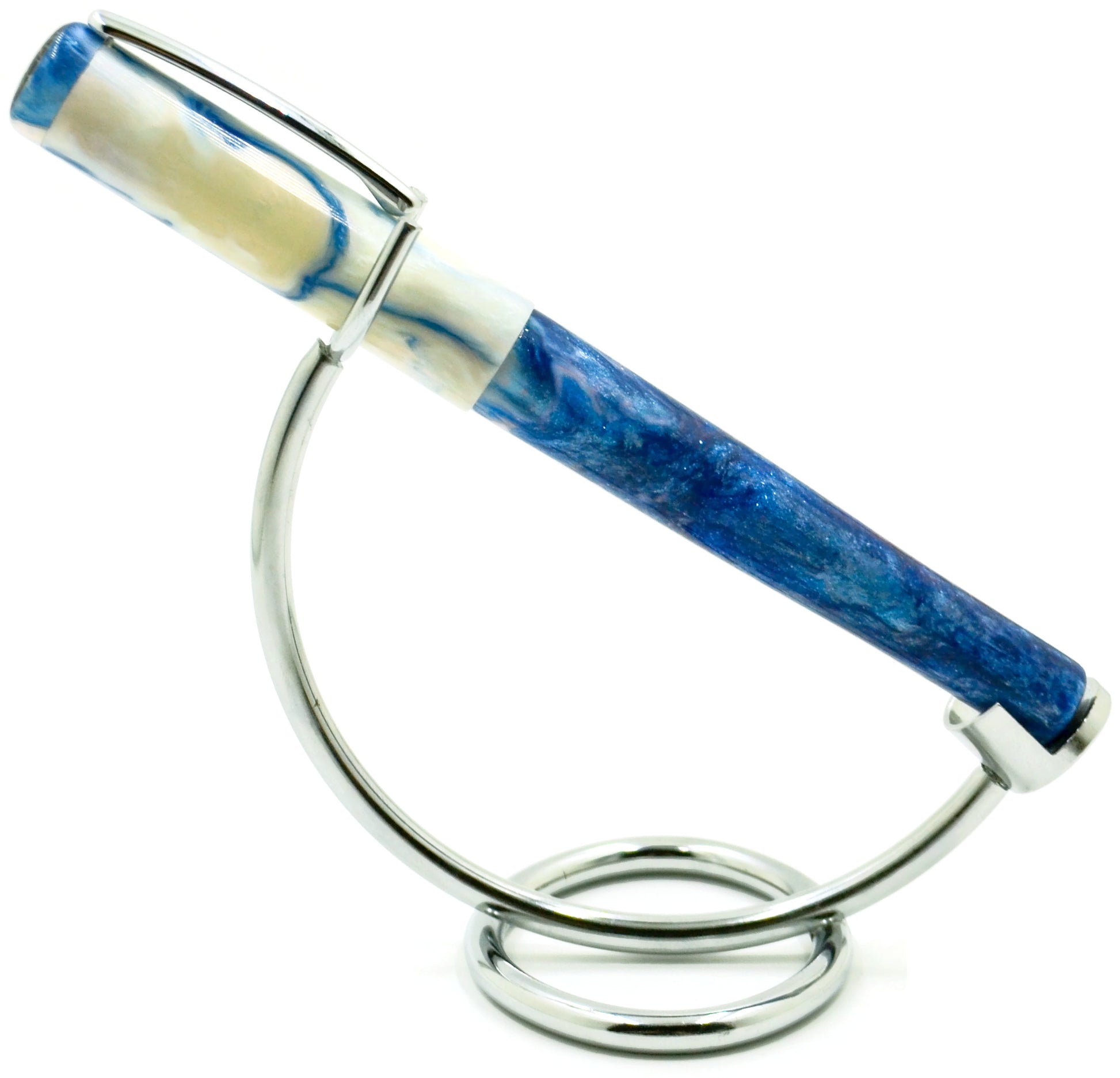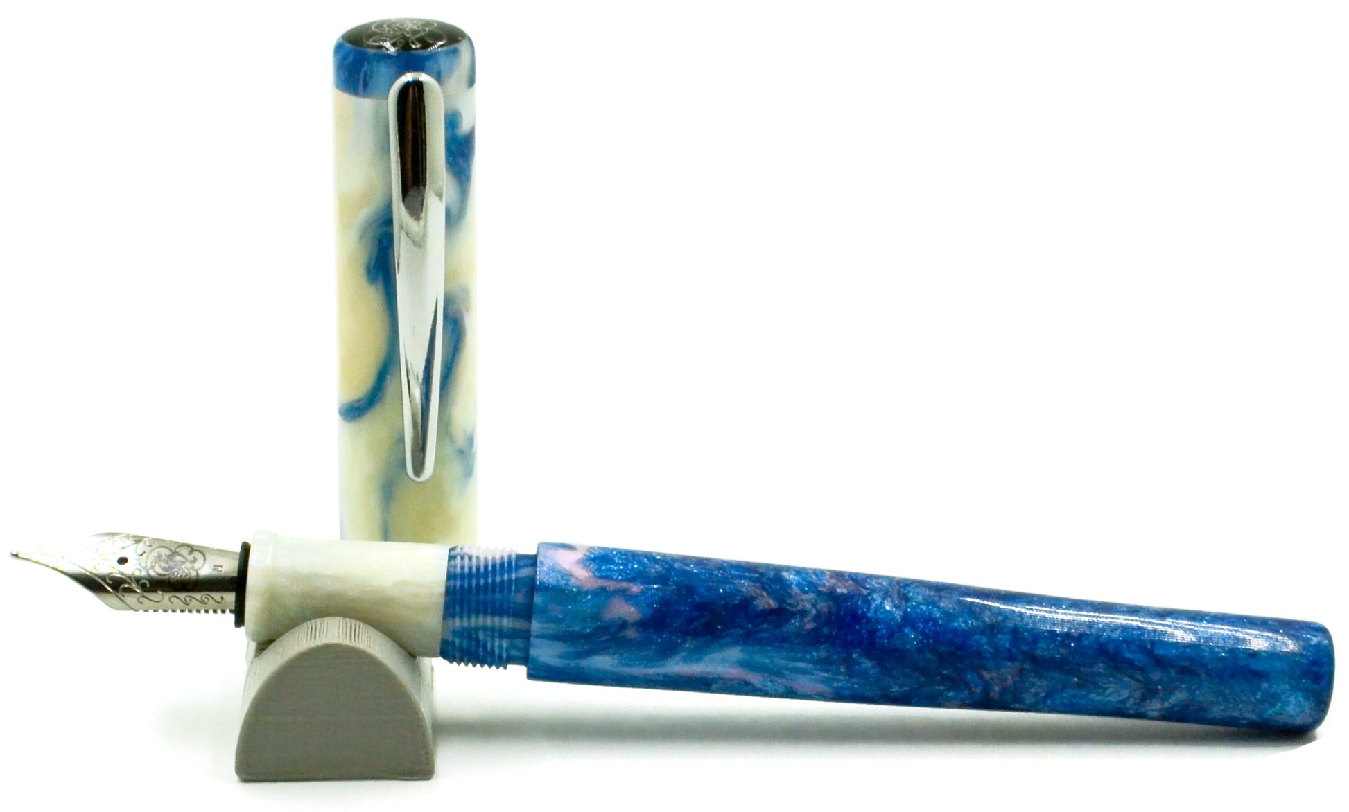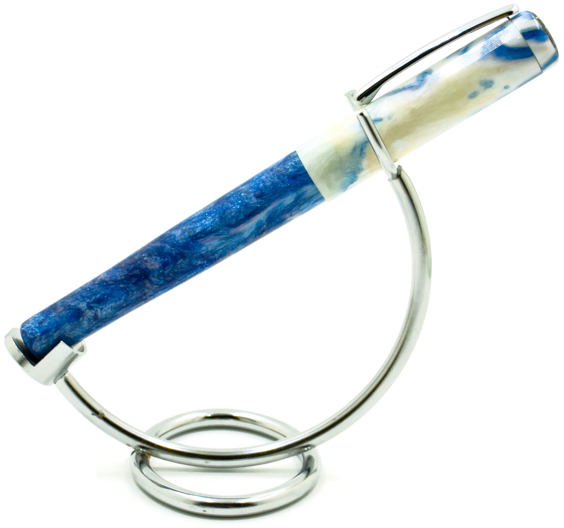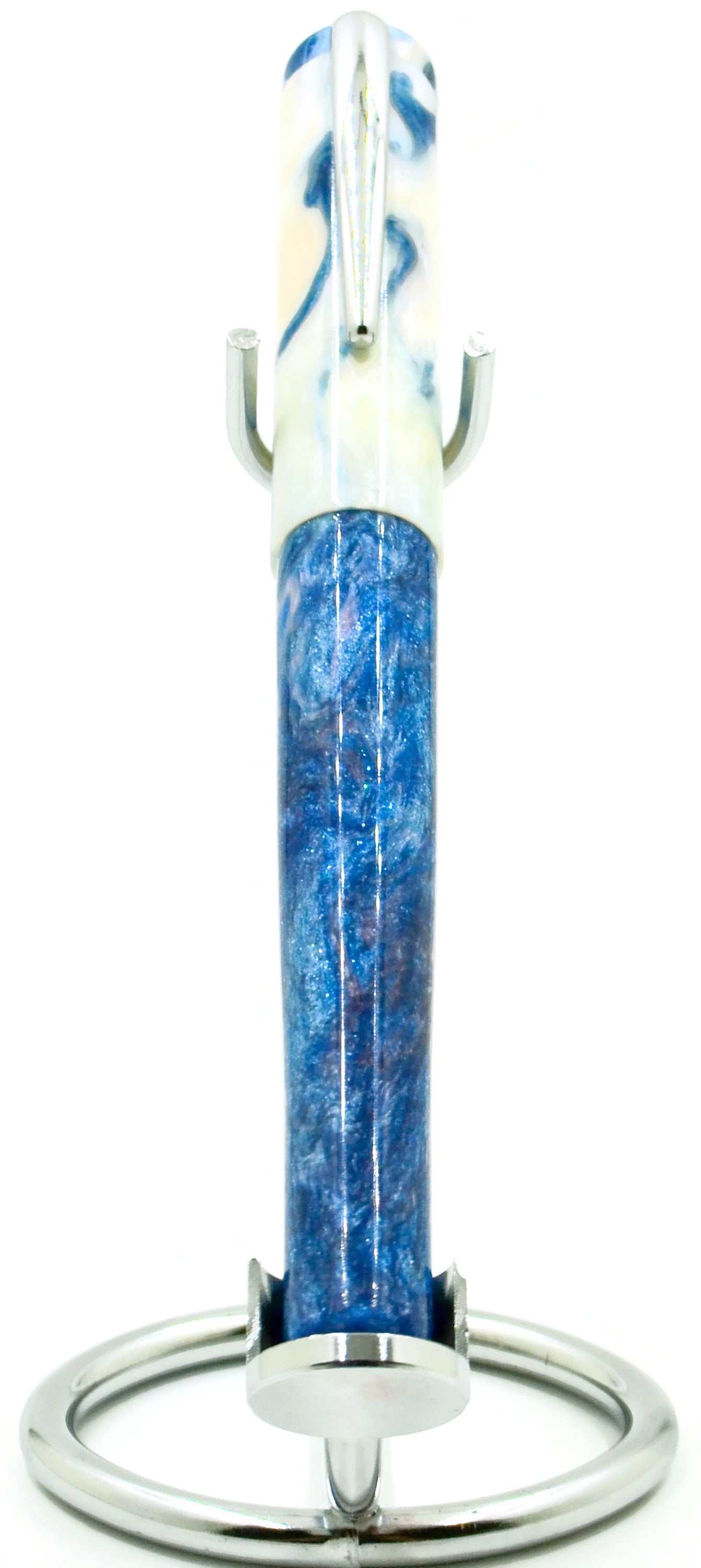 We present "Blue Skies" ... very deep blue swirled with pillow-'y' white ... reminds me of a southern summer sky. The depth and pureness of the blue is stunning. The pen is shown with an optional blue plated nib, which matches beautifully on the pen.