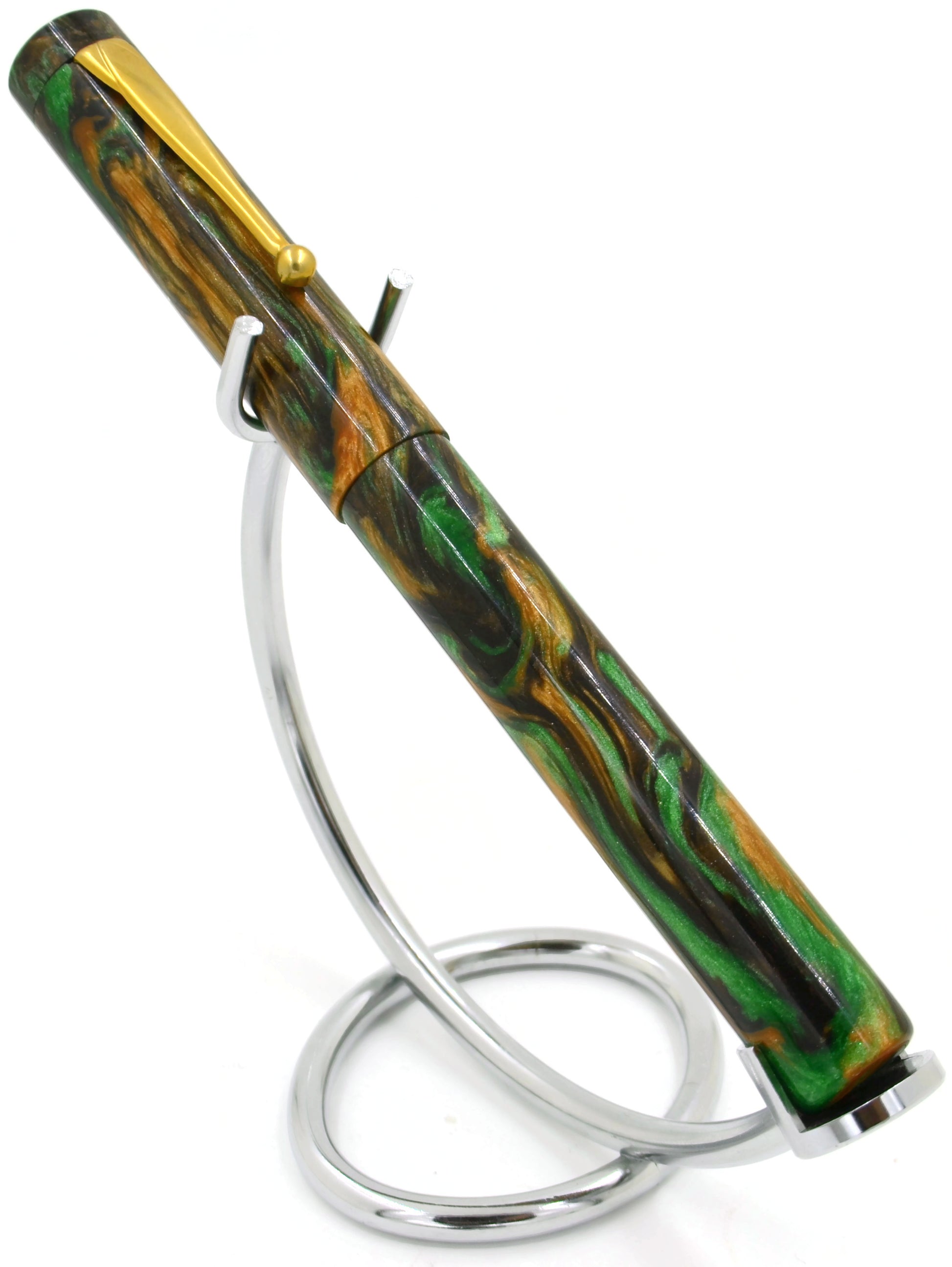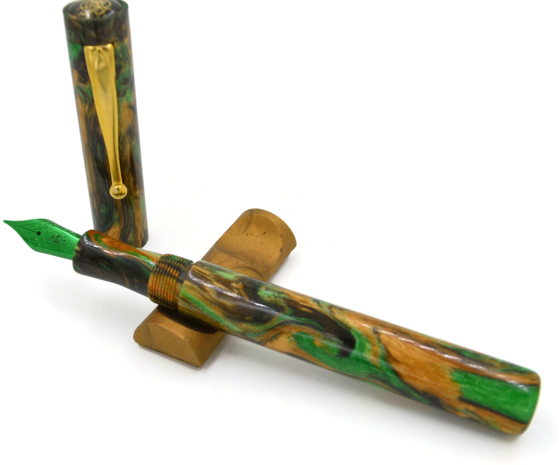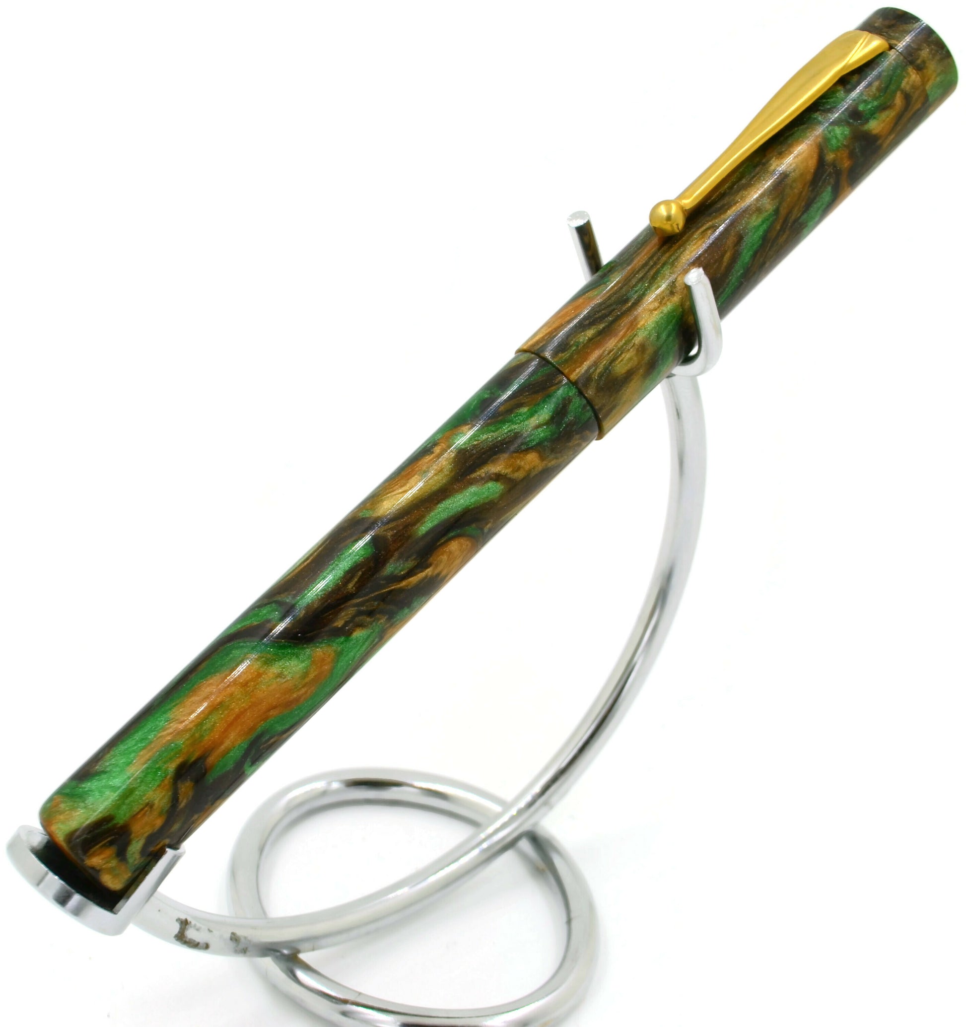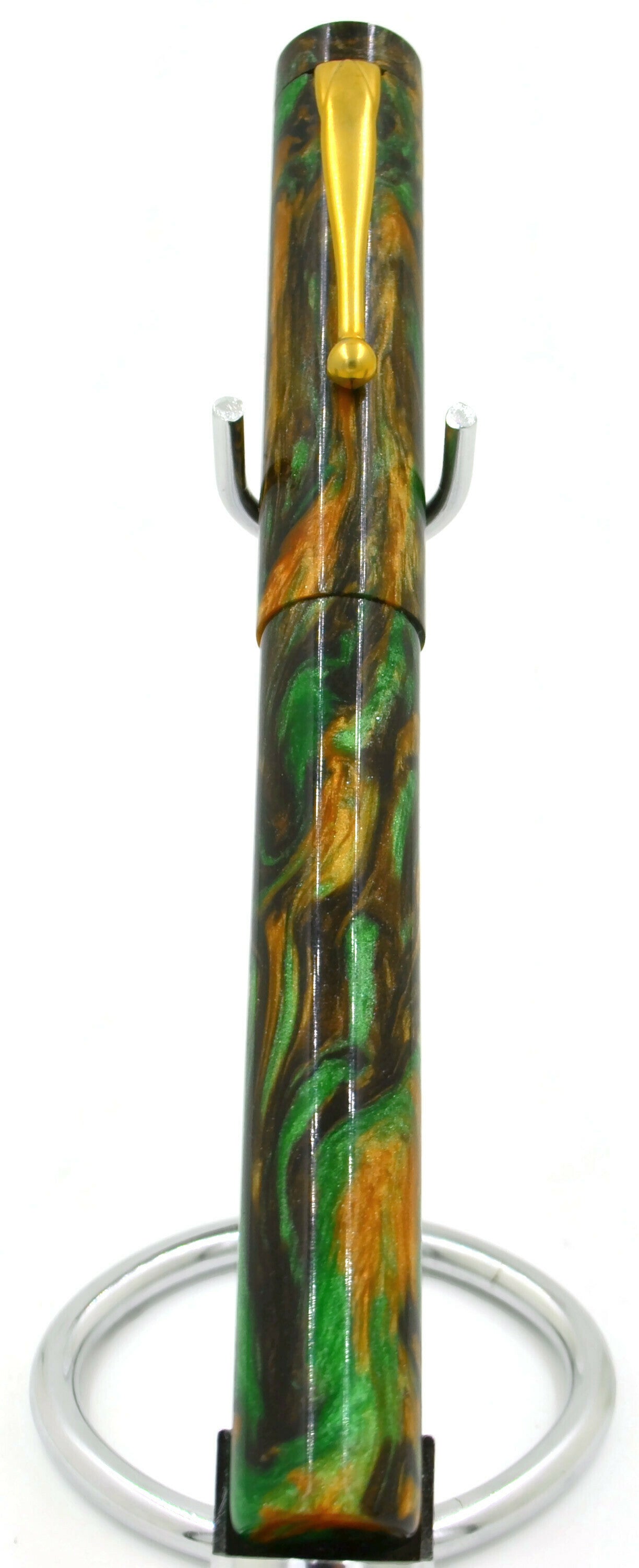 Green, gold, and black.. reminds me of the fighting Irish. Beautiful pen done in our simplest form. Straight bodied with a clip.