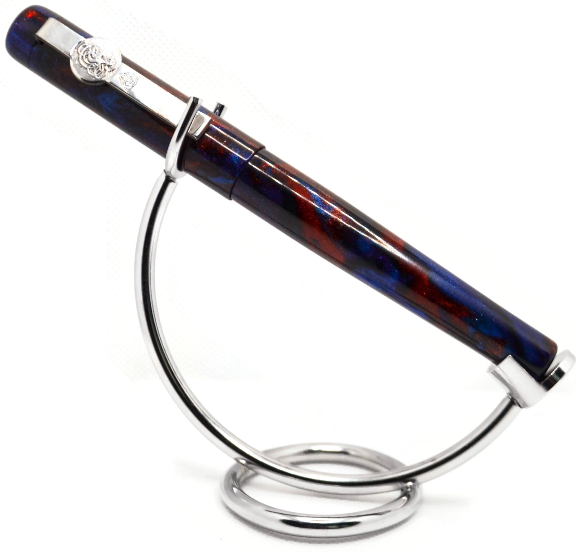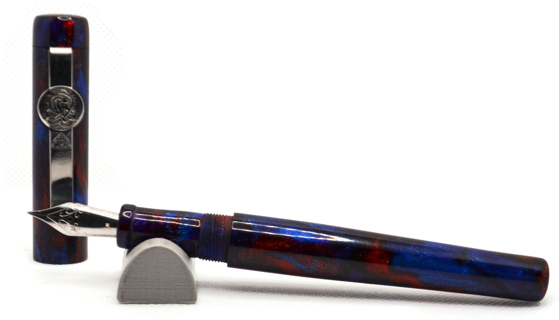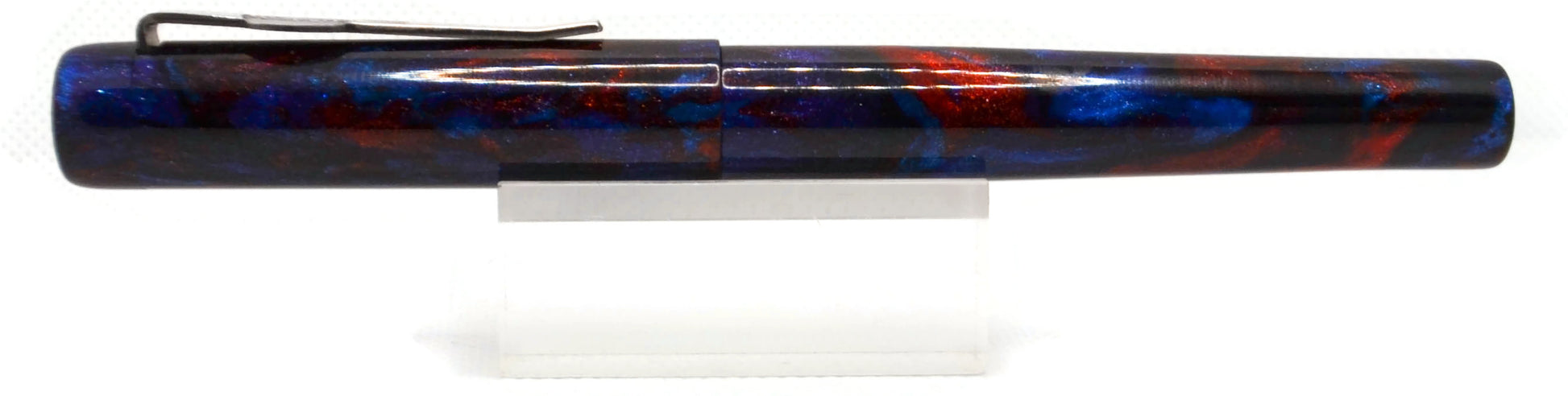 Beautiful diamondcast blank. Dark blue (in places almost black) and red swirl about.. giving the appearance of a nebula in space. Works equally well with a red or blue nib.