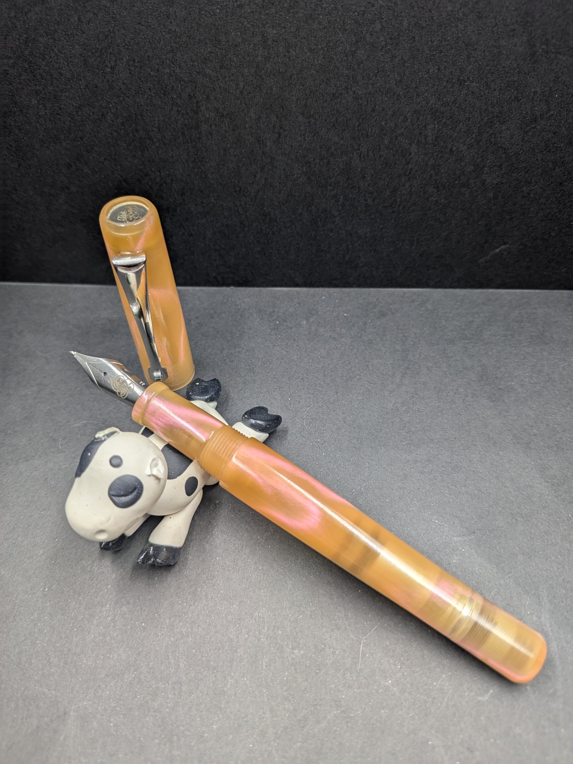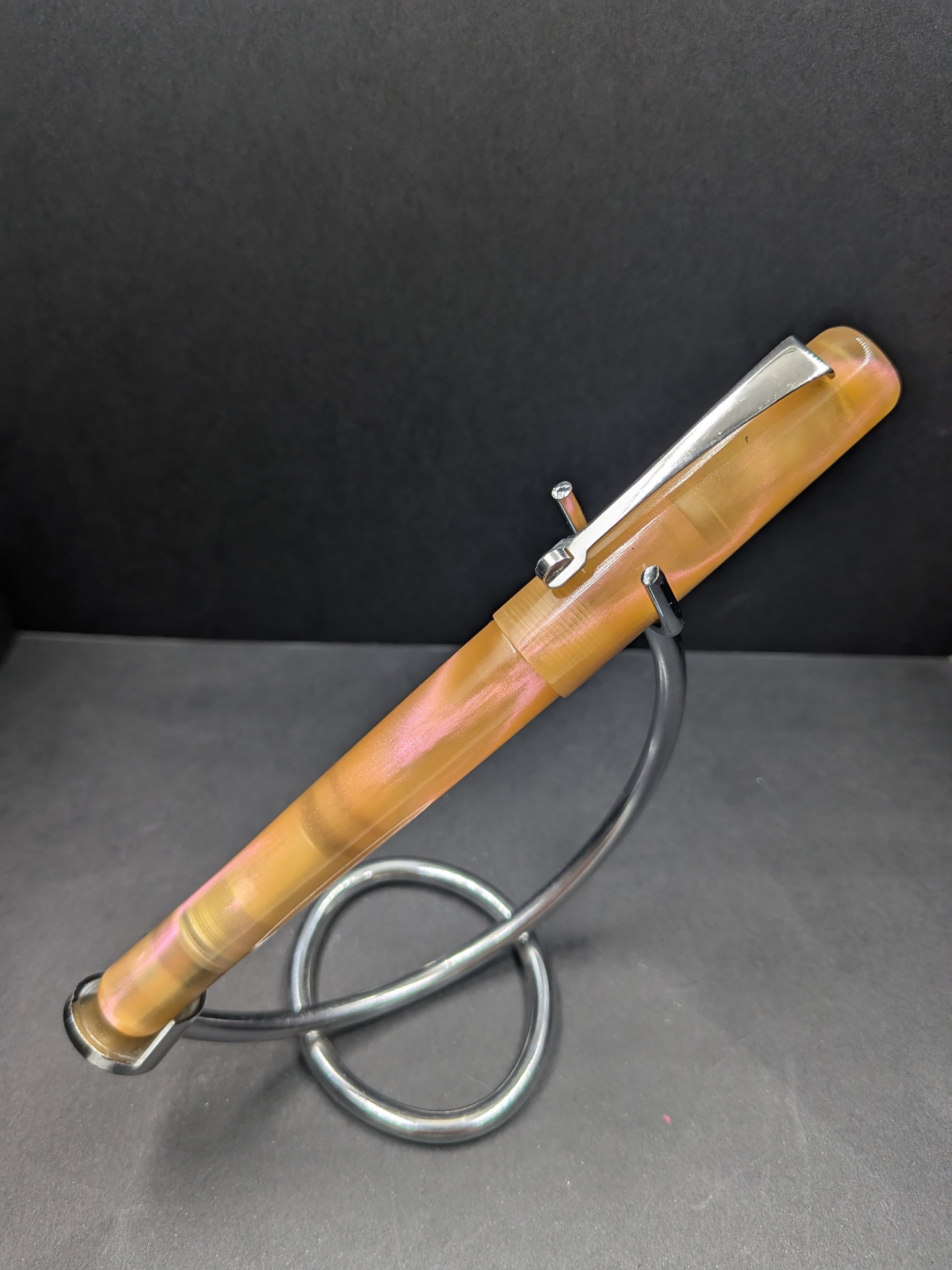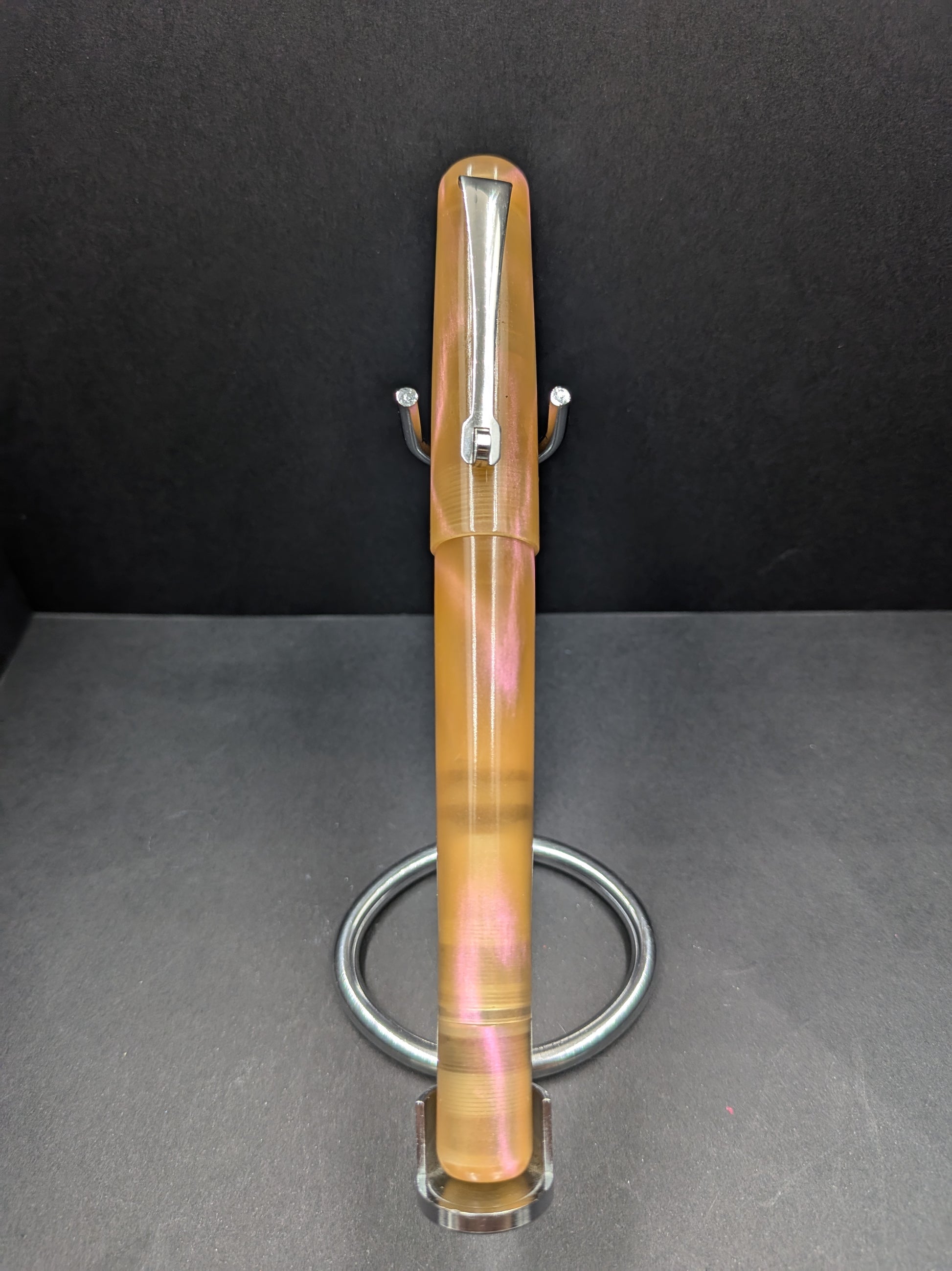 The F24 (PourlyControlled) Red Sky @ Dawn - Kõlbenfuller pen dazzles with a unique lightning pattern swirling through its peach/pink resin, making each piece a stunning work of functional art. Its sleek F pen shape is designed for comfort, fitting perfectly in your hand to make every writing session a joy. The convenient piston filler ensures smooth, uninterrupted ink flow, so your creativity can strike at any moment. Topped with a shiny rhodium roller clip, this pen blends eye-catching style with everyday practicality, delivering a playful and electrifying writing experience that sparks inspiration every time you use it.