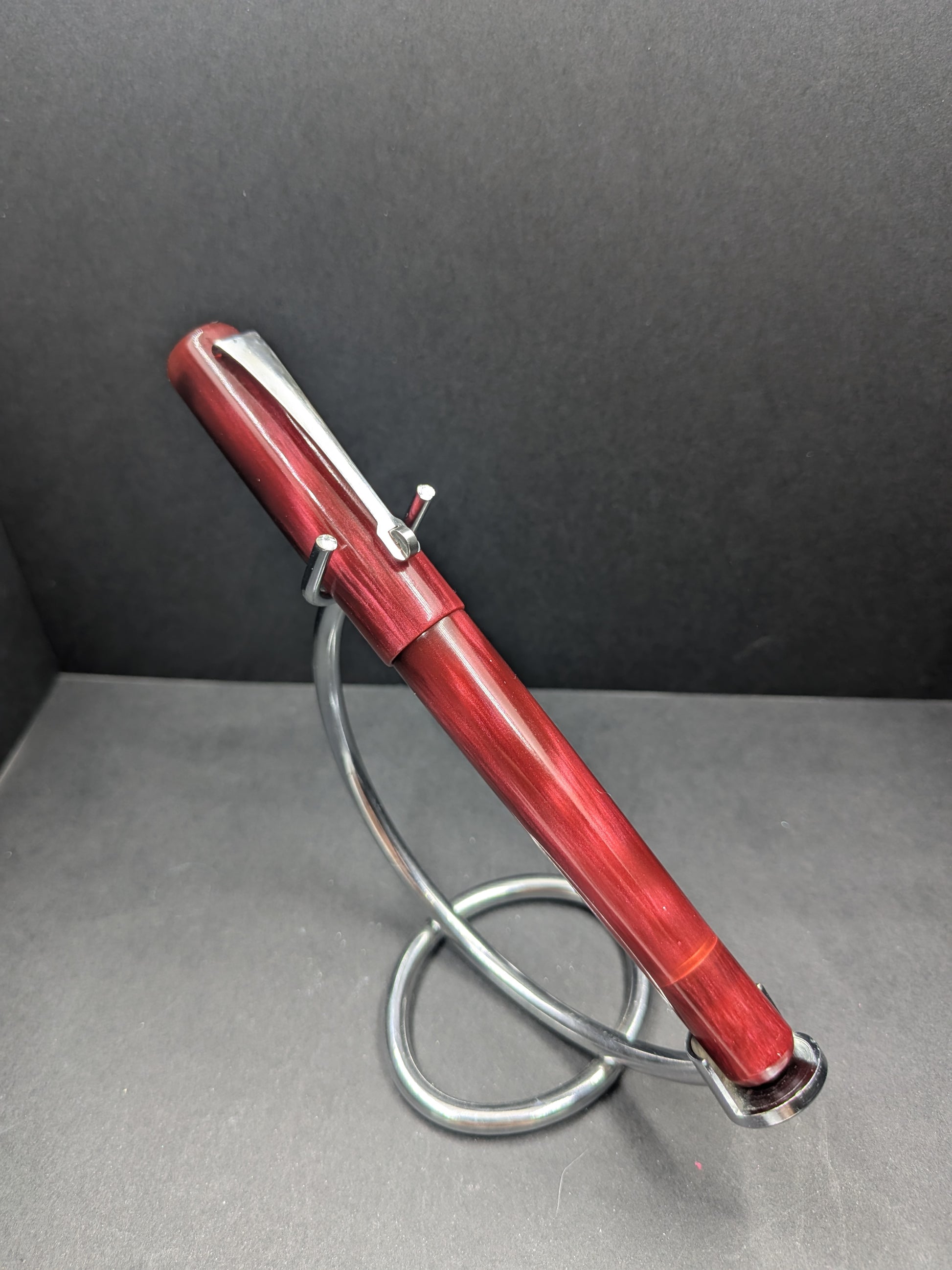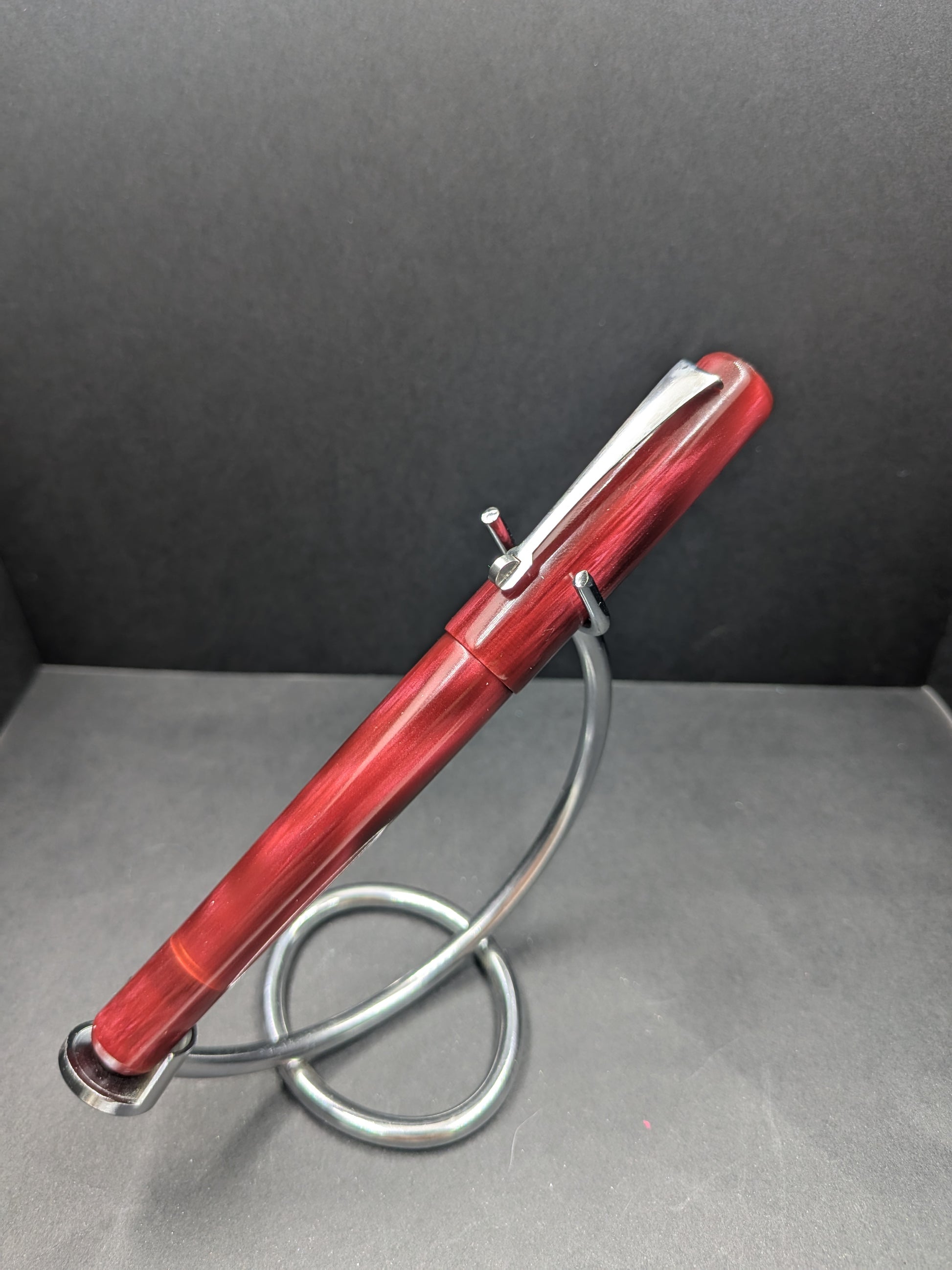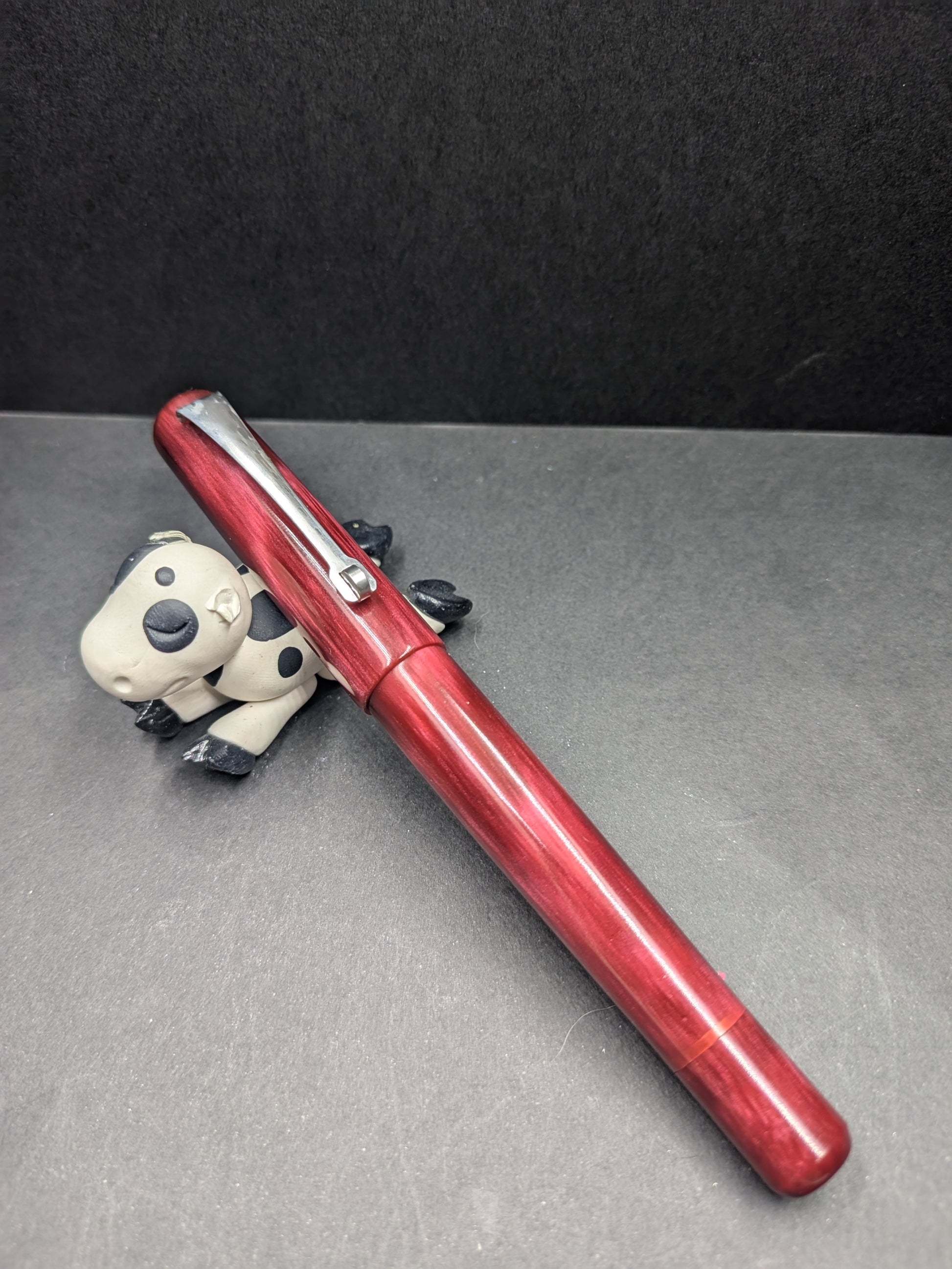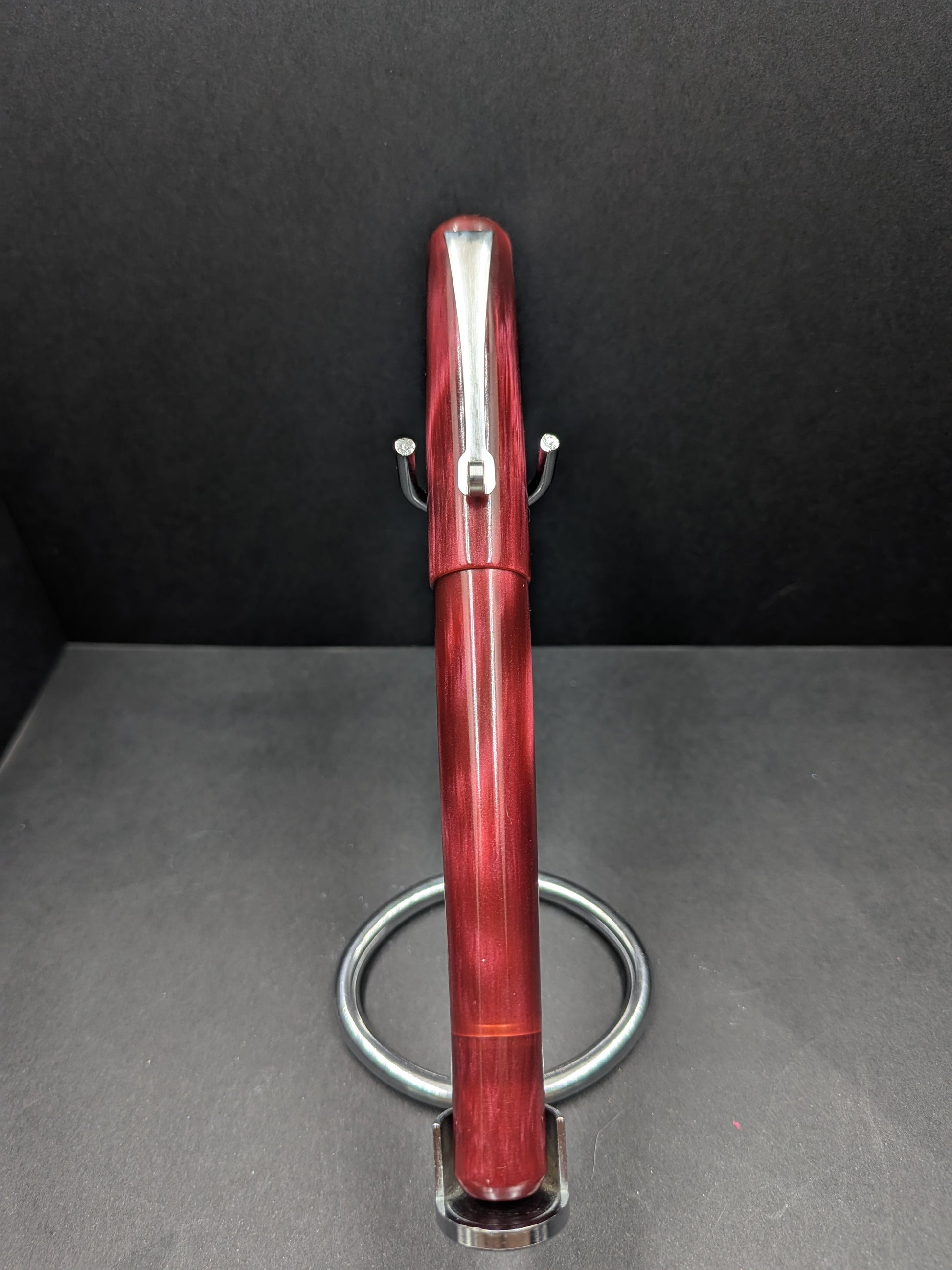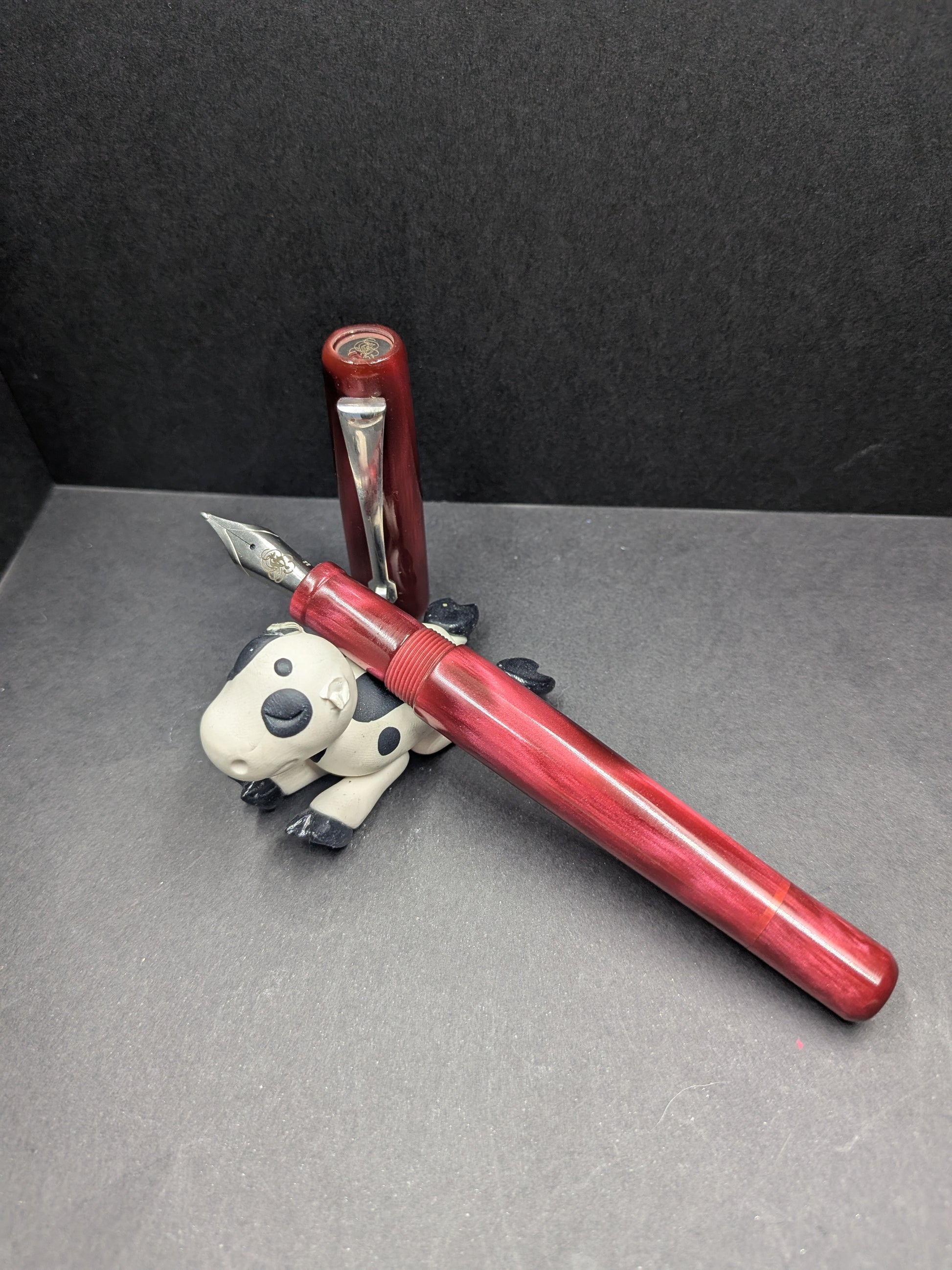The F24 (PourlyControlled) Red Sky @ Dawn - Kõlbenfuller pen dazzles with a unique lightning pattern swirling through its rich red resin, making each piece a stunning work of functional art. Its sleek F pen shape is designed for comfort, fitting perfectly in your hand to make every writing session a joy. The convenient piston filler ensures smooth, uninterrupted ink flow, so your creativity can strike at any moment. Topped with a shiny rhodium roller clip, this pen blends eye-catching style with everyday practicality, delivering a playful and electrifying writing experience that sparks inspiration every time you use it.