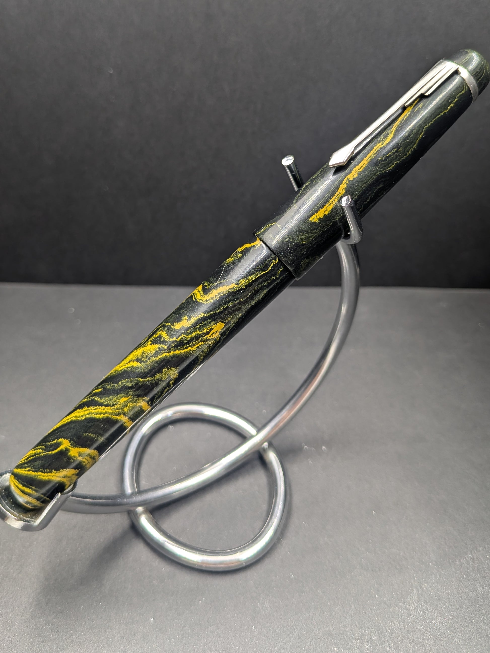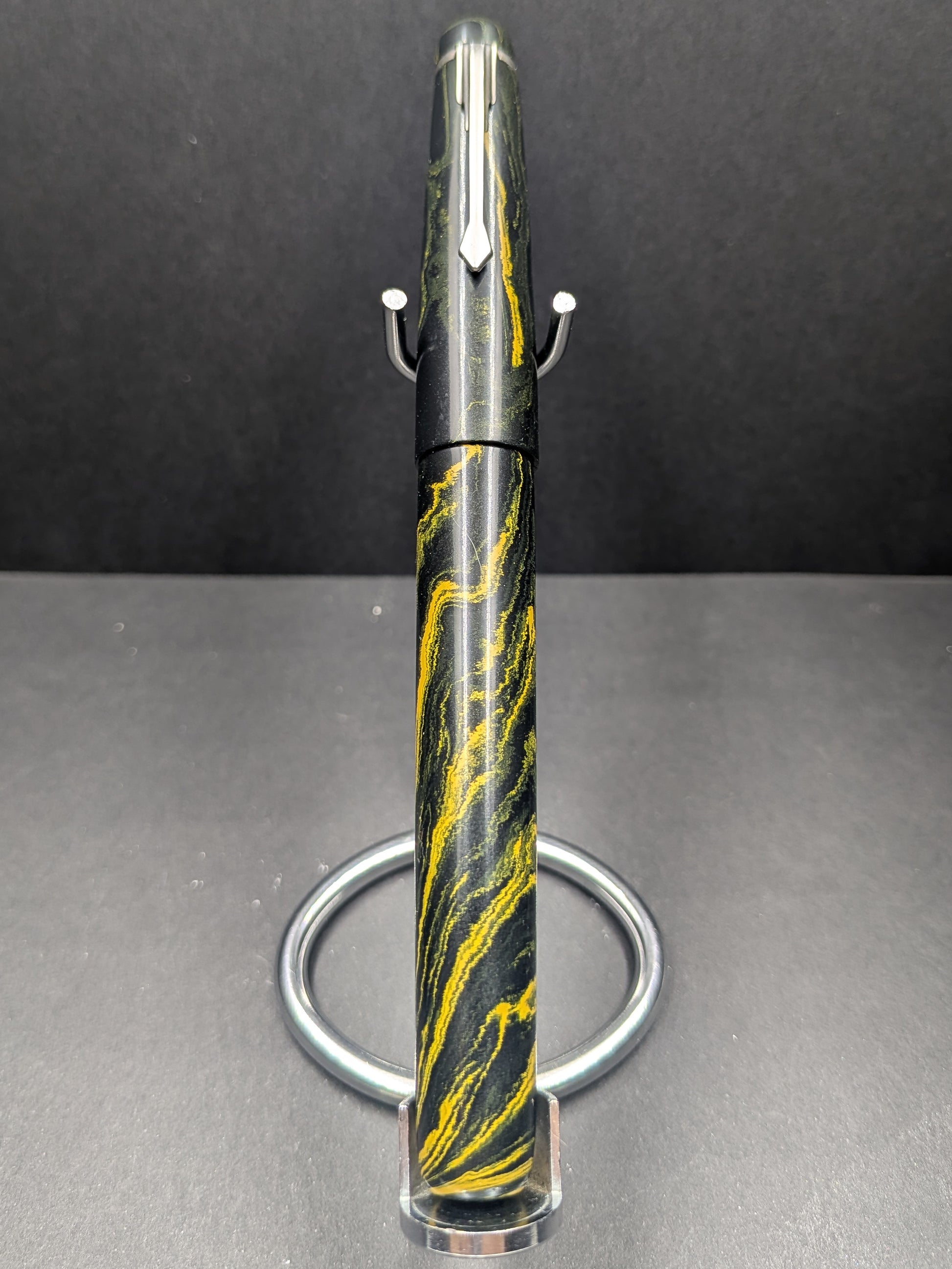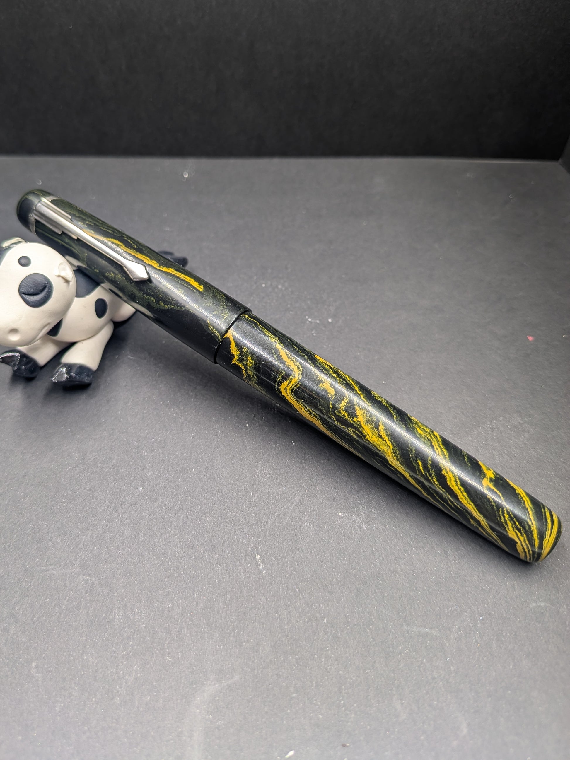 Behold the F24 Americana—a pen that marries timeless elegance with genuine craftsmanship! Handcrafted from American-made ebonite, this beauty keeps your hand happy during marathon writing sessions, staying warm and grip-friendly even when things get a little sweaty. Built tough to laugh off the occasional tumble, ebonite resists the dents and cracks that plague lesser materials. With a generous 15.5mm barrel and a meaty grip section, this pen feels substantial and satisfying in your hand. Crave a little heft? The deep, secure postable cap delivers that satisfying back-weight writers love. Topped with a rare rhodium-plated vintage clip—a treasure we're holding onto while supplies last!