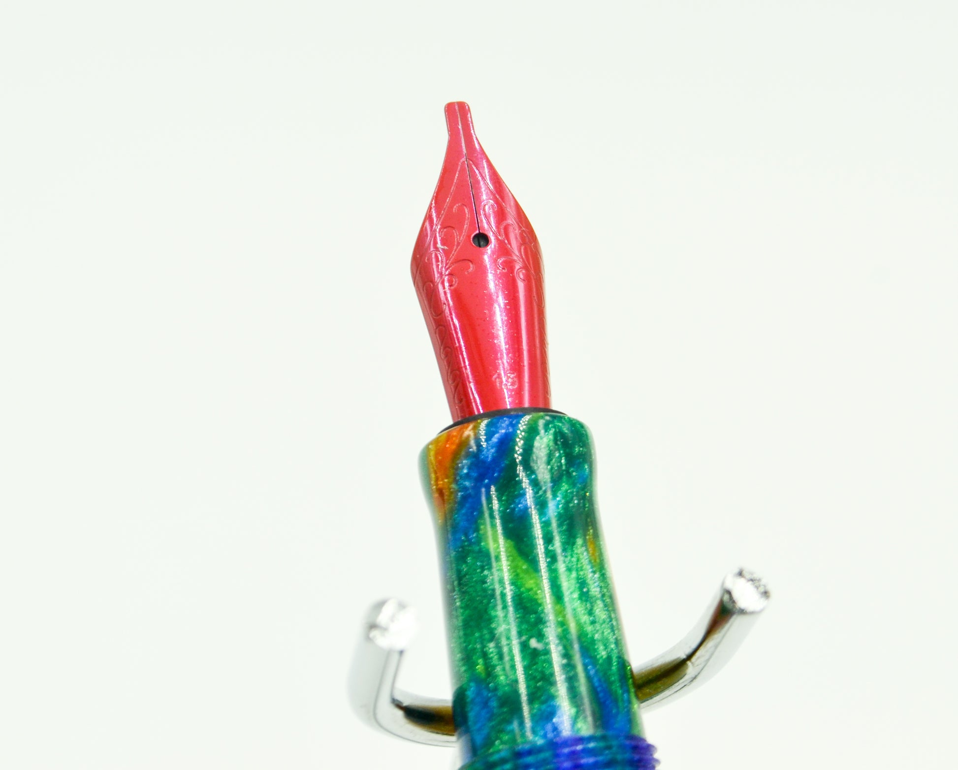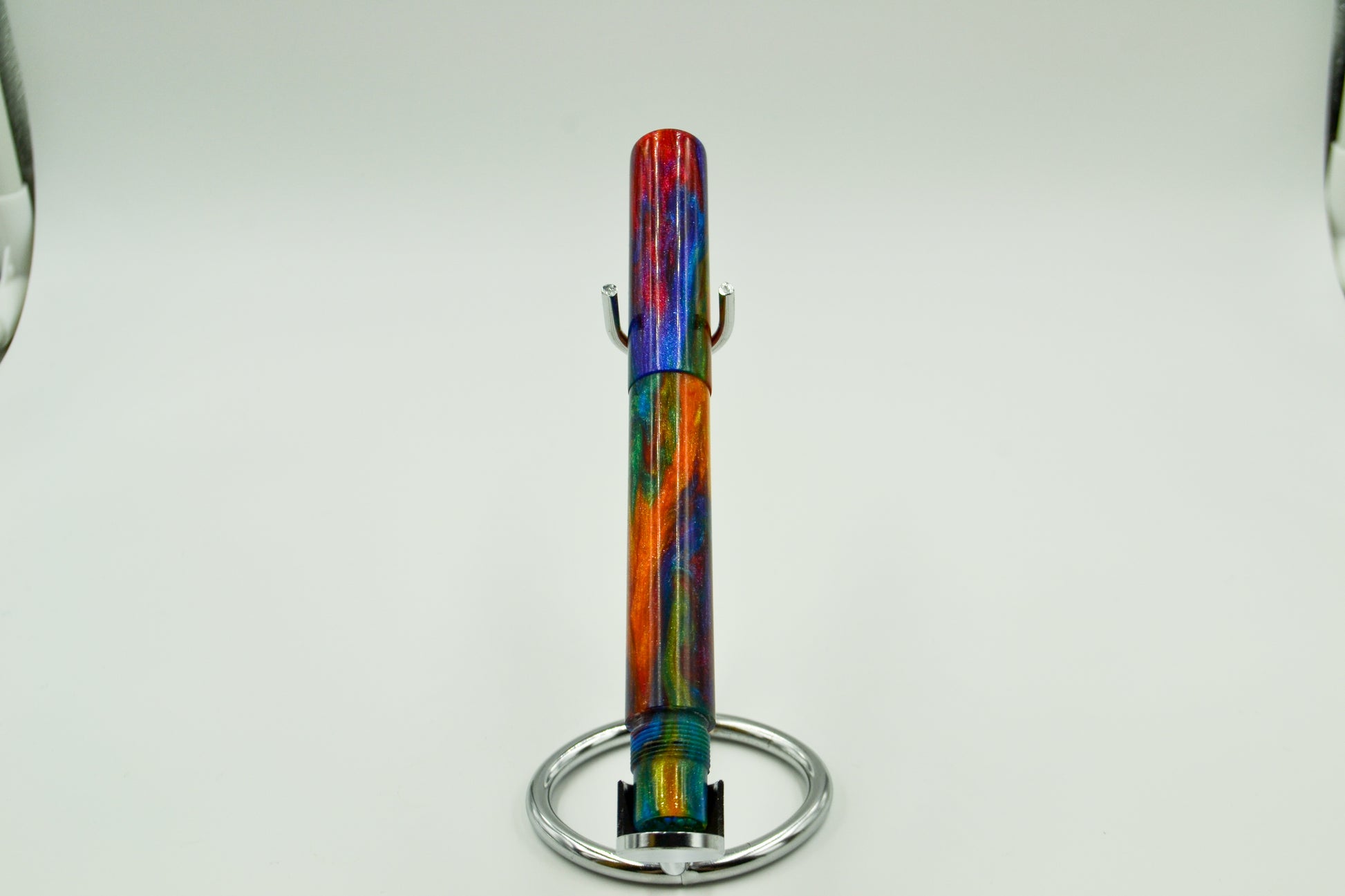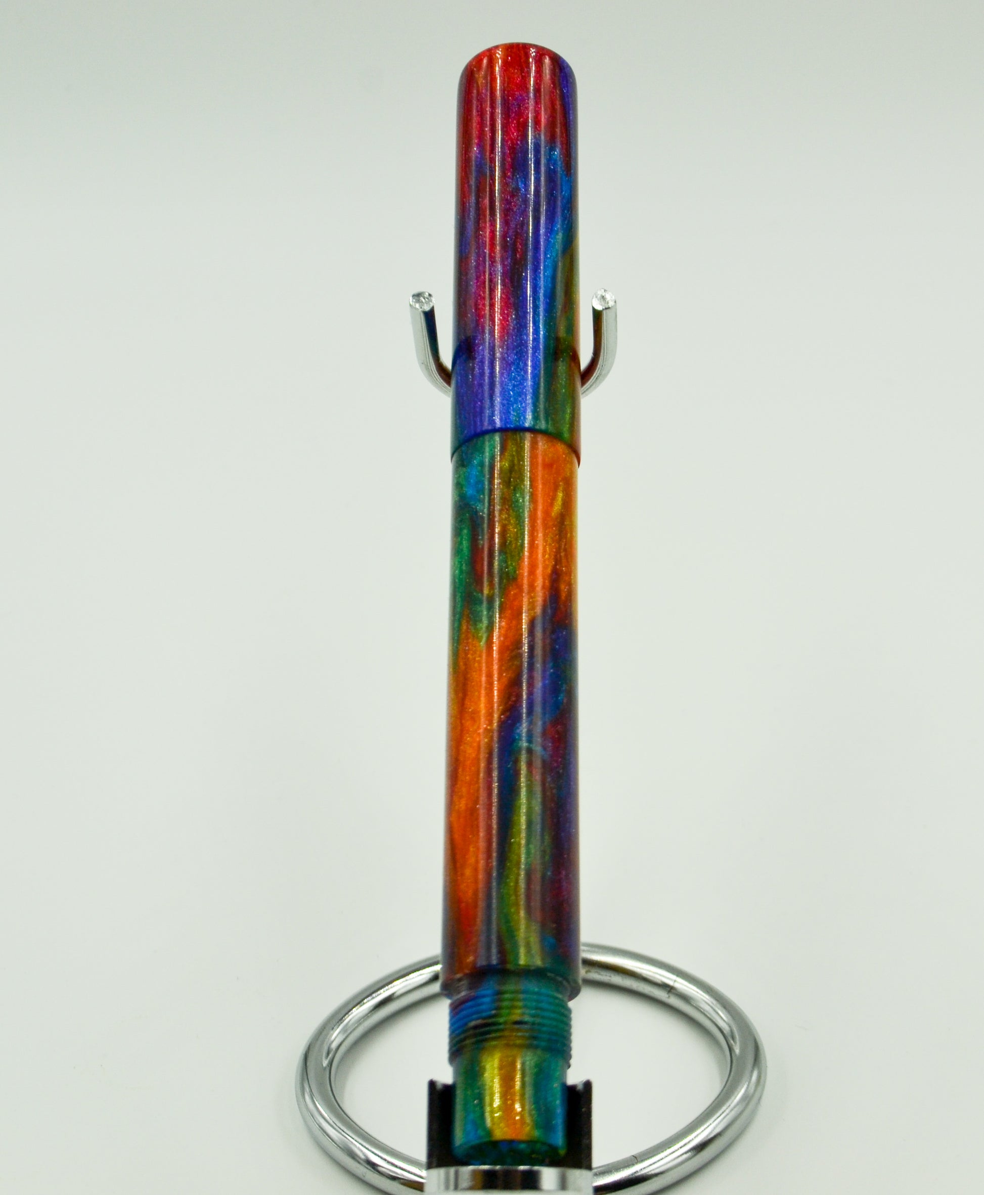 From our friends at Diamond Cast, this is their Oil Slick mix and like all Diamond Cast material, it features diamond dust in the resin; When the light hits it, the pen lights up! This is the first Diamond Cast resin we ever worked with. Debuted at the DC Pen Show in 2018, it was a huge hit from day 1. Simple design, secure posting by threading on the finial. Features a rainbow dragon scale medallion on the finial. This is the first in a series of pens featuring the mythology of the Norse.