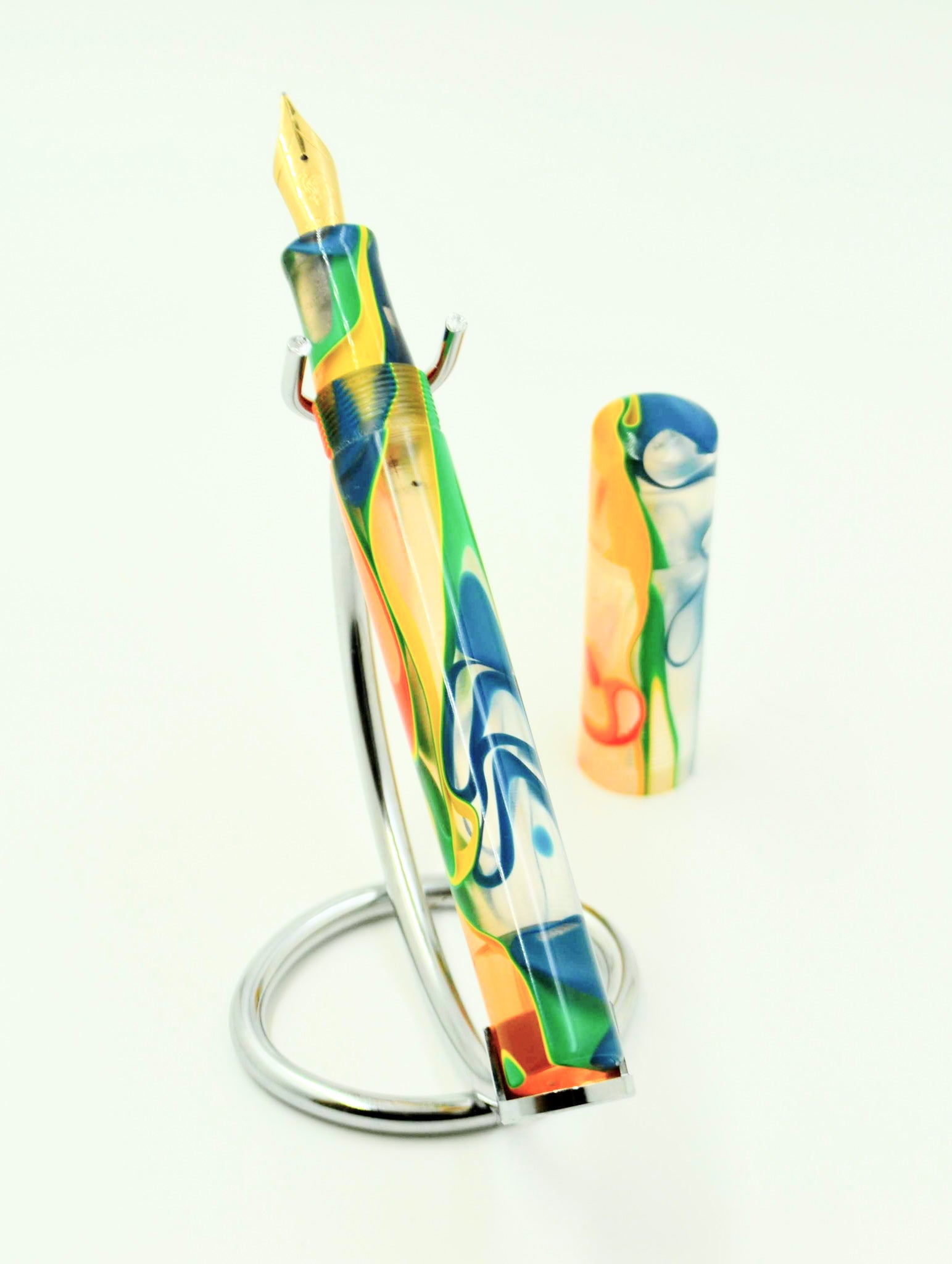 This is our OVERSIZE evancio pen. 16mm barrel, 18mmcap, 14mm section and deeply postable. The deep posting prevents the pen from being unbalanced when writing. This pen uses a blank called "Funhouse". Features primary colors in clear resin.