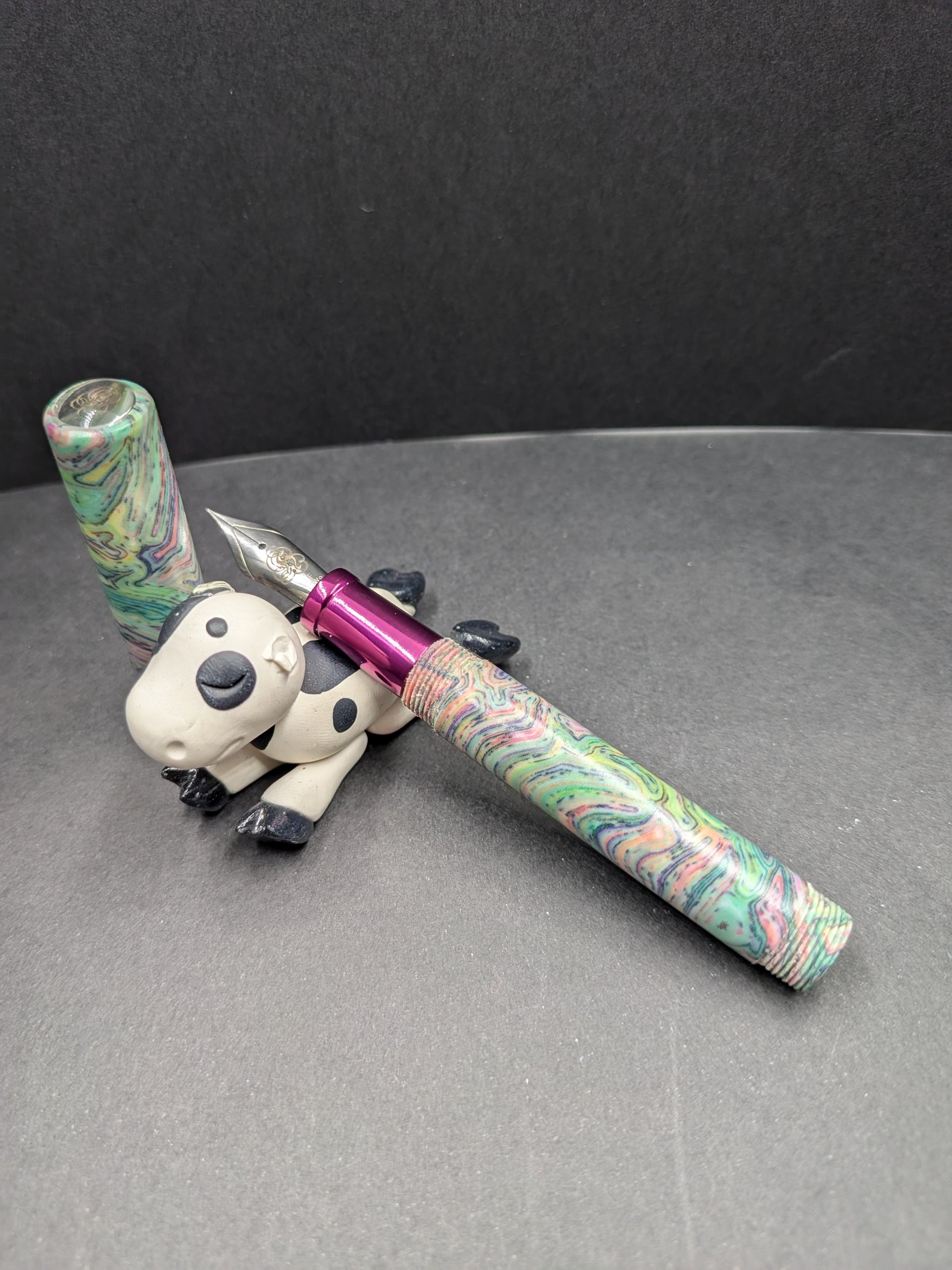 The Northern Lights pen dazzles with a stunning swirl of mint green, white, pink, and black that mirrors the sparkling city lights at dusk in a cozy winter town. Its unique color blend captures the magic of a chilly evening filled with glowing windows and twinkling streets. This pen is available in limited quantities and won’t be produced again once the material runs out, making it a truly special and playful treasure for your collection. Carry a little winter wonder wherever you go with this charming, one-of-a-kind writing companion.