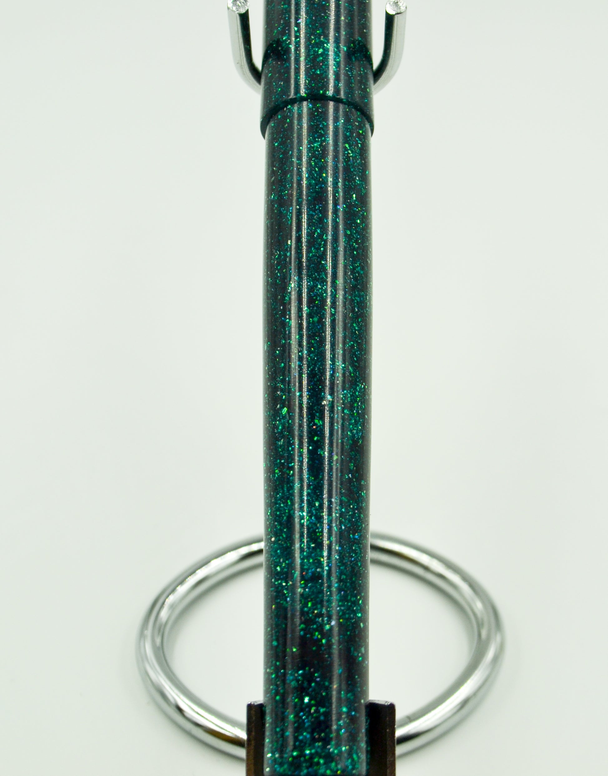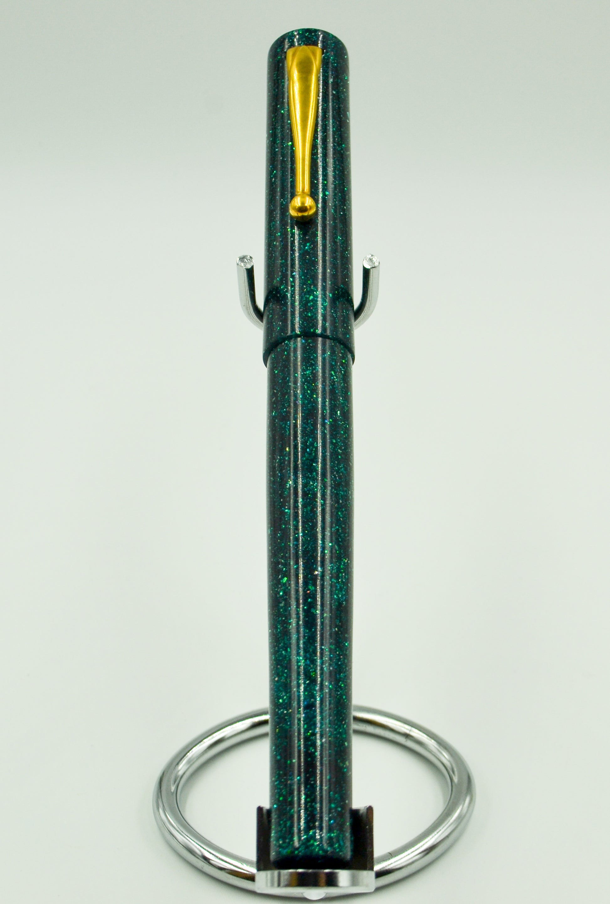 Beautiful material on this pen, Pictures do not do it justice. From our friends at DiamondCast, this dark teal blank includes larger, multi-color sparkles. When the light hits it, the pen lights up! Simple gold clip is the only distraction from the beauty of the material. The pen fully posts.
