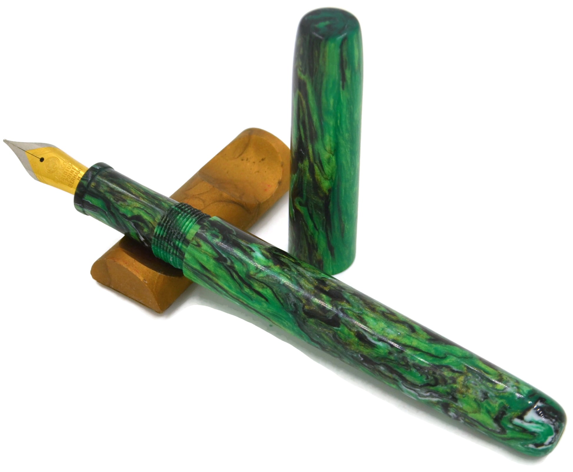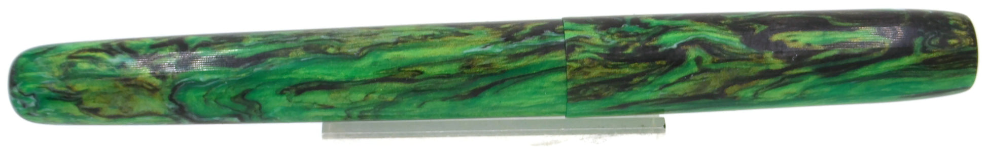 This is our basic Elementar using what I call the Green Seas resin. Hues of green with black and white flow within the body of the pen. Using one's imagination, is reminiscent of an algae bloom in the ocean.. or, one heavily laden with seaweed … We don't often use green in our pens, but this was too beautiful to let sit in stock.