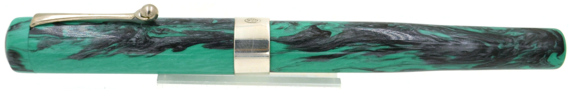 The pen is dressed with a stainless steel clip and nickel band on the cap. Overall length is a little shy of 6" capped. Body threads are 13mm and it has a diameter of about .600" at the body's widest. It gently tapers to the finial allowing the cap to be posted.