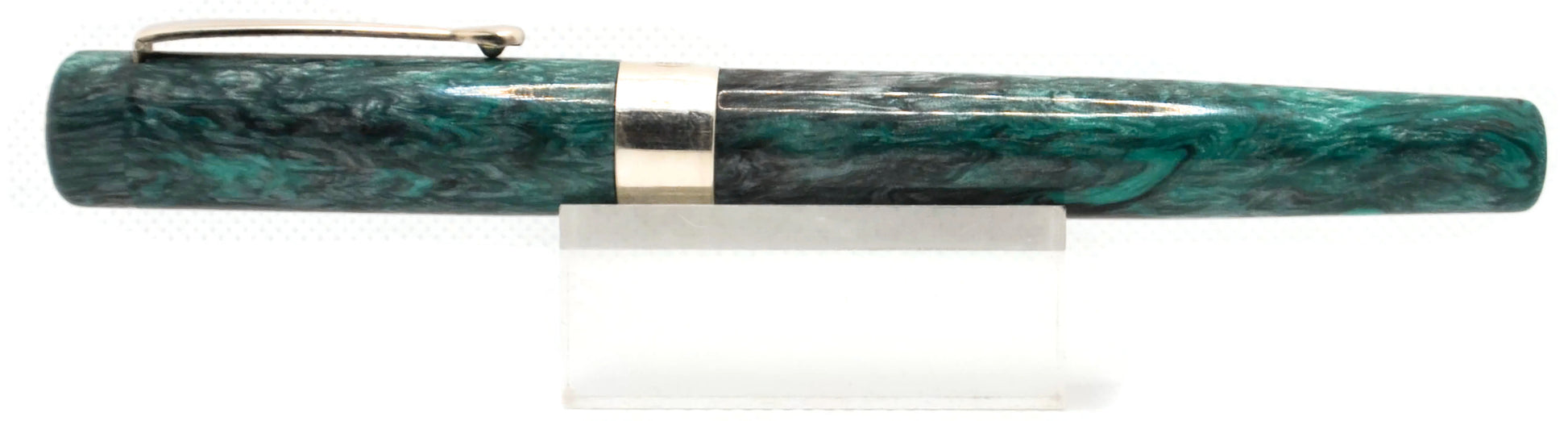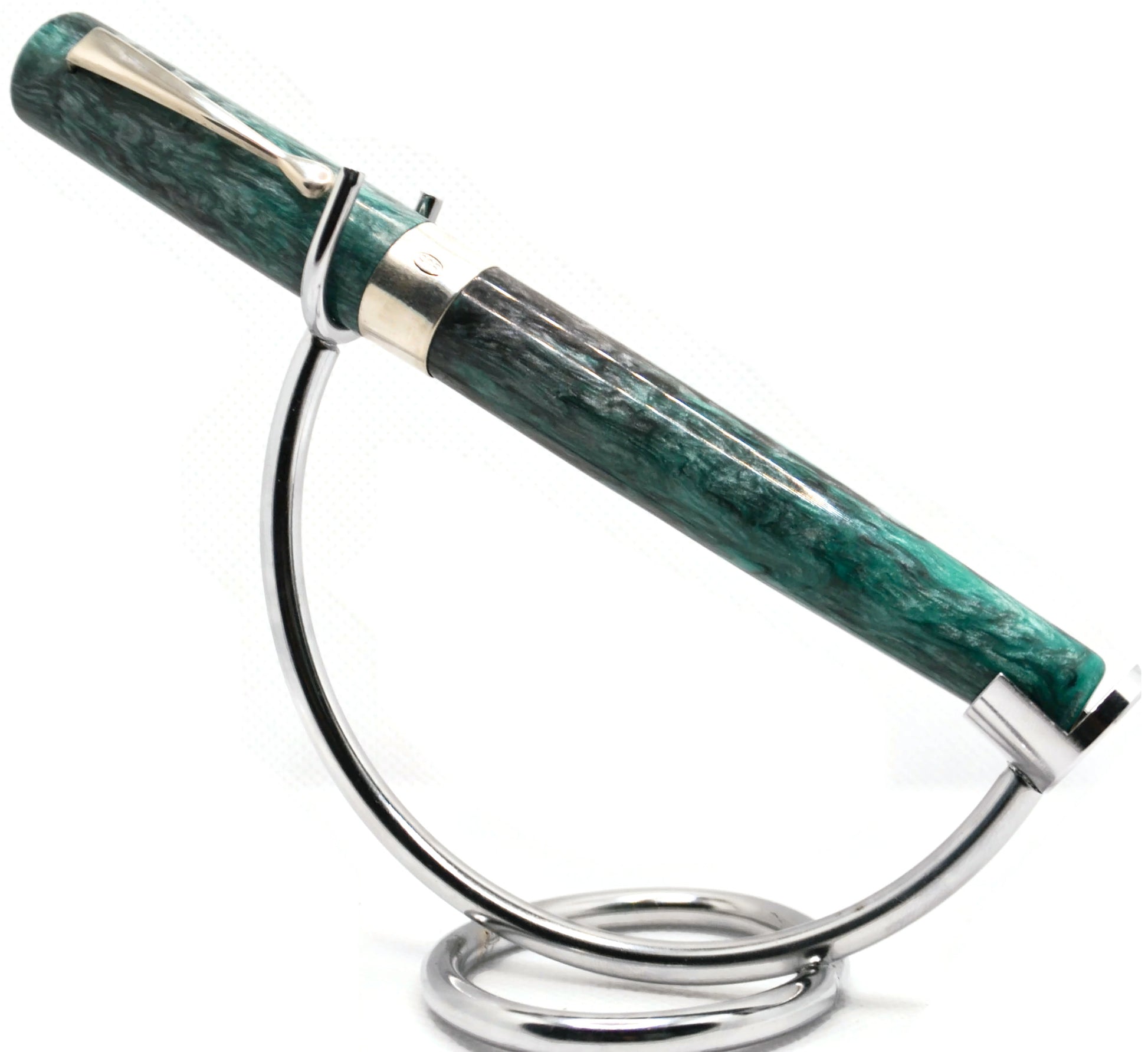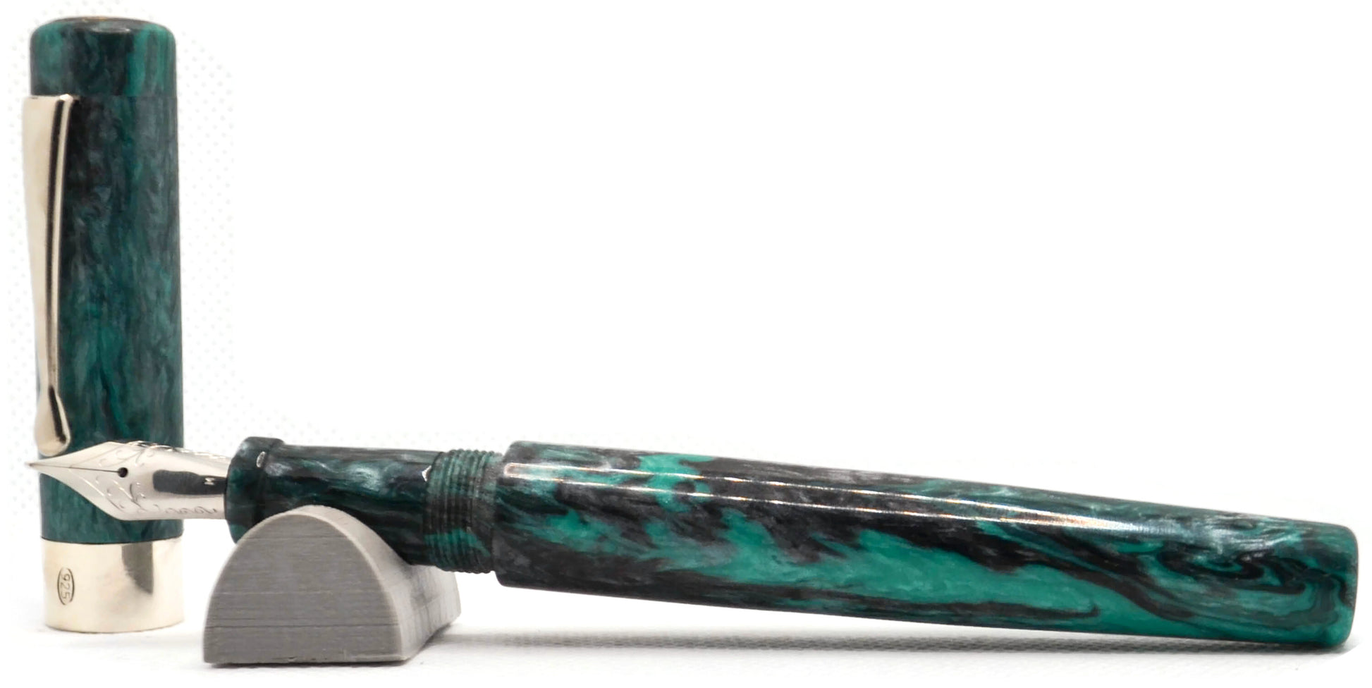 As shown, the pearlescent teal is the first to grab your attention., then bold swirls of antique silver inspire a feeling of nostalgia and gives it a retro appearance. Made from an incredibly strong and durable epoxy, it will resist scratches and will survive falls and a bit of clumsiness (trust me, my klutz self has tested it thoroughly). There is a wide variety of nib offerings.