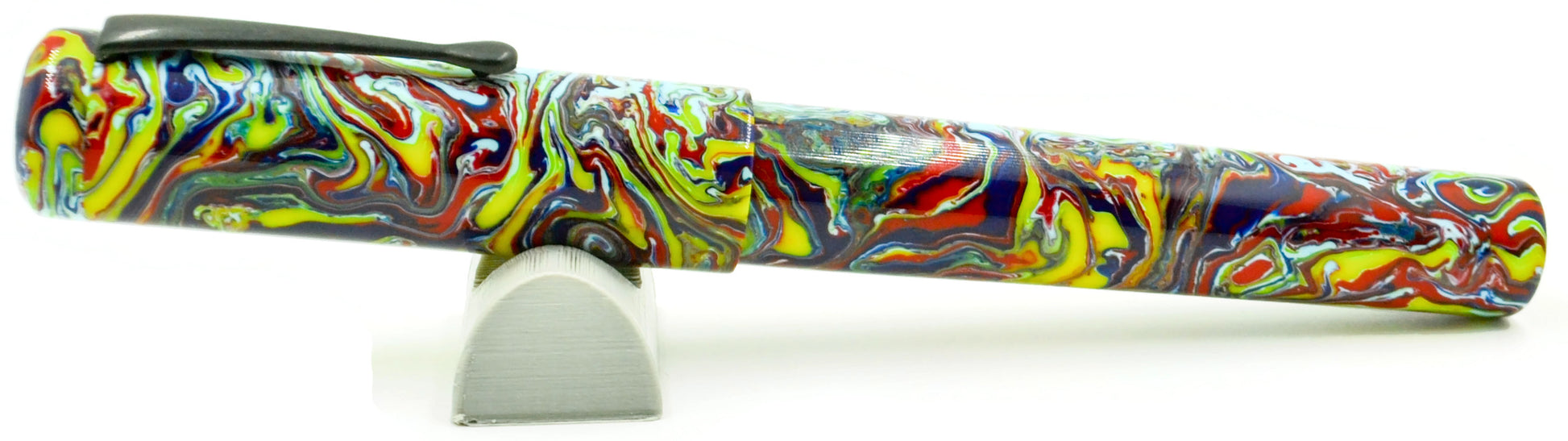 This is our OVERSIZE evancio pen. 16mm barrel, 18mmcap,14.5mm section and deeply postable. The deep posting prevents the pen from being unbalanced when writing. This pen uses a blank called "Autism Awarenss" from our friends at Divine Island Design. This is one of my favorite resins, the colors and pattern just speak to me. they do a great job keeping consistency in their blanks between pours. The pen features a black oxide clip.
