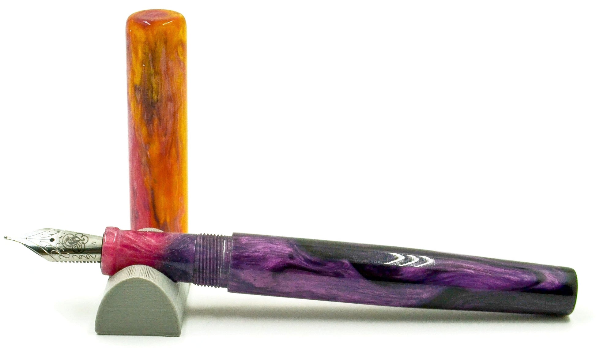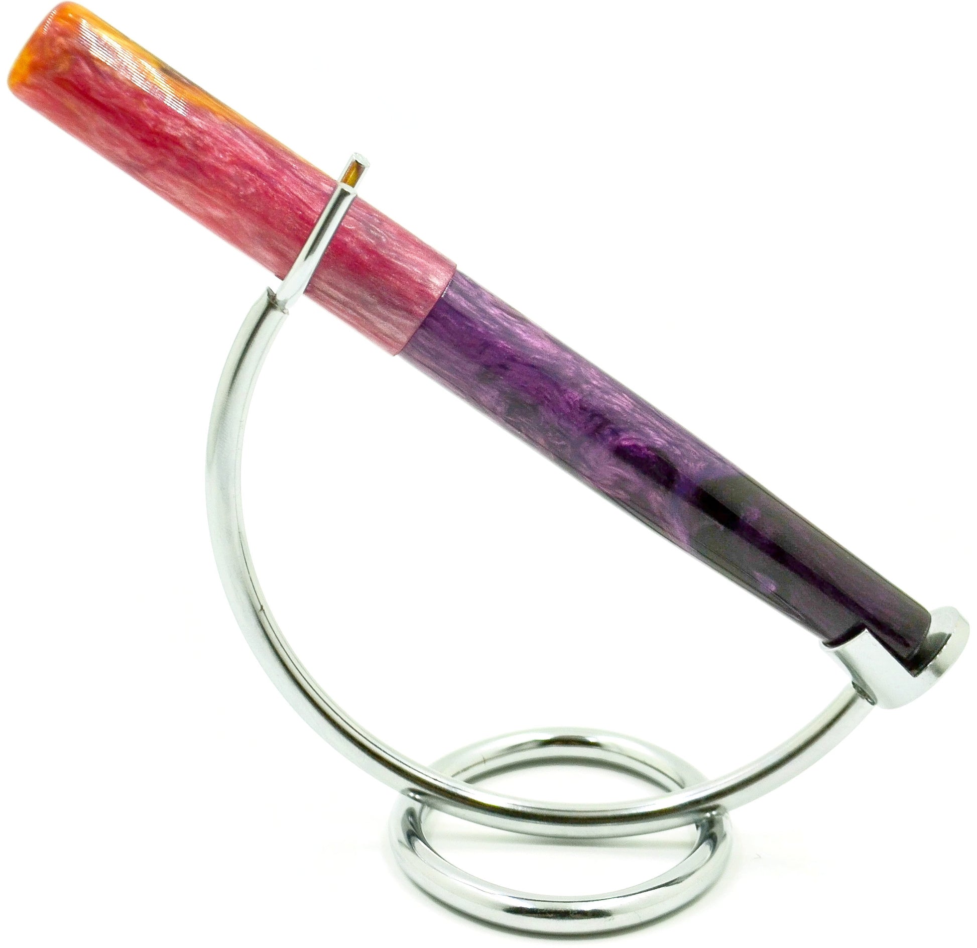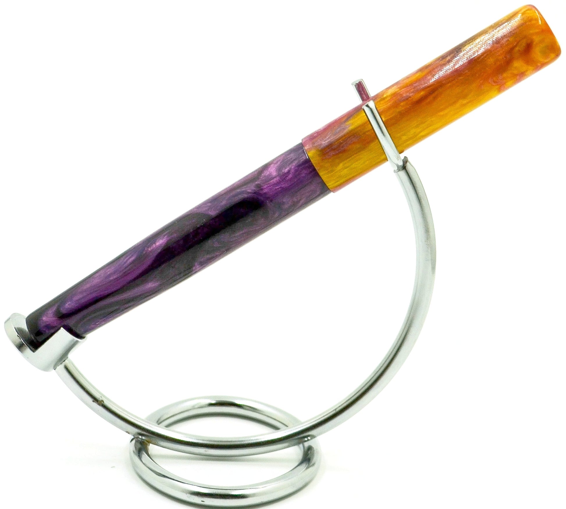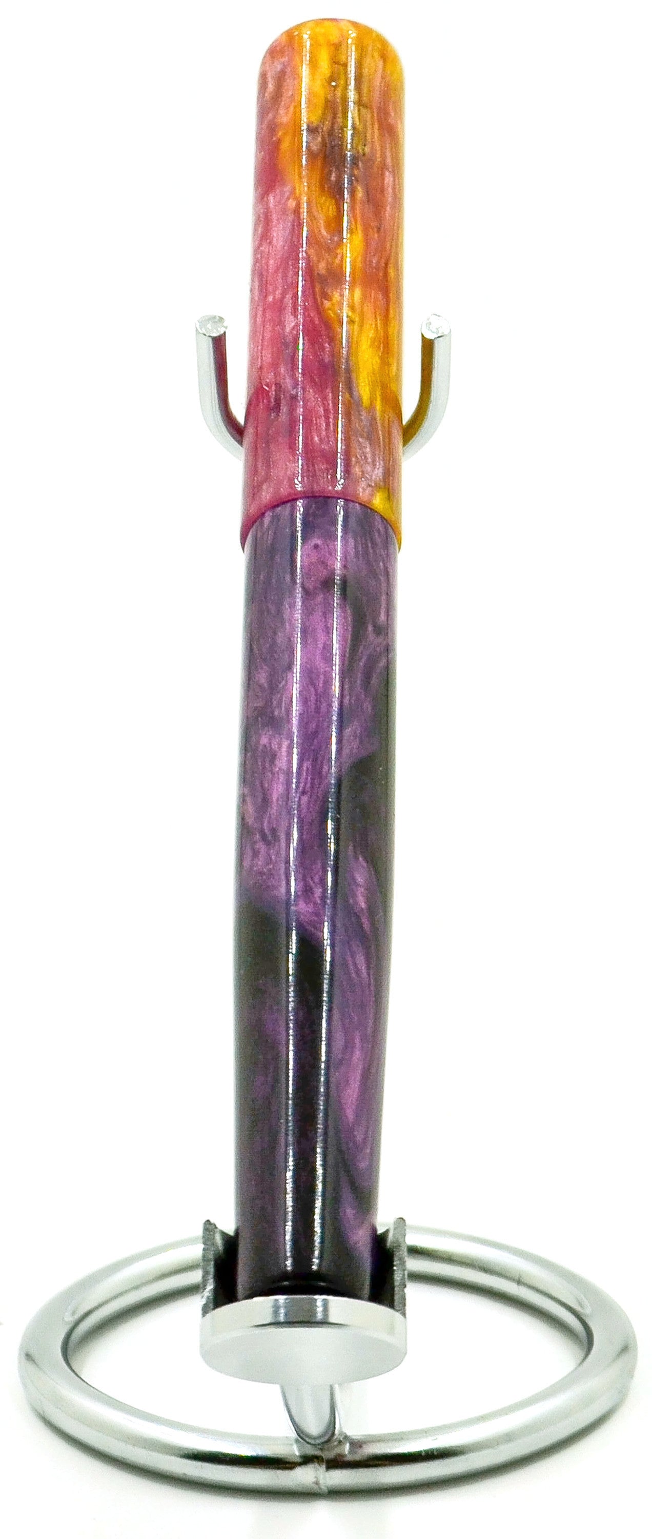 Inspired by a background image (see below the description for credit to the image) Elyce's daughter brought to her, we have her latest resin masterpiece... gradients of purple flow up to a brilliant yellow-orange, matching the background incredibly well... if you like purple, this is a pen for you.