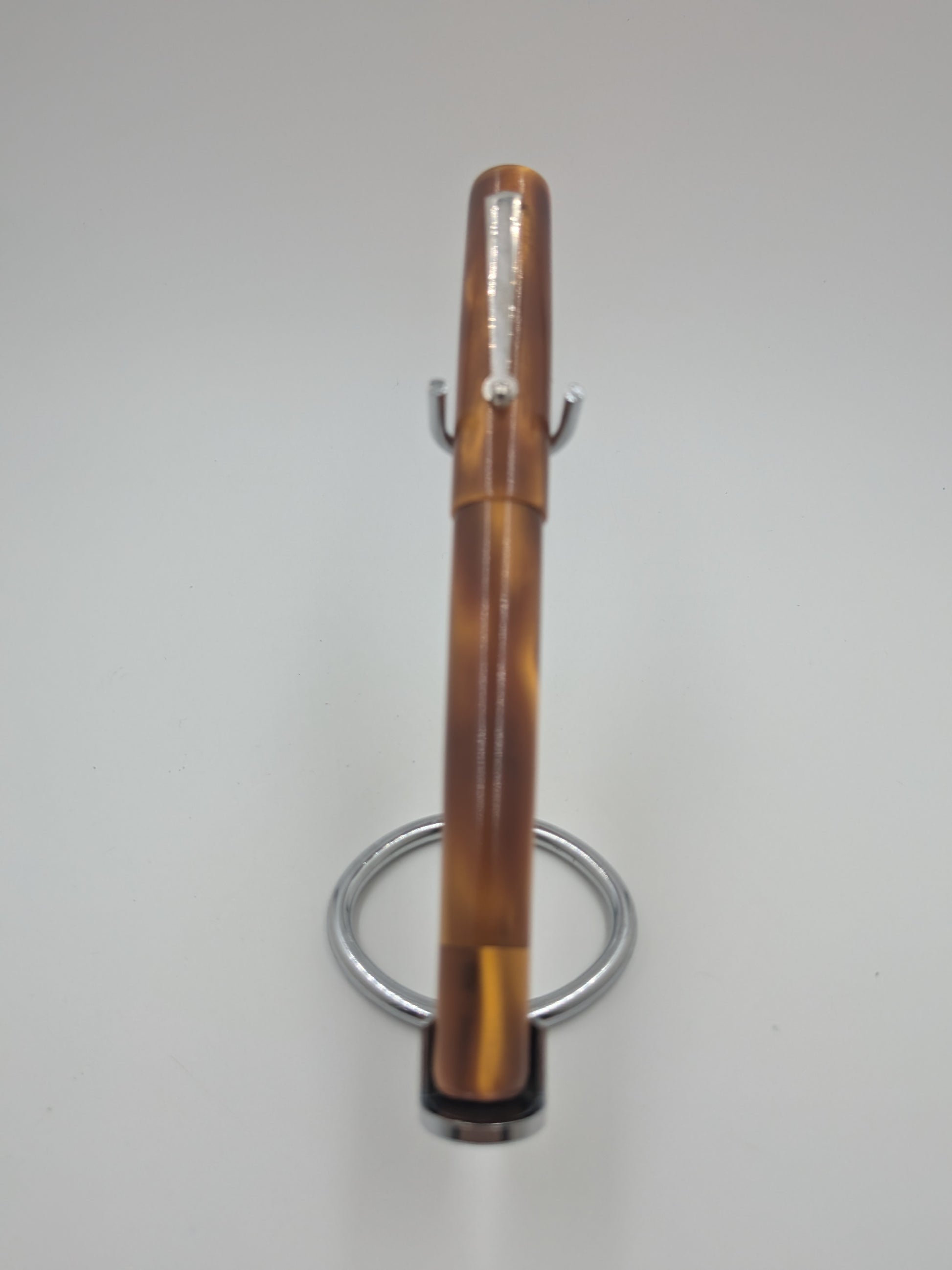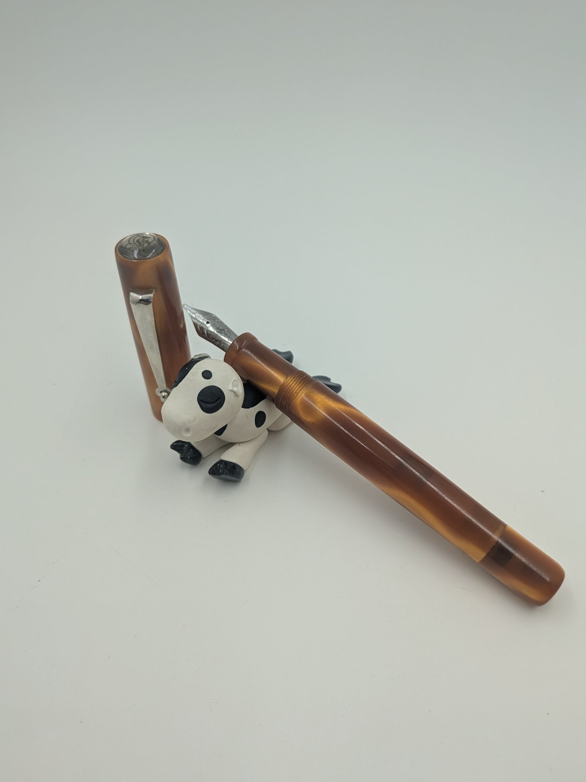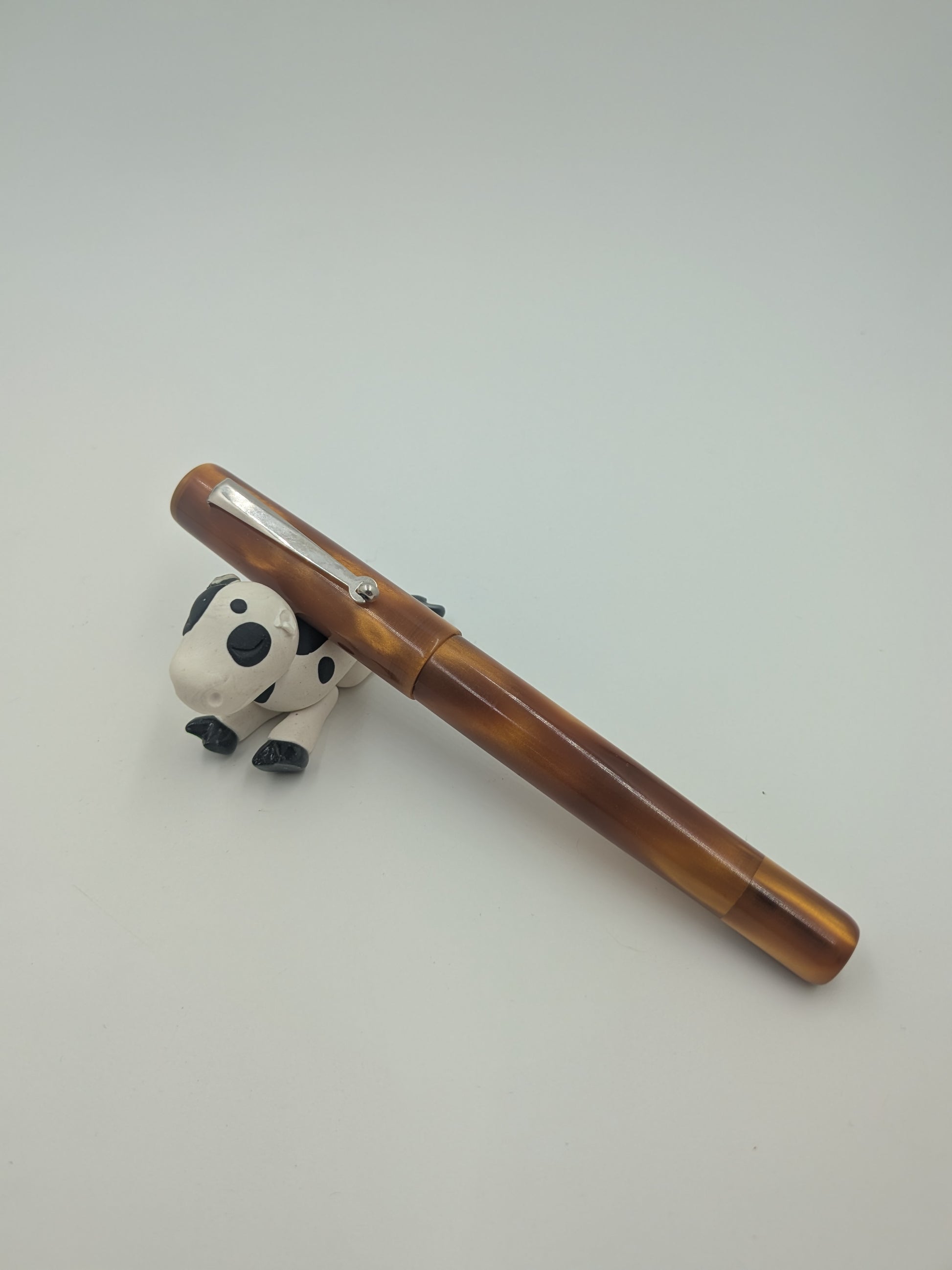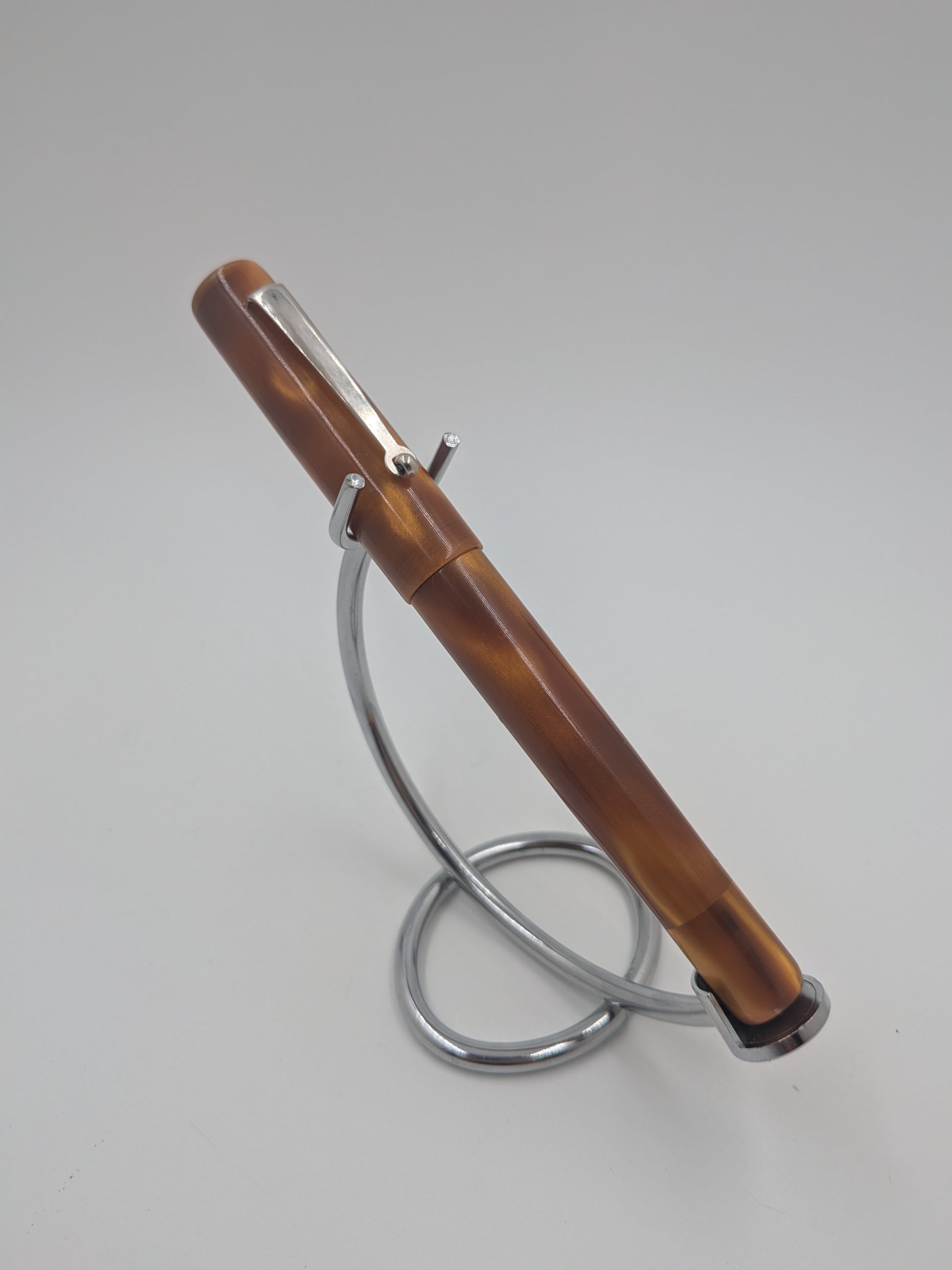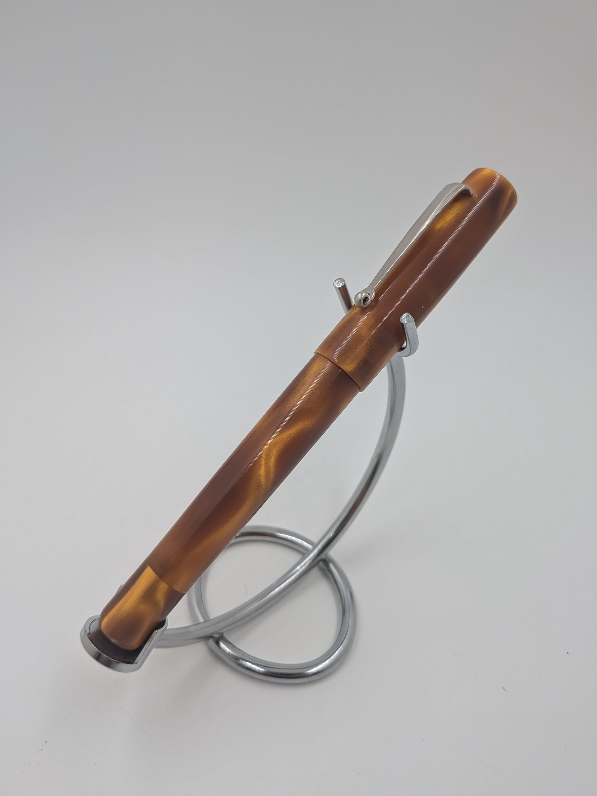 The F24 - (Pourly Controlled) - Analemma - Kolbenfüller pen beautifully blends shimmering gold ribbons with a rich, deep honey brown background, creating a warm and inviting look that’s full of character. The flowing gold accents dance across the surface like sunlit trails, giving the pen a vibrant energy that brightens up every writing moment. This playful design captures the perfect balance between elegance and fun, making it a standout accessory for anyone who loves to add a touch of sunshine to their daily routine. Write with style and a dash of whimsy!
