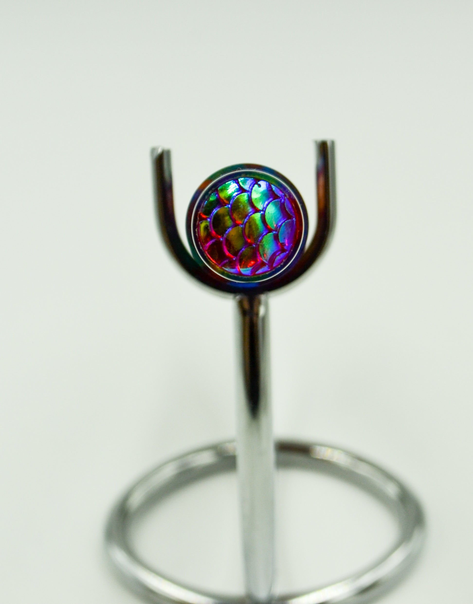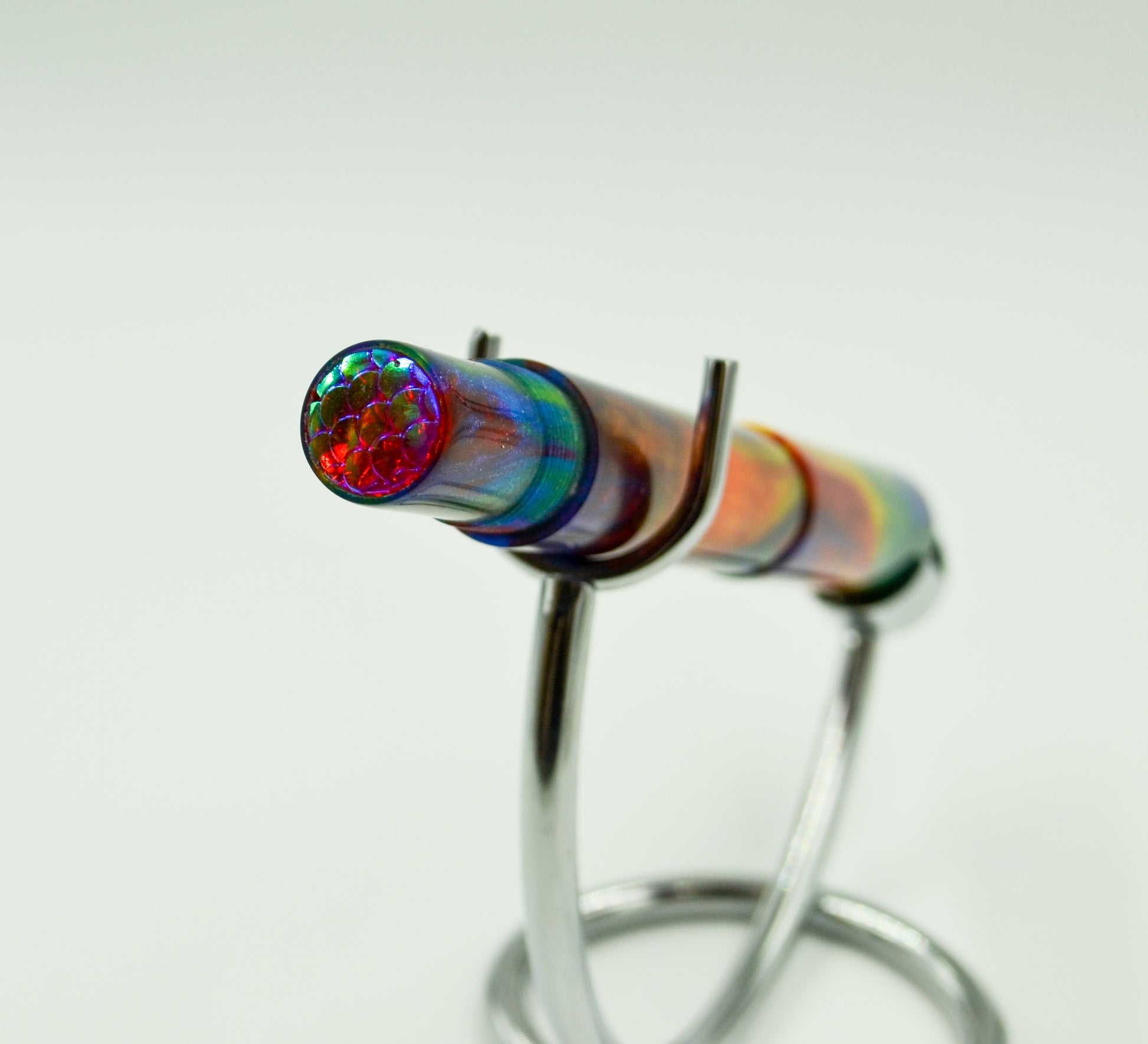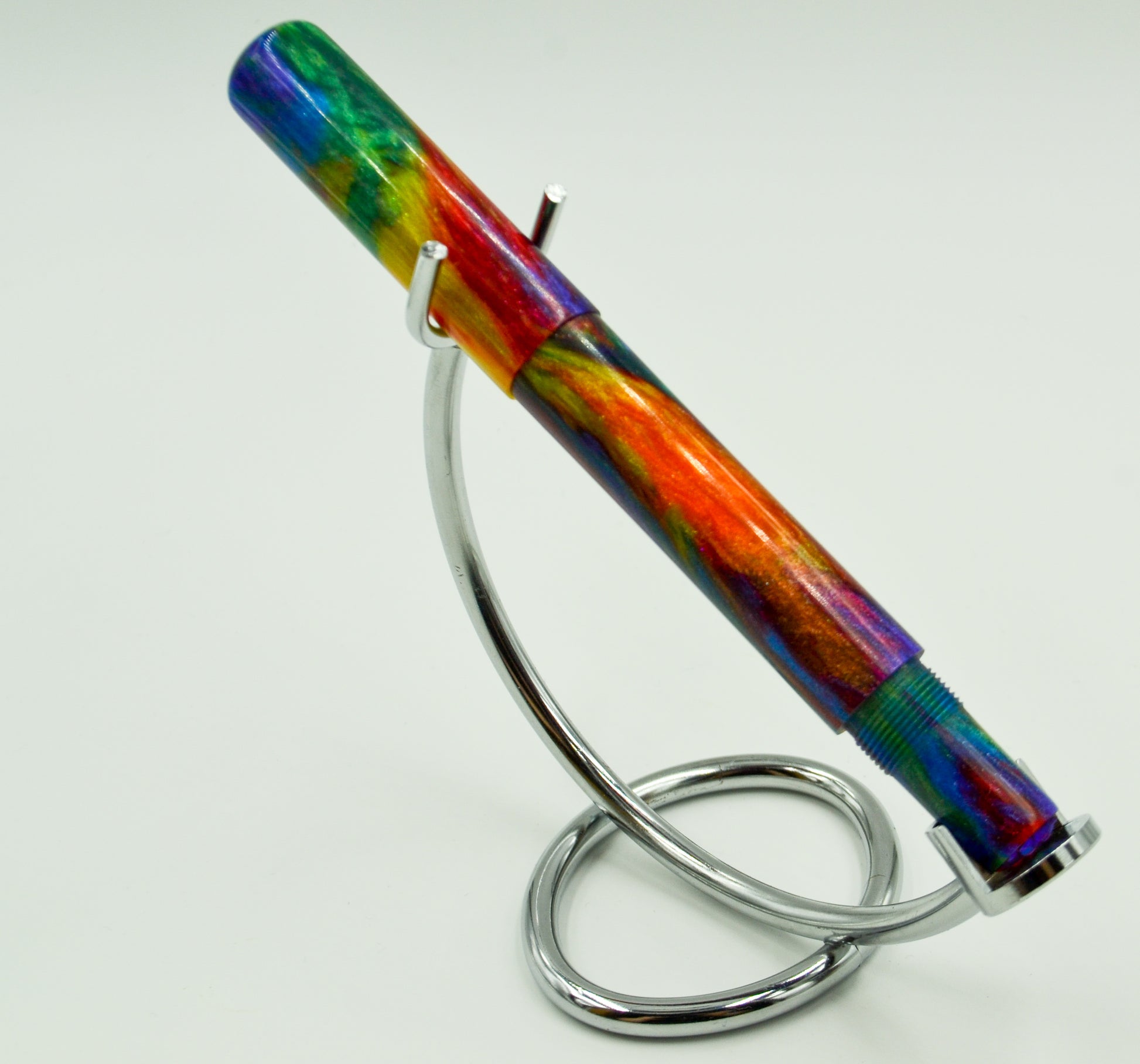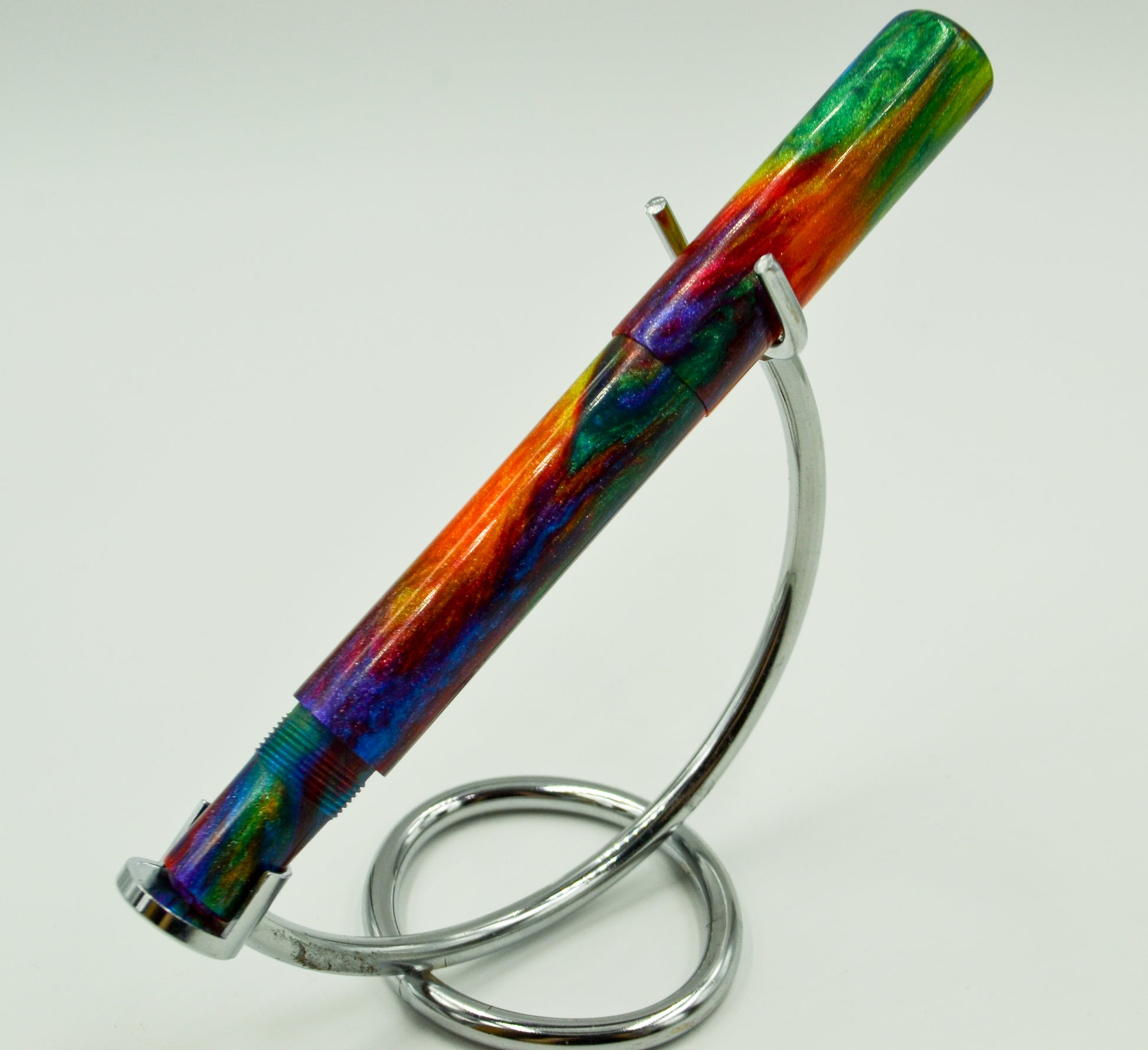 From our friends at DiamondCast, this is their Oil Slick mix and like all DiamondCast material, it features diamond dust in the resin; When the light hits it, the pen lights up! This is the first DiamondCast resin we ever worked with. Debuted at the DC Pen Show in 2018, it was a huge hit from day 1. Simple design, secure posting by threading on the finial. Features a rainbow dragon scale medallion on the finial. This is the first in a series of pens featuring the mythology of the norse.