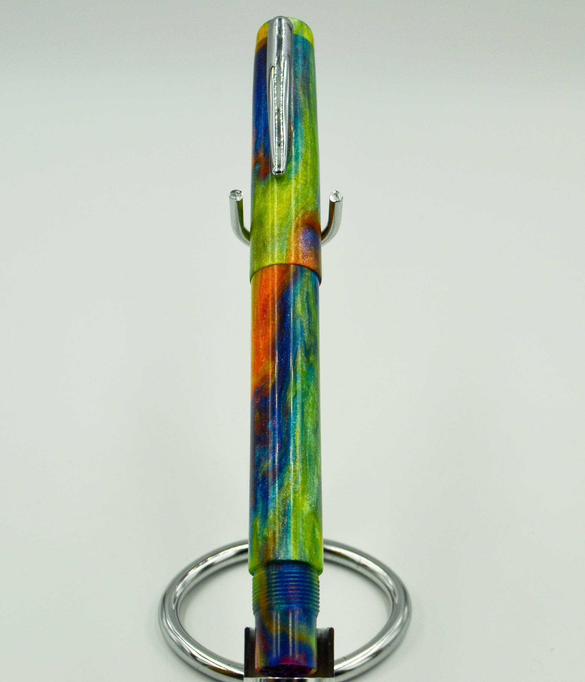 From our friends at DiamondCast, this short run color combo was dubbed Hippie Splash by Elyce (the seamstress who sews our pen rolls and pouches). Colors are light green, orange, blue, white, and hints of red. Like all DiamondCast, it features diamond dust in the resin; When the light hits it, the pen lights up! Simple stainless clip is the only distraction from the beauty of the material. The pen features our screw post design, ensuring the cap will never come loose when posted.