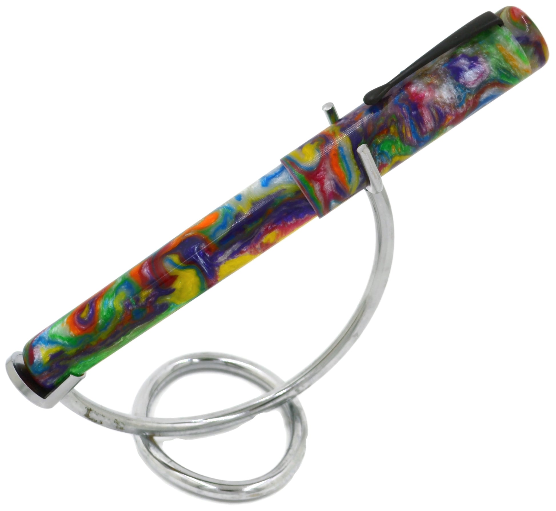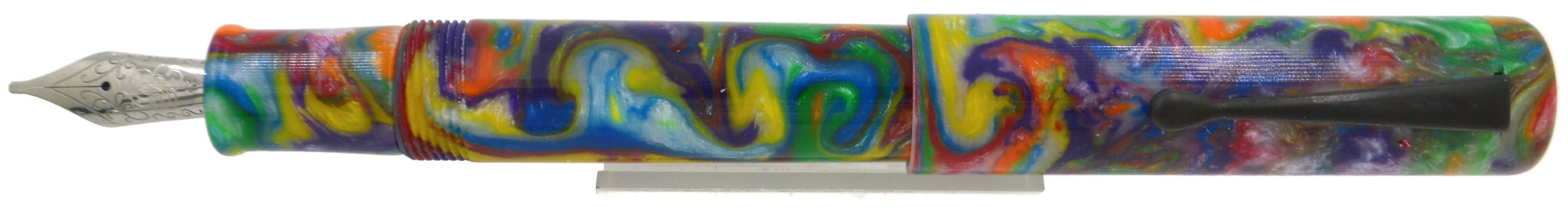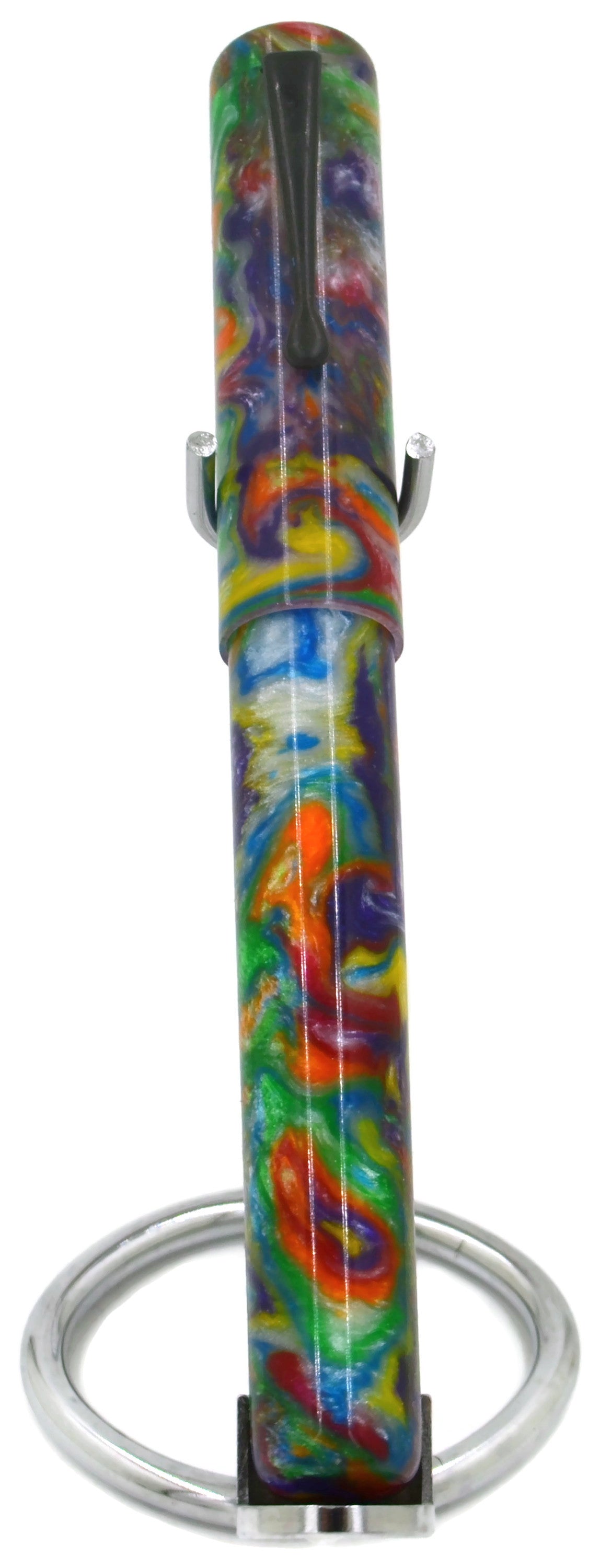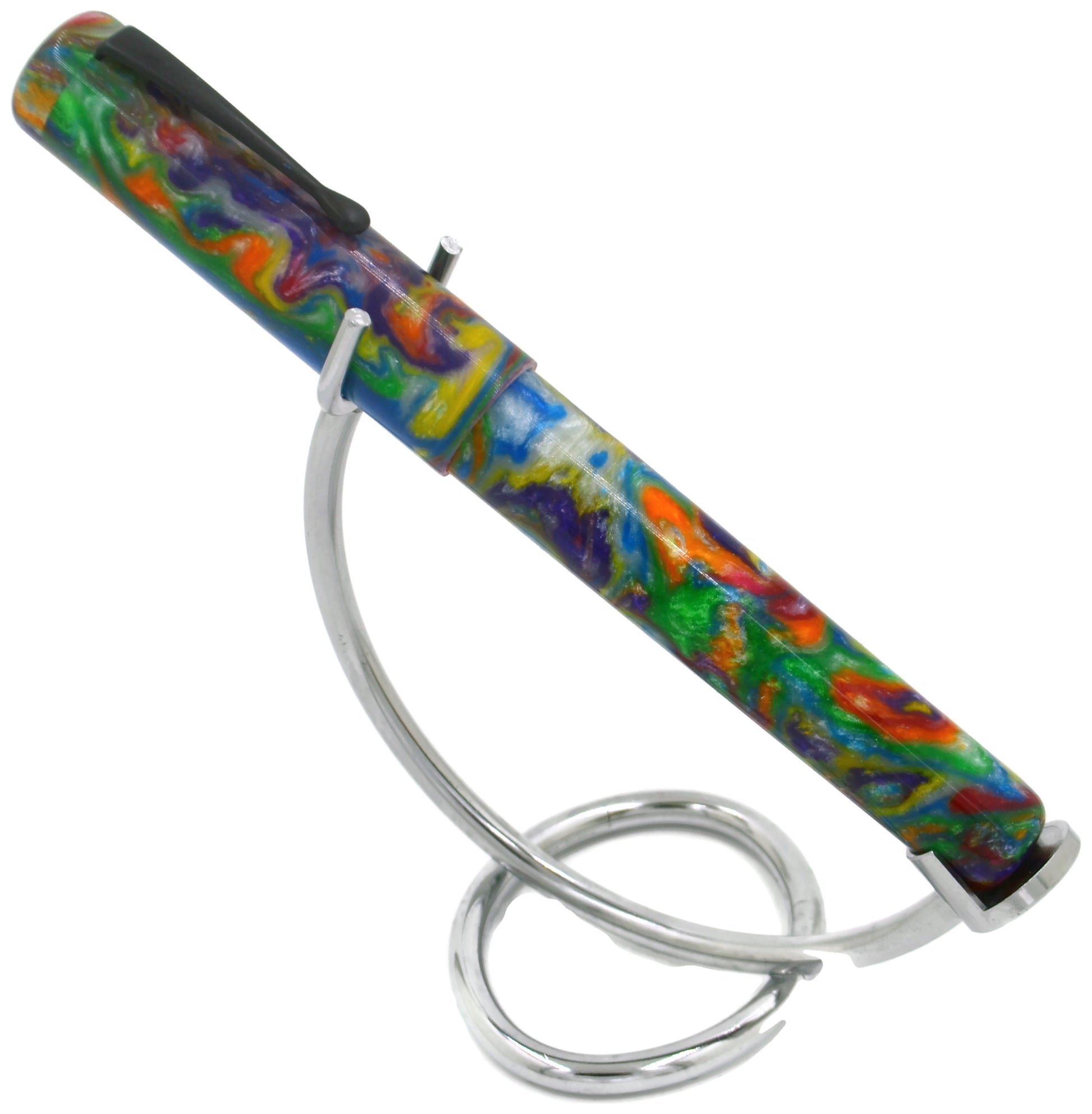 This is our OVERSIZE evancio pen. 16mm barrel, 18mmcap,14.5mm section and deeply postable. The deep posting prevents the pen from being unbalanced when writing. This pen uses a blank called "Unicorn Puke / Birthday Cake" from our friends at Swampwood Products. We choose to call it birthday cake.. little less visual. Swampwood products are known for their bright, bold, creative blanks and they fit right into our overall product line. The pen features a black oxide clip.
