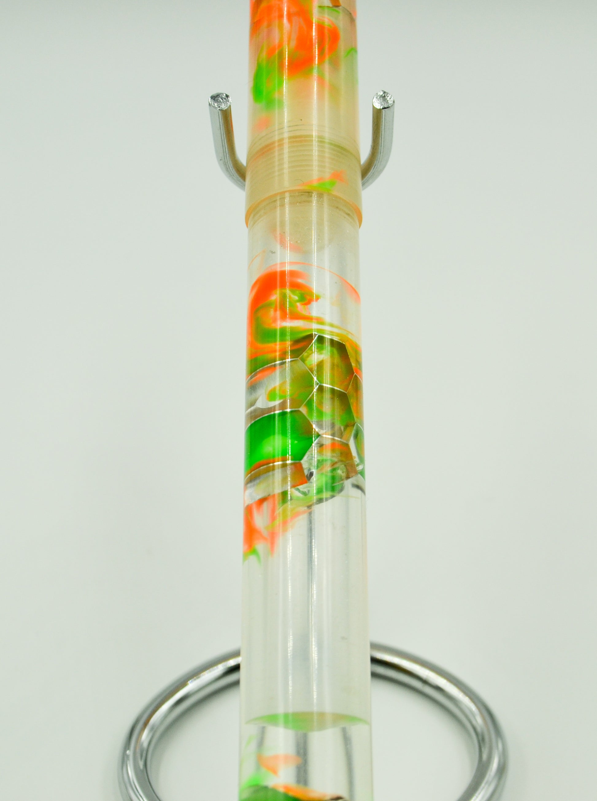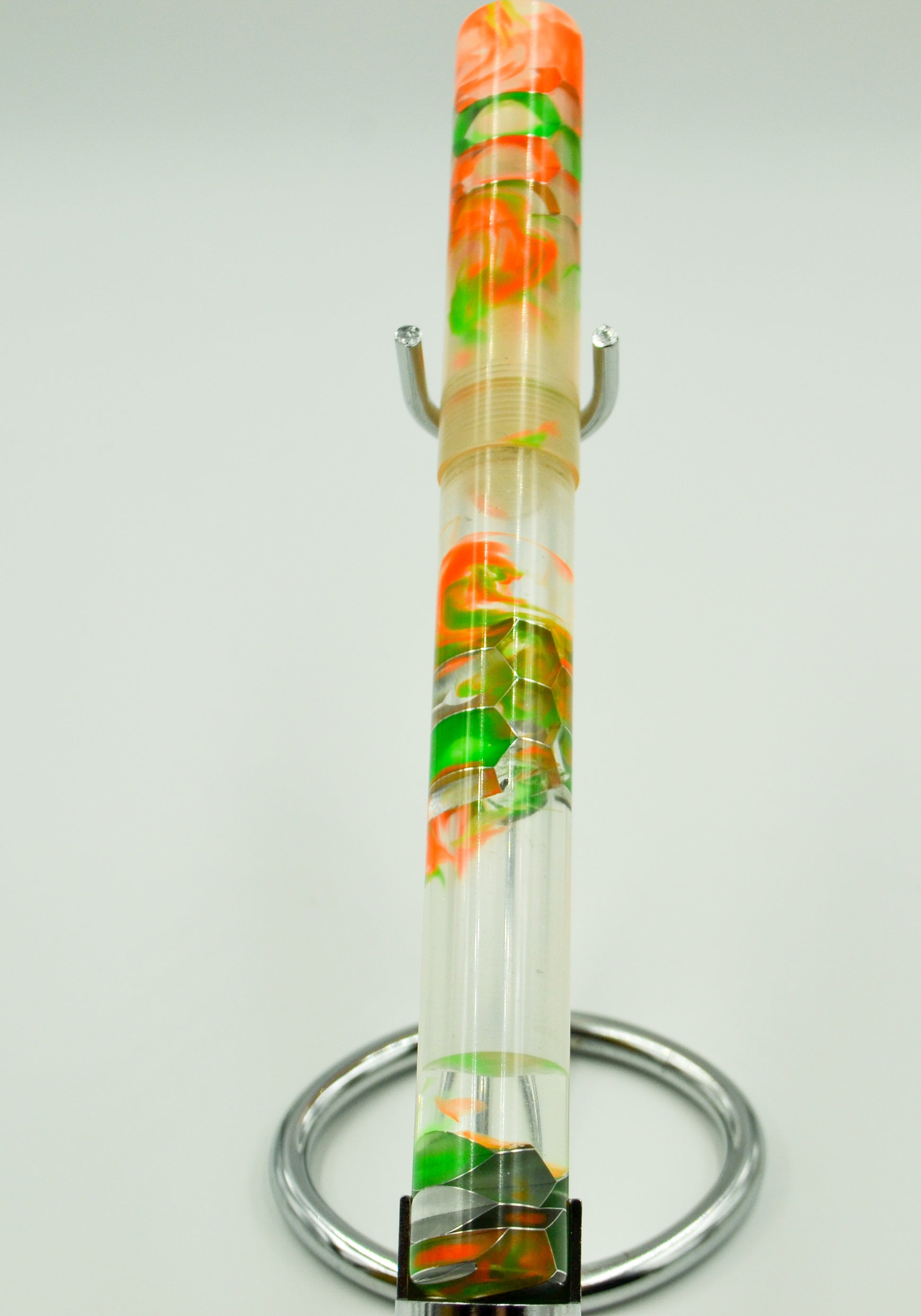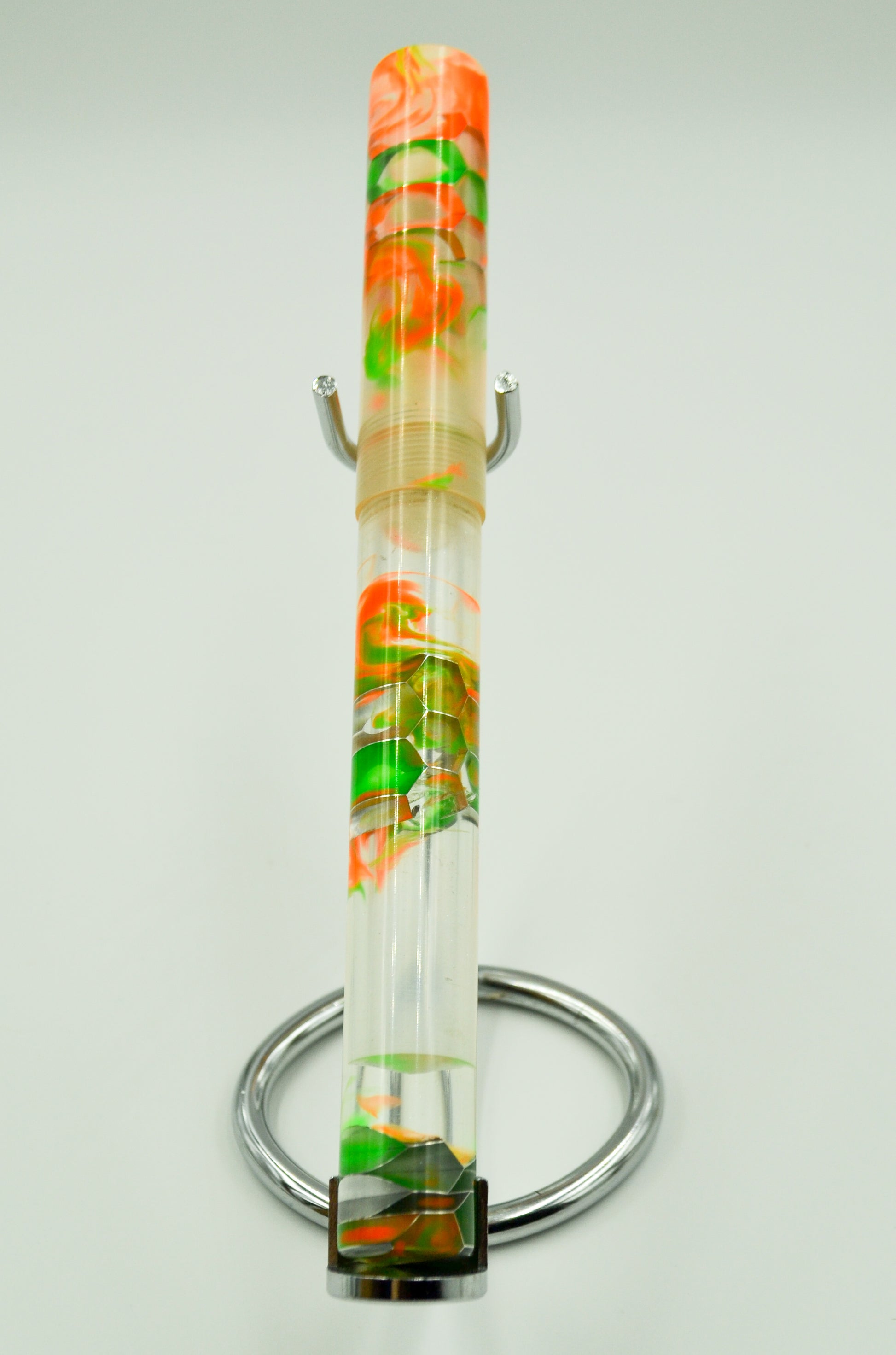 Featuring a very unique material. Aluminum honeycomb is embedded into clear resin with translucent swirls of orange and green. The pen is a definite attention grabber. The honeycomb is featured in small grouping through the length of the body.