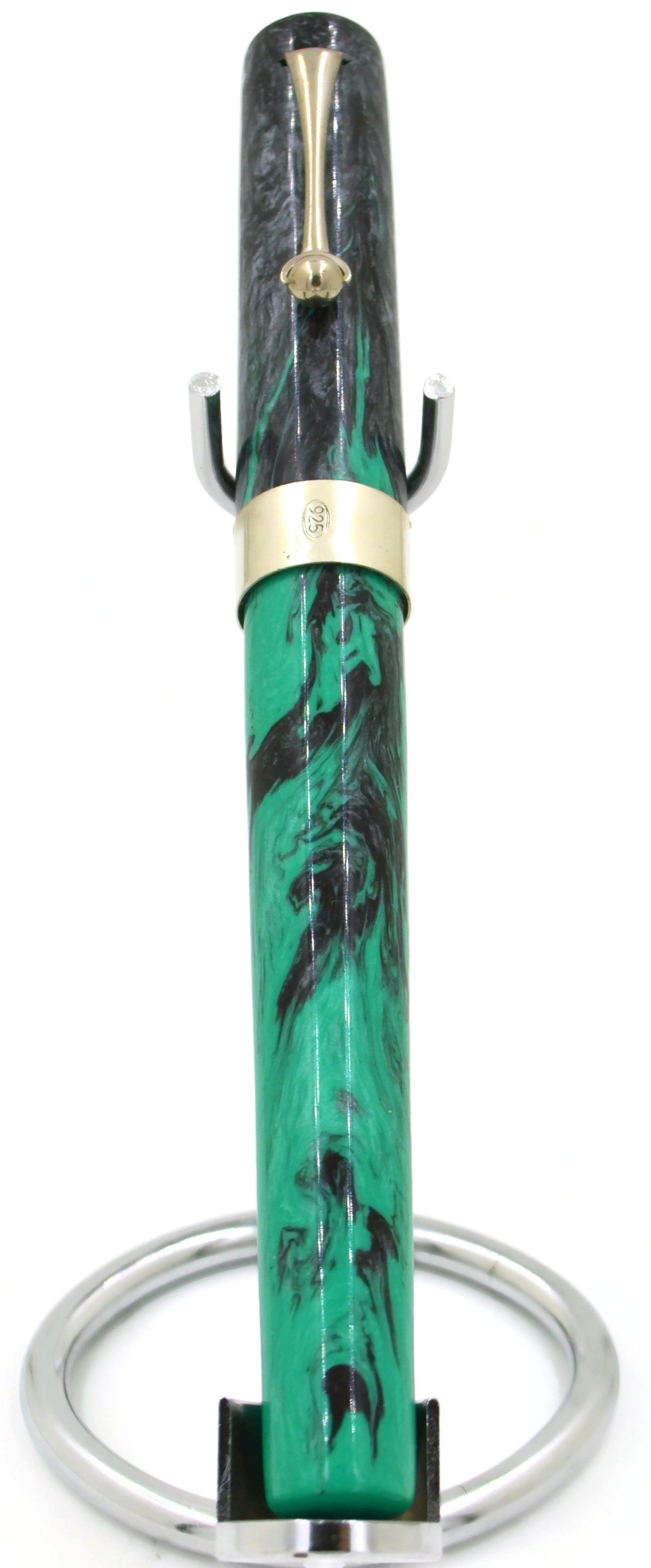 The pen is dressed with a stainless steel clip and nickel band on the cap. Overall length is a little shy of 6" capped. Body threads are 13mm and it has a diameter of about .600" at the body's widest. It gently tapers to the finial allowing the cap to be posted.