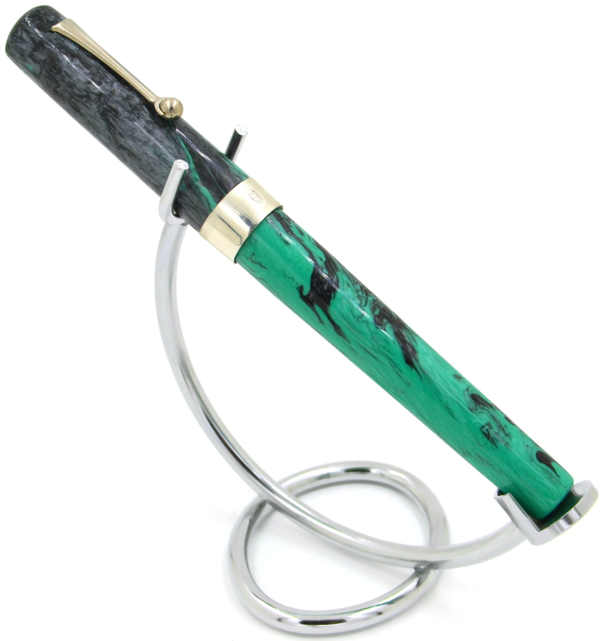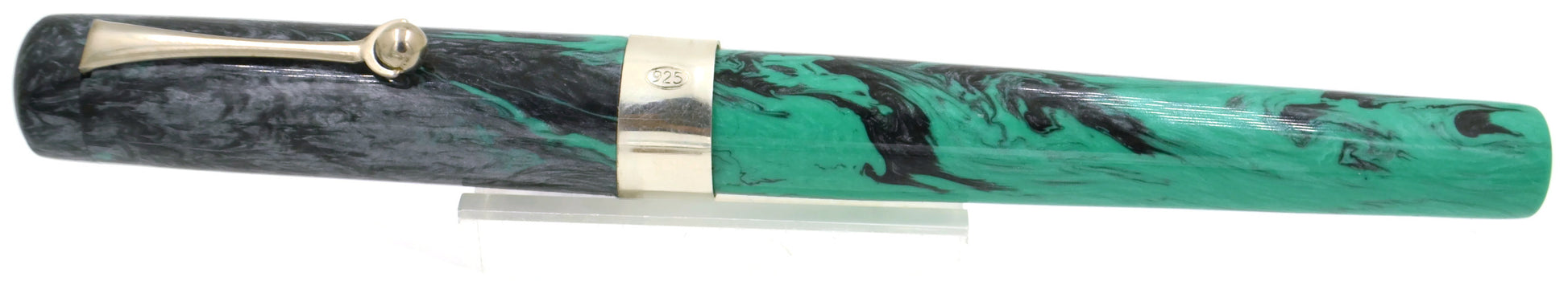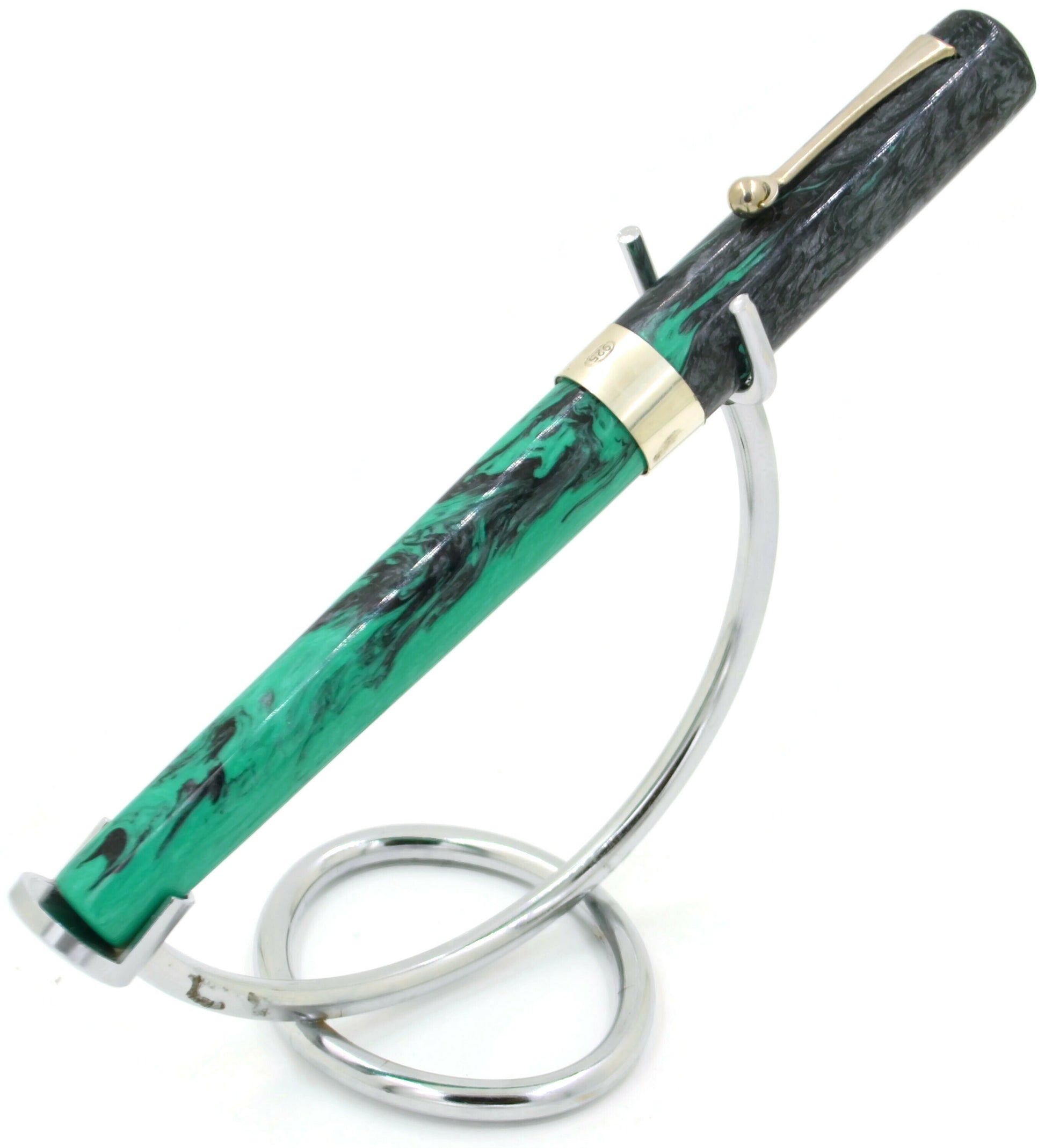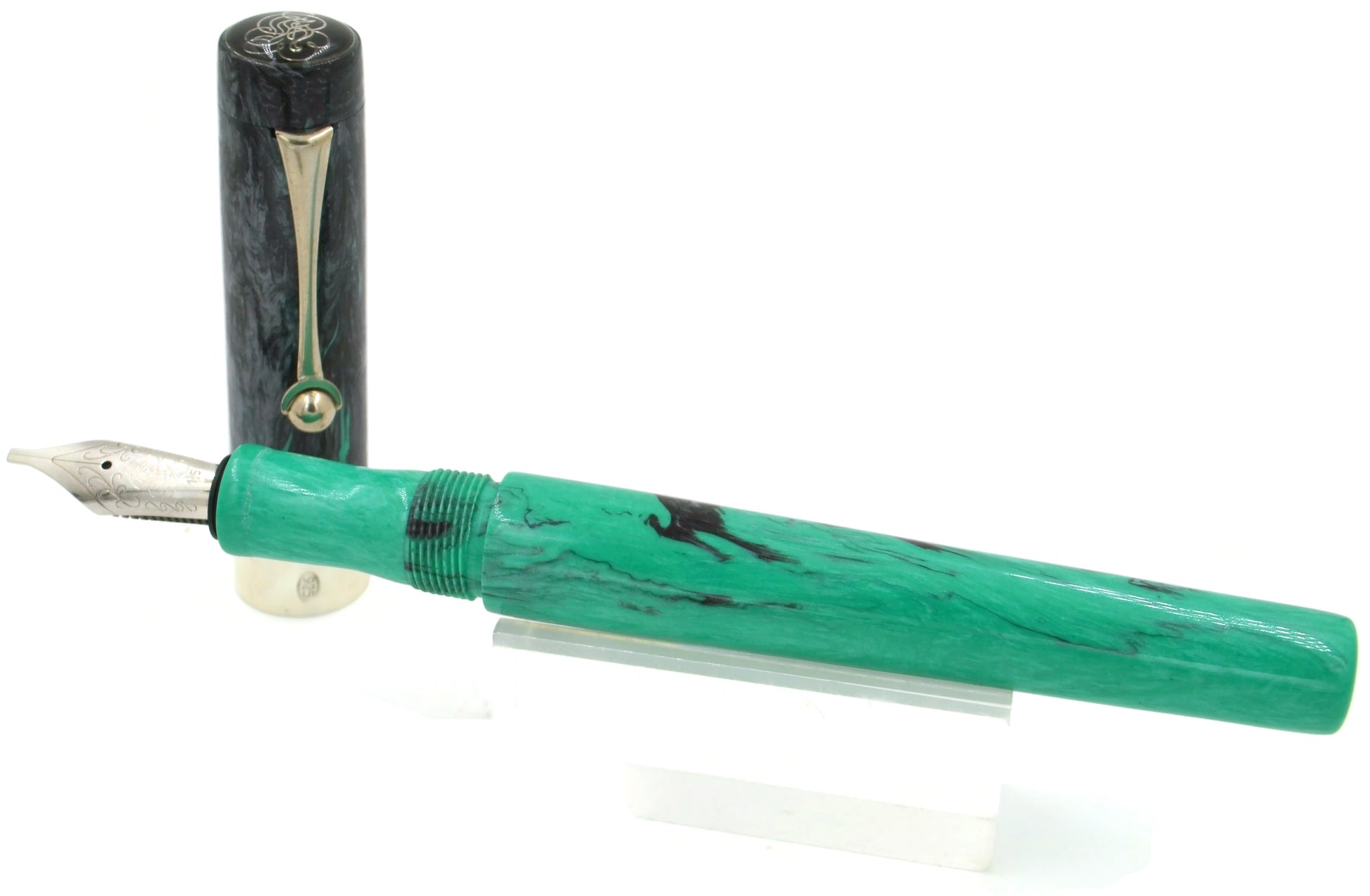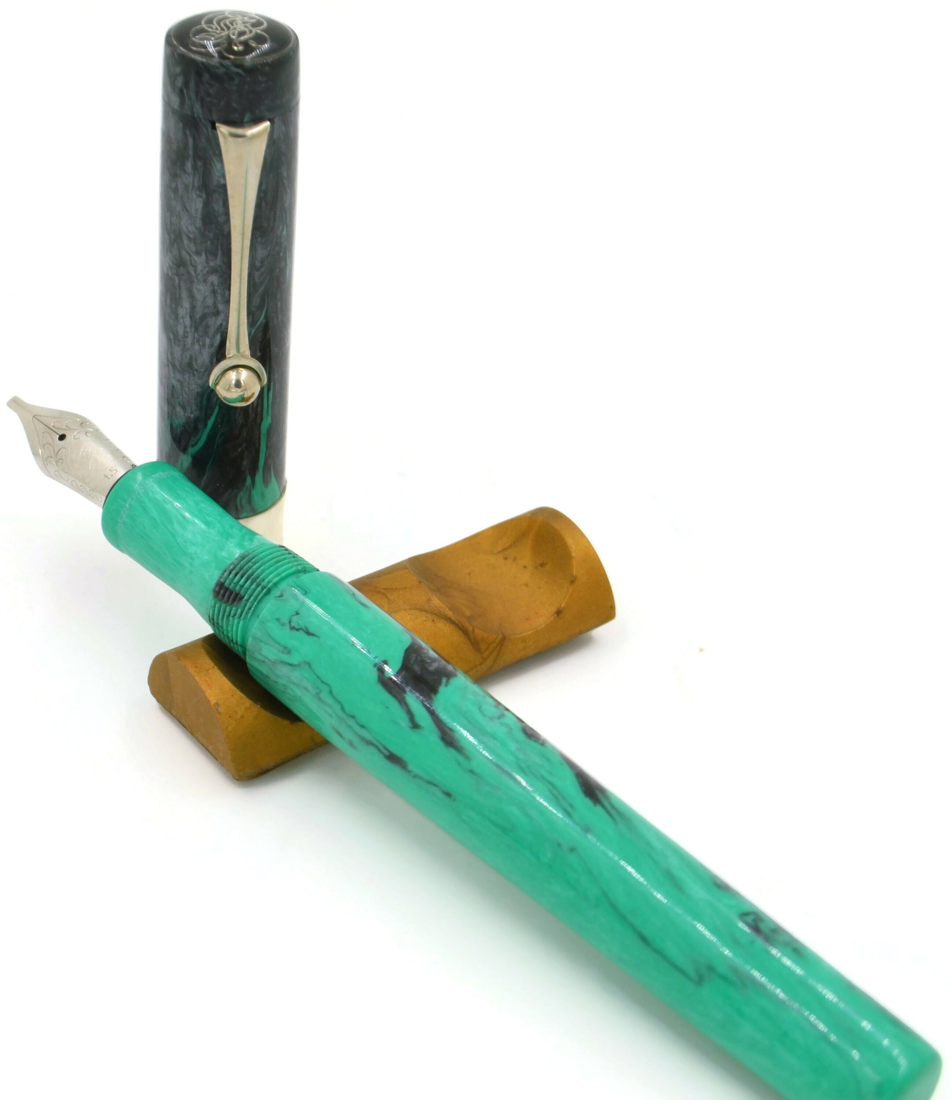 As shown, the pearlescent teal is the first to grab your attention., then bold swirls of antique silver inspire a feeling of nostalgia and gives it a retro appearance. Made from an incredibly strong and durable epoxy, it will resist scratches and will survive falls and a bit of clumsiness (trust me, my klutz self has tested it thoroughly). There is a wide variety of nib offerings.