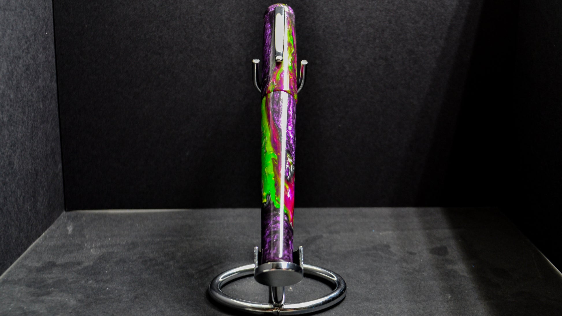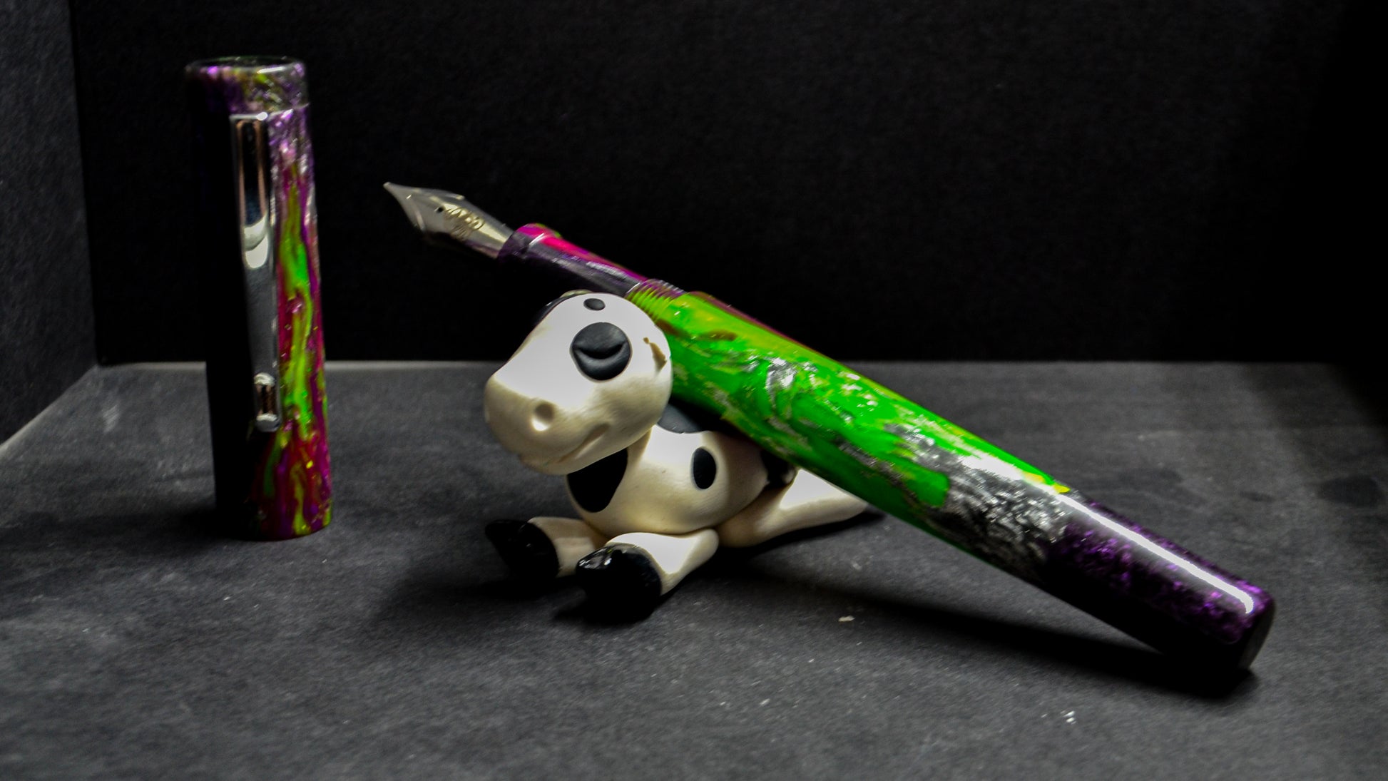 Be bold and bright with our B24 - SNR - Neon Peacock fountain pen! Handmade with loud colors and neon accents, this beautiful pen is perfect for journaling and note taking. Its unique purple and green design will make writing feel like a party. (Pen is not actually a bird.)