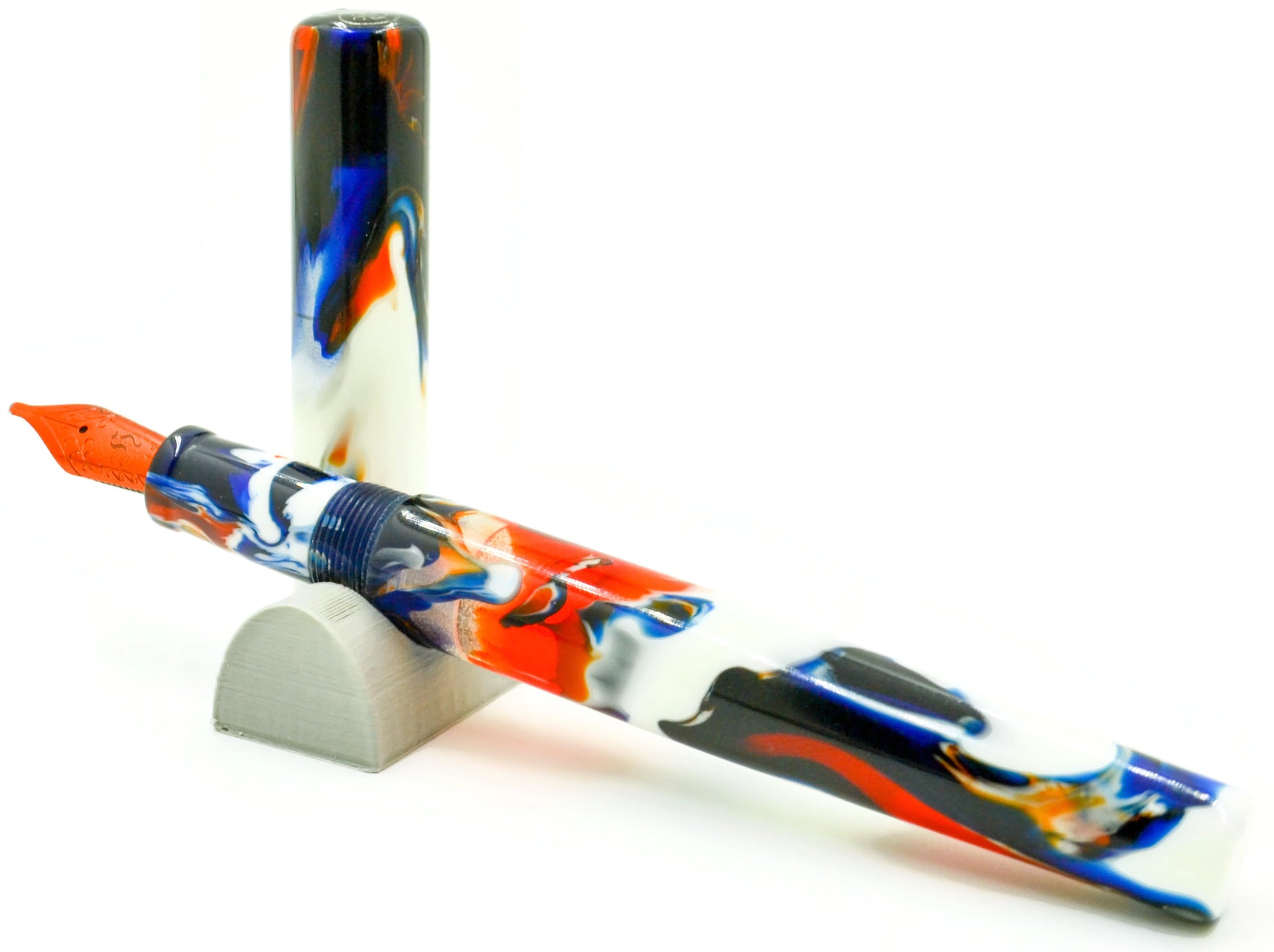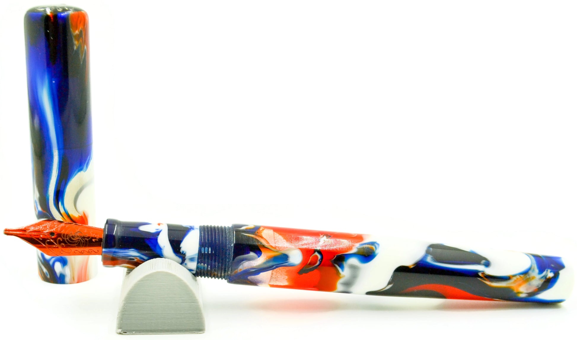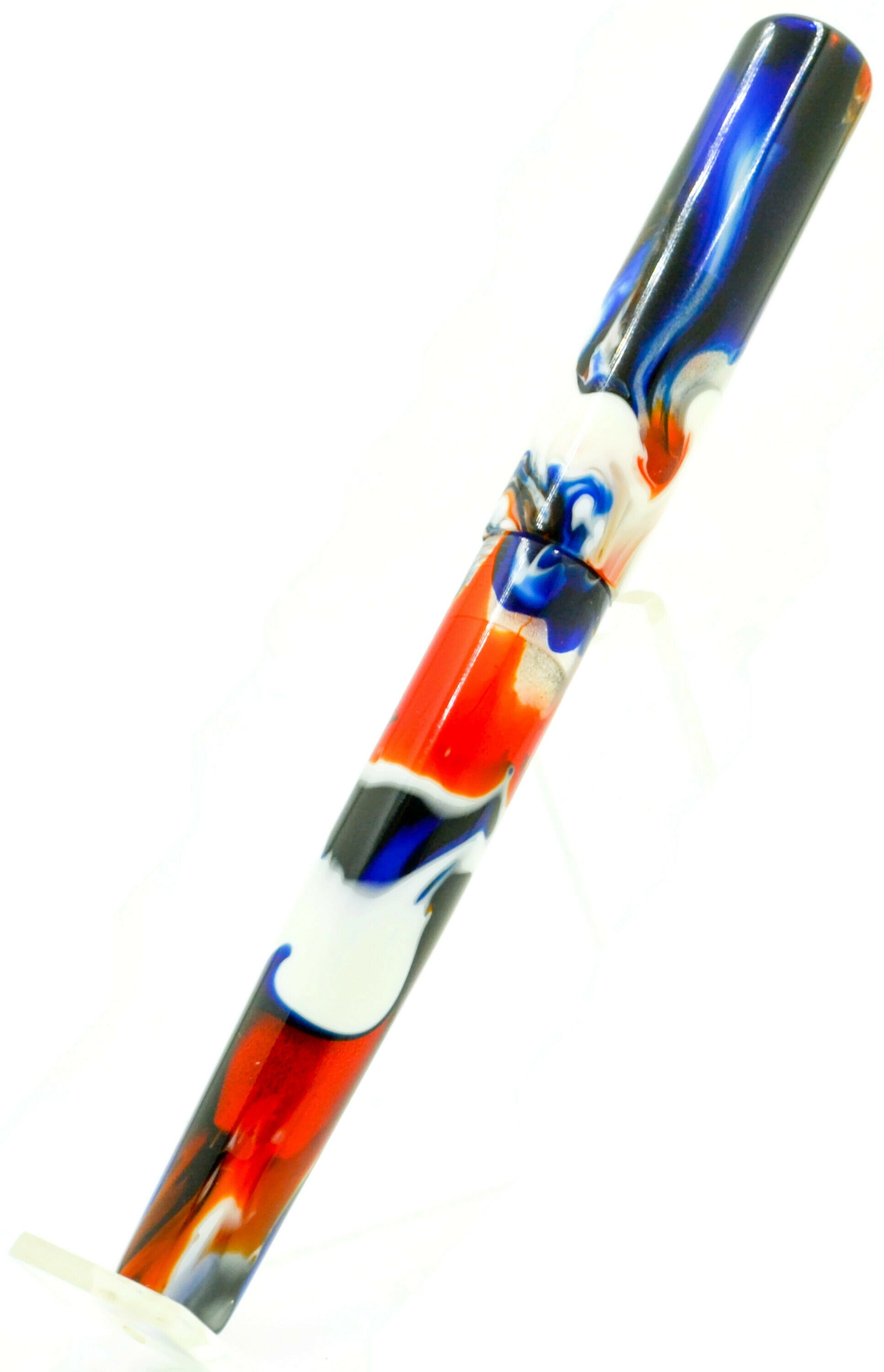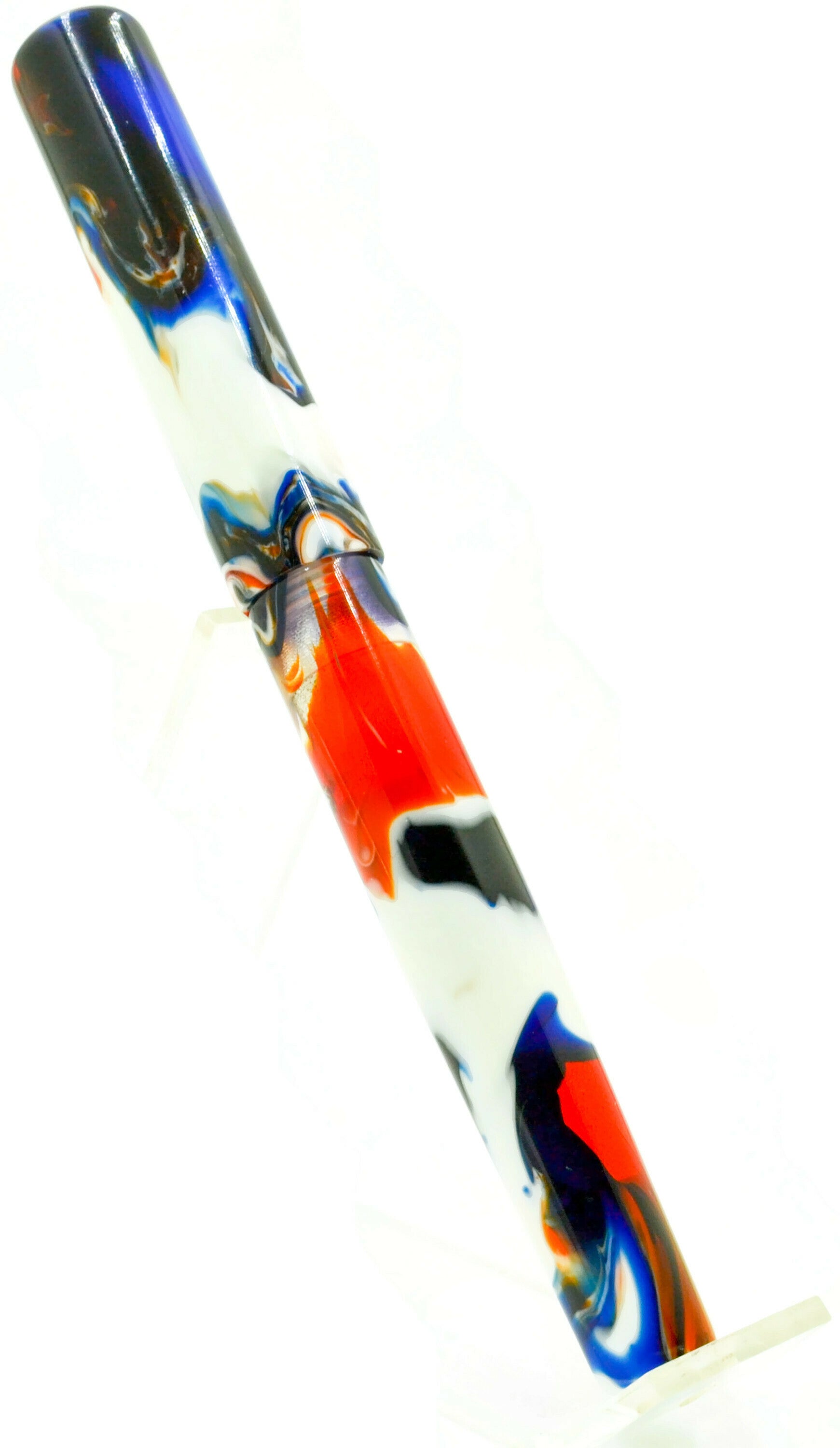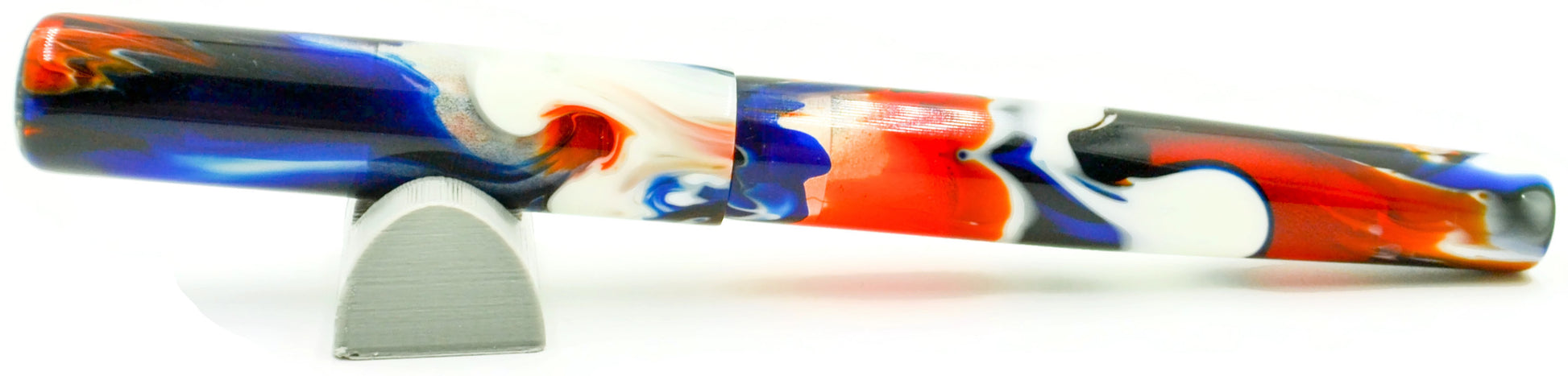 Previously, this pen was a "Pen Show Only" pen. It's colors are VERY unique. We call it the "Hot Rod" because the colors match very close to the old Hot Wheels logo. Streaks of white, red, black, and blue are sharp and crisp. This particular pen is a little darker, featuring more black than normal. A true unique pen.