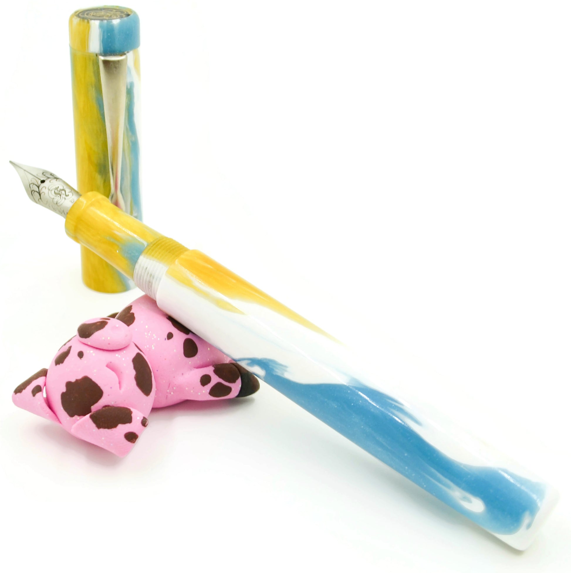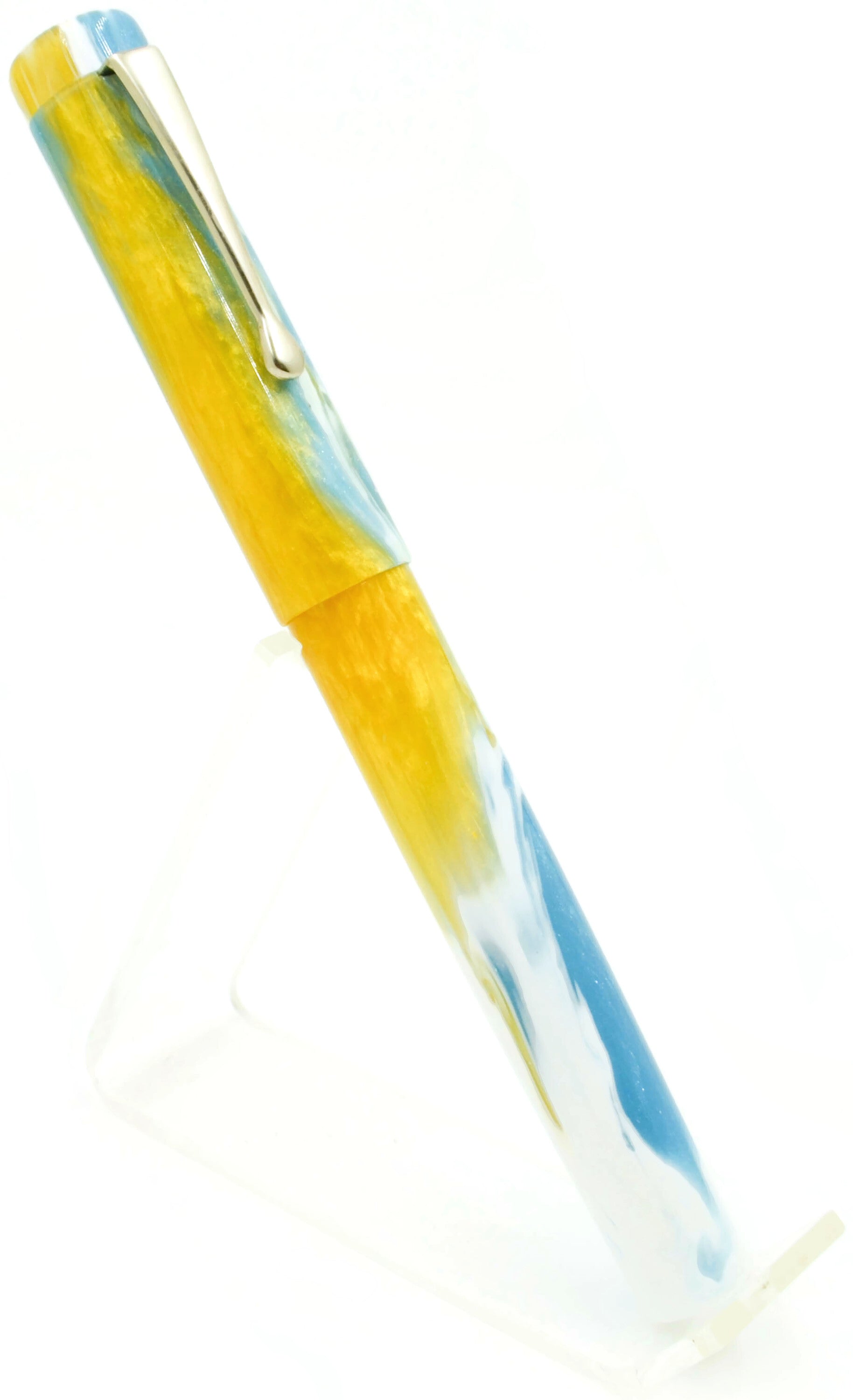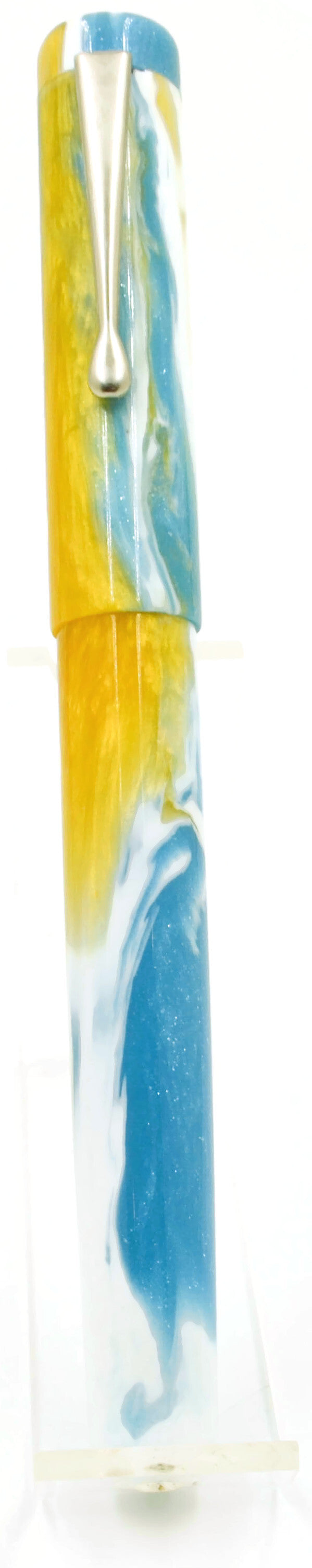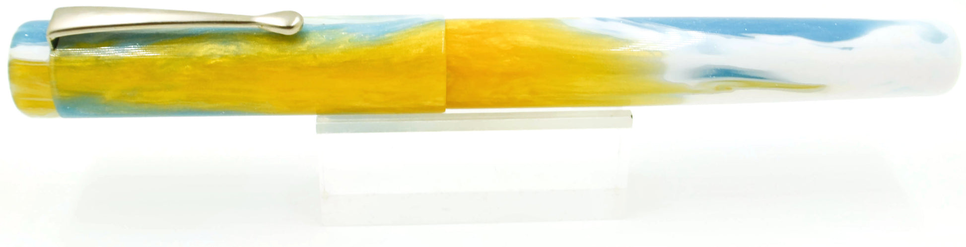Empryean as an adjective means "belonging to or deriving from Heaven". As a noun means "Heaven, in particular the highest part of heaven". This particular mix of colors, it's beauty, is what I'd like to think a warm day in heaven looks like. The pen has a simple chrome clip. It's a little shorter than most and is postable.