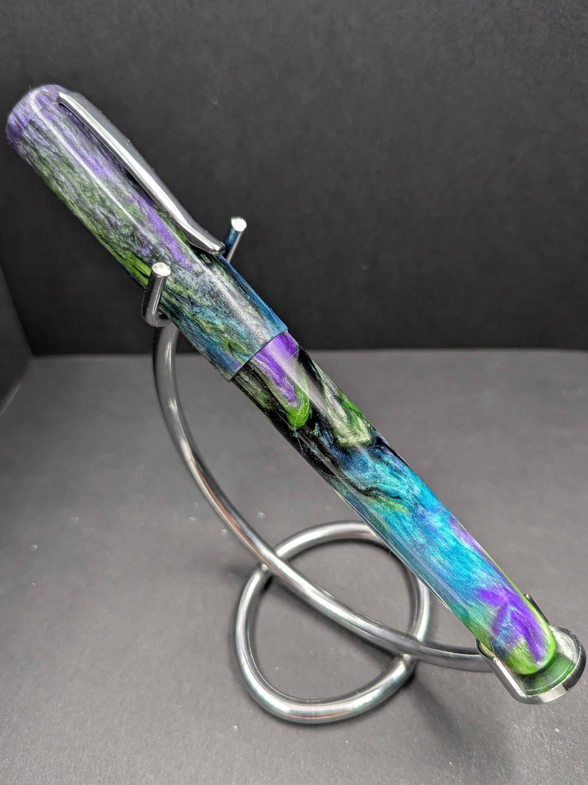 Introducing Serenity, Starry Night's latest resin masterpiece in the beloved B24 model. This mesmerizing blend of blue, purple, green, and black swirls together to create a pen that's as soothing to look at as it is to hold. With its sleek clip and perfectly weighted design, Serenity strikes the ideal balance between style and comfort—the perfect companion for anyone seeking a little calm in their writing. Each pen is handcrafted with premium resin, ensuring no two are exactly alike. Whether you're jotting down daily thoughts, signing important documents, or simply enjoying the tactile pleasure of quality writing, Serenity delivers both performance and personality. The smooth ink flow pairs beautifully with the pen's tranquil aesthetic, making every stroke feel intentional and satisfying. Treat yourself or gift this one-of-a-kind writing instrument to someone who appreciates the finer things.