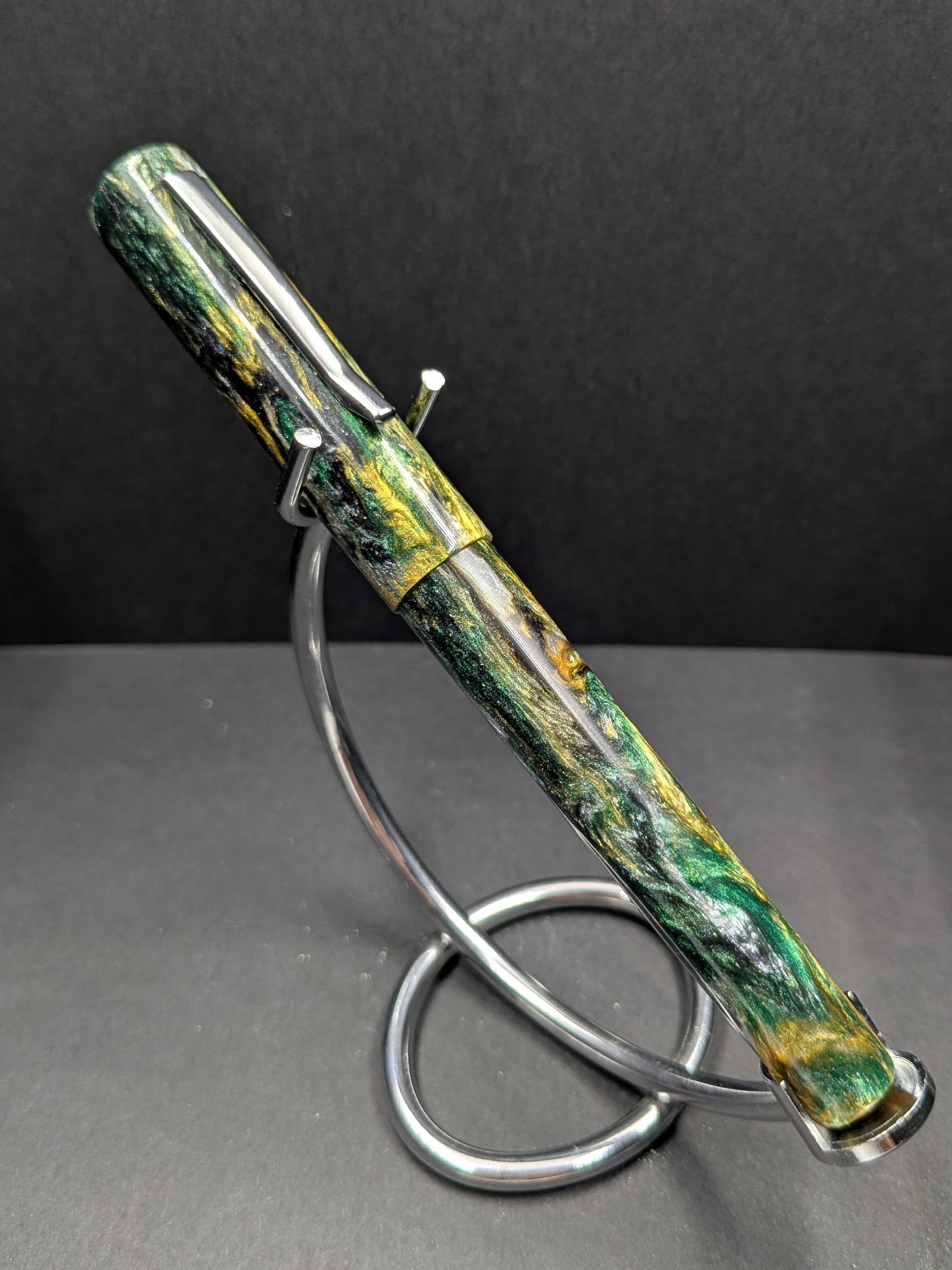 Step into the enchanted depths of Sherwood Forest with this captivating pen. Rich hues of forest green, warm gold, and earthy brown swirl together, evoking the mystique of ancient woodlands where legends were born. Each glance transports you to a realm of adventure and timeless wonder. Perfect for those who appreciate nature's magic and a touch of whimsy in their everyday writing.