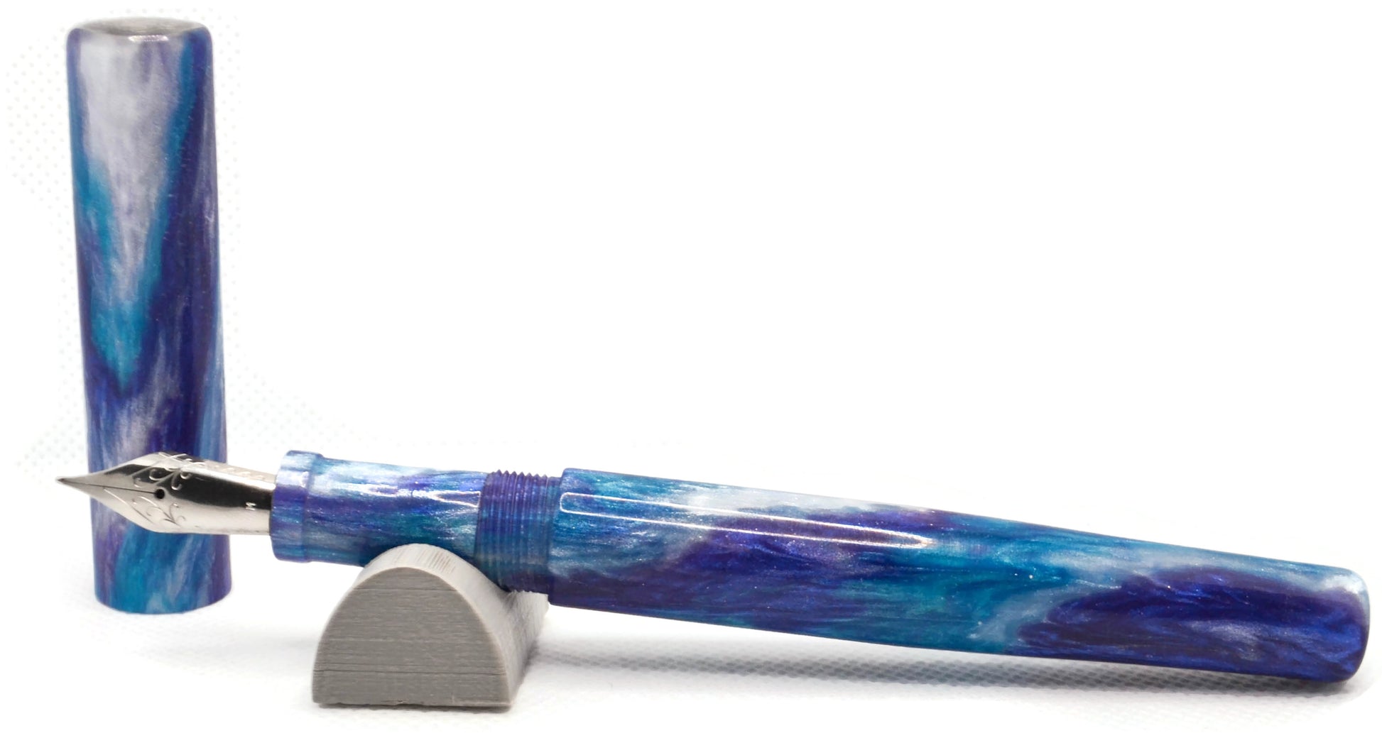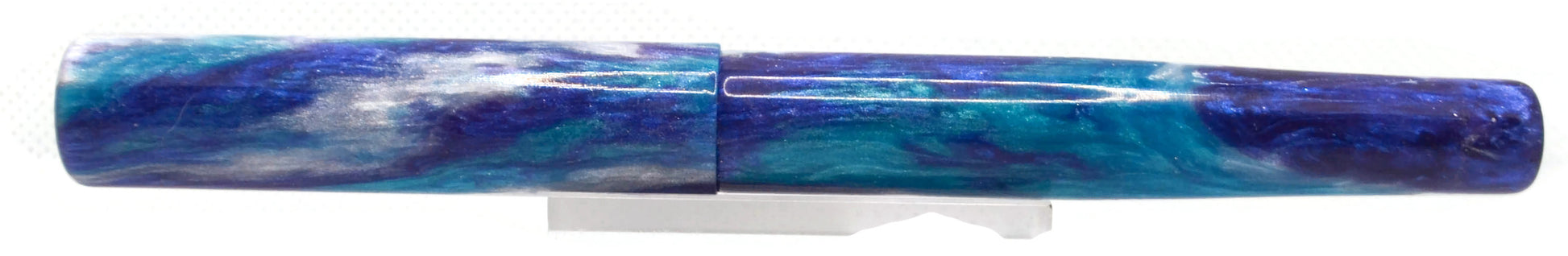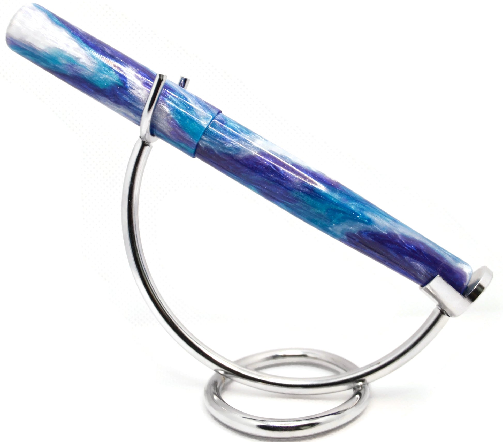 A Winter Sunset. Purple, White, and turquoise stripe the resin, flowing around the barrel Made in our most popular model, B24 and Includes our new cap finial medallion.