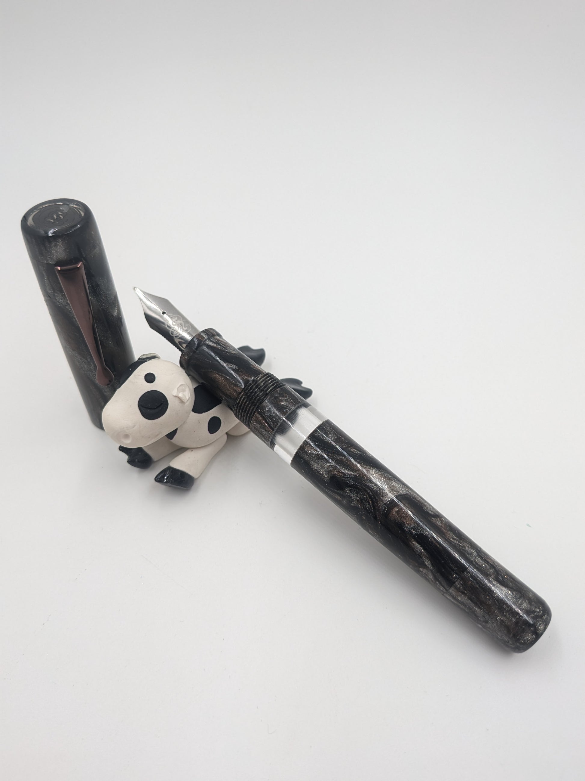 This is a rather large pen. The cap is approximately 18mm in diameter, the body 16mm at its widest point, and the section about 15mm at its widest. This pen works very well with a bock #8 titanium nib, but can also be paired with a standard steel #6.