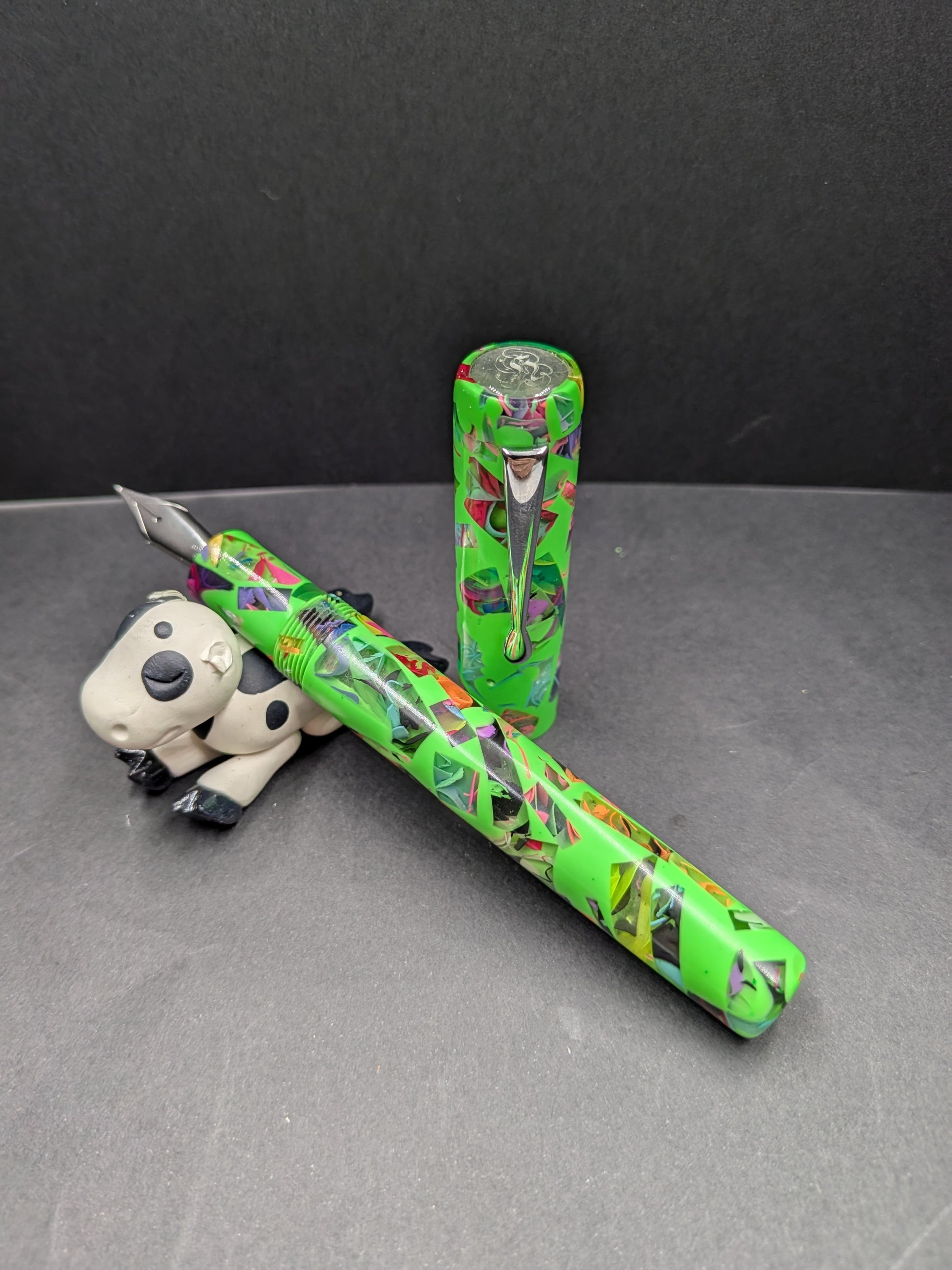 I've called these Mosaic. They're made by grinding other left over resin cutoffs into small chunks and casting them in another resin. The result is quite intriguing. This is a rather bright neon green base.