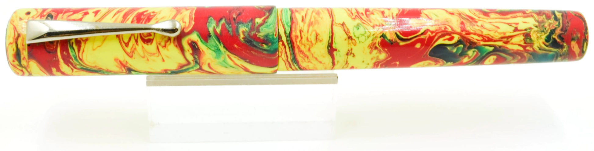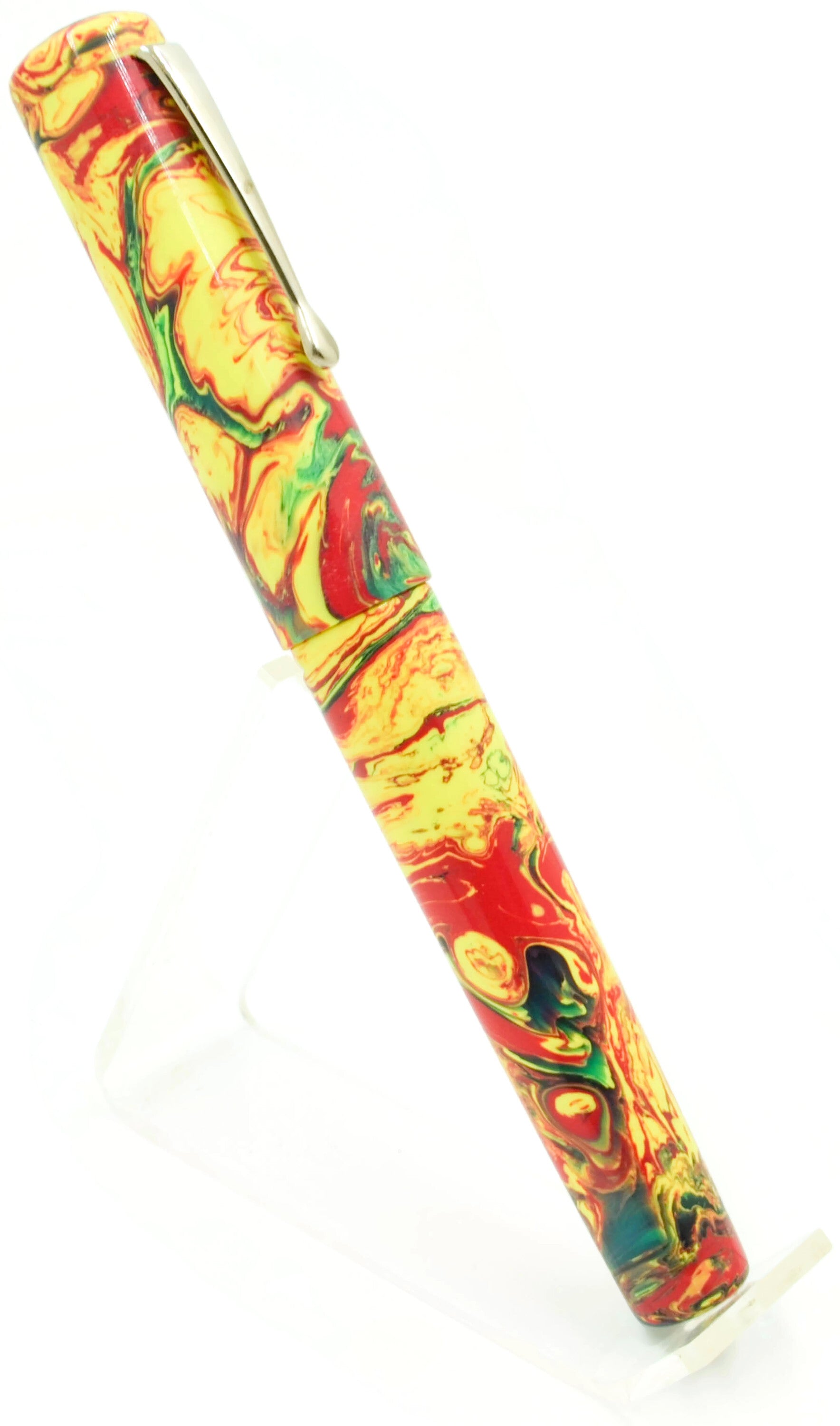 This is our OVERSIZE evancio pen. 16mm barrel, 18mmcap, 14mm section and deeply postable. The deep posting prevents the pen from being unbalanced when writing. This pen uses a blank called "Rusty Faucet Lava Explosion", produced by our friends at Mutt Blanks here in Texas. The pen features a black oxide clip.