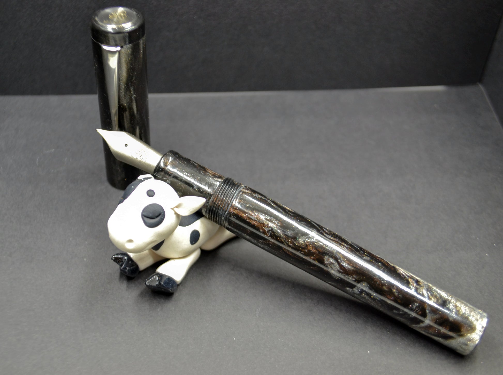This is our OVERSIZE evancio pen. 16mm barrel, 18mmcap, 14mm section and deeply postable. The deep posting prevents the pen from being unbalanced when writing. The Heimdallr resin is a unique pattern from our friends at DiamondCast and is Exclusive to Hinze Pens. features, Black, Silver, and Bronze swirls giving it a tremendous depth.