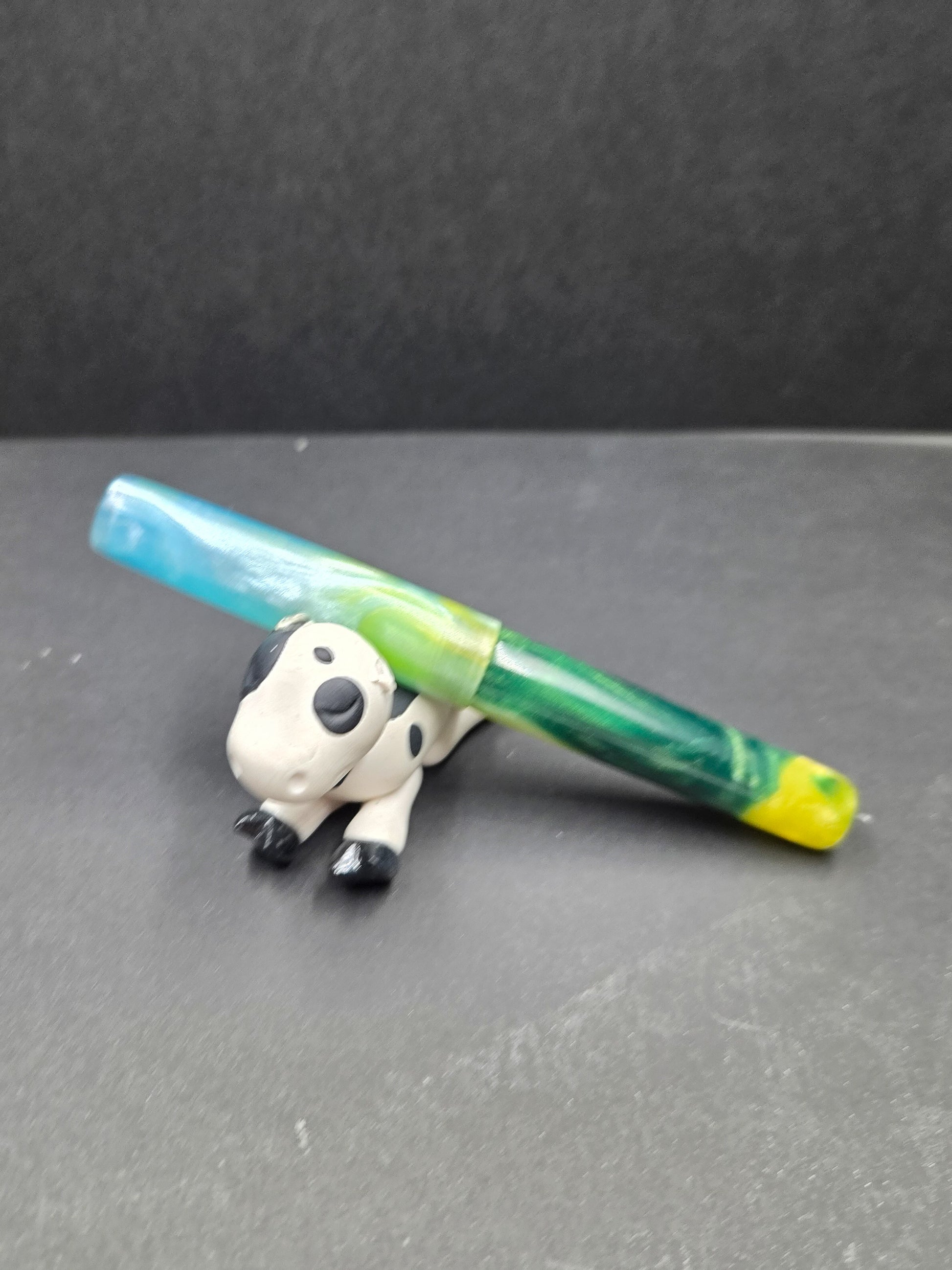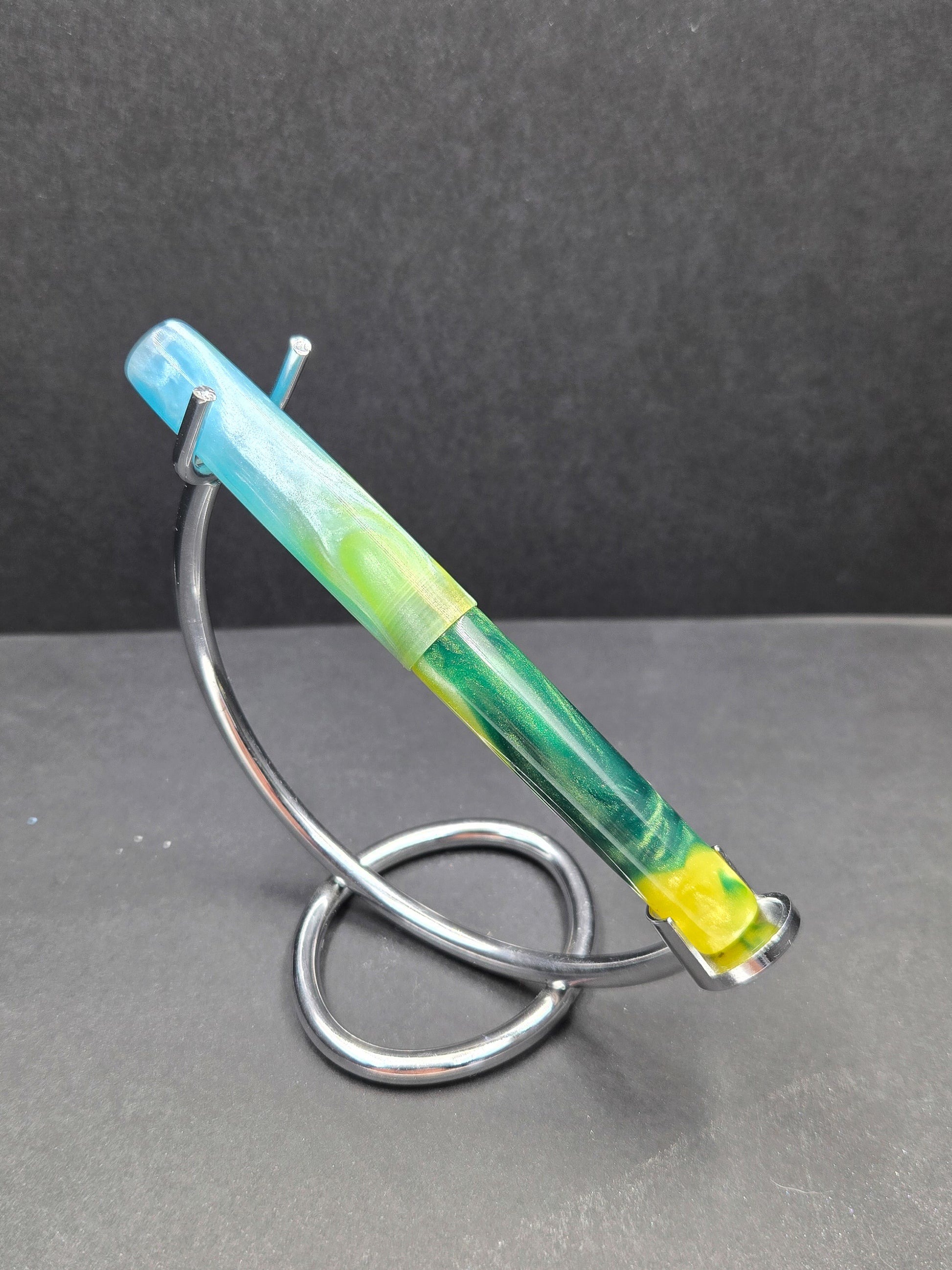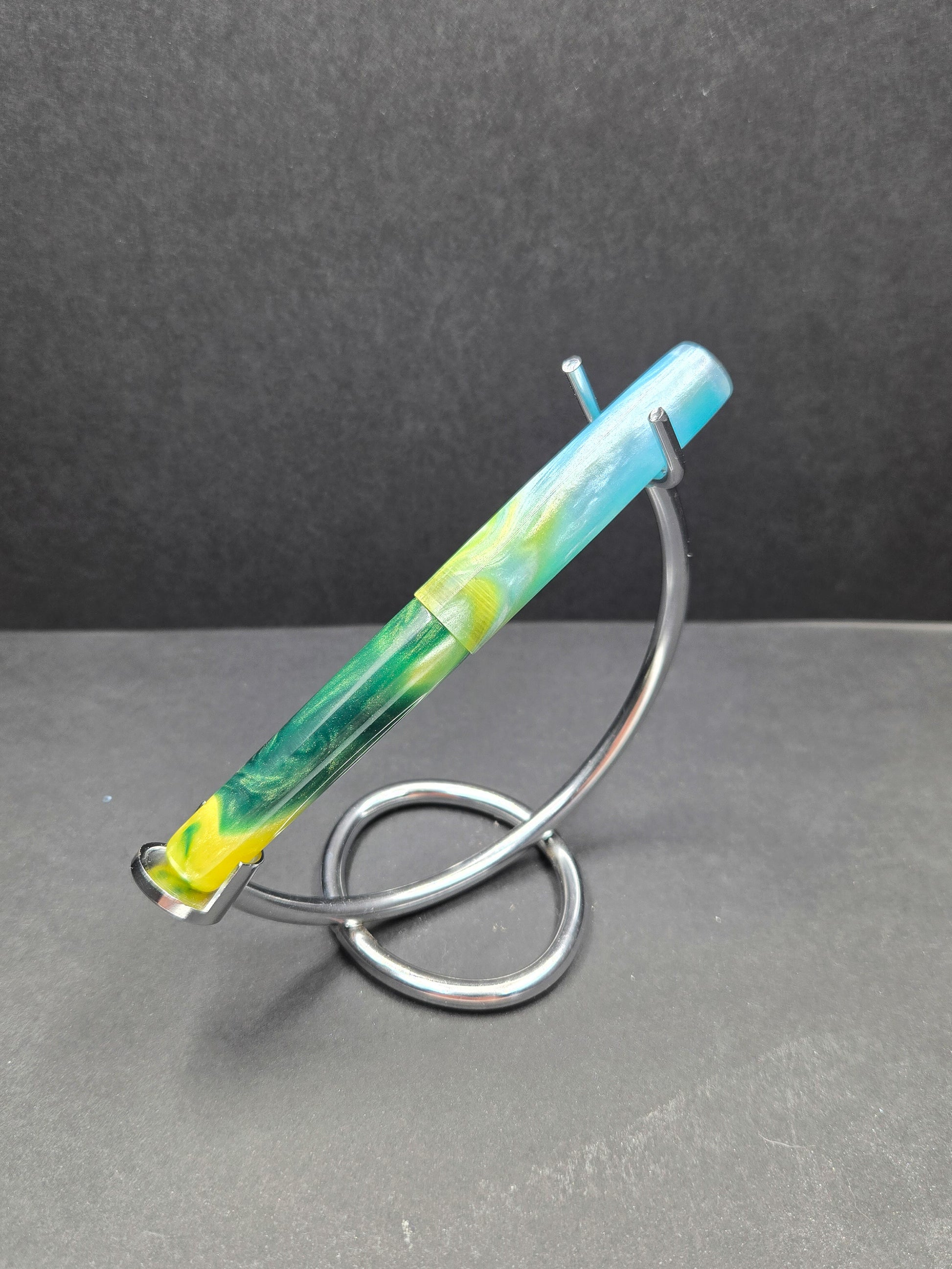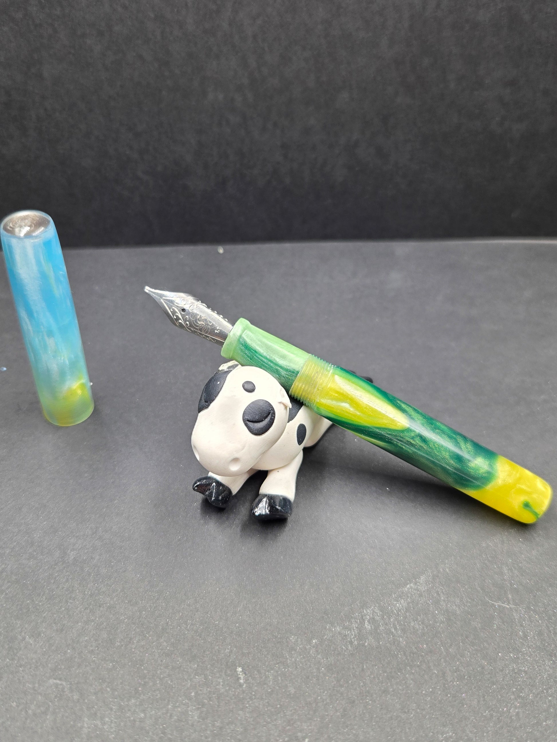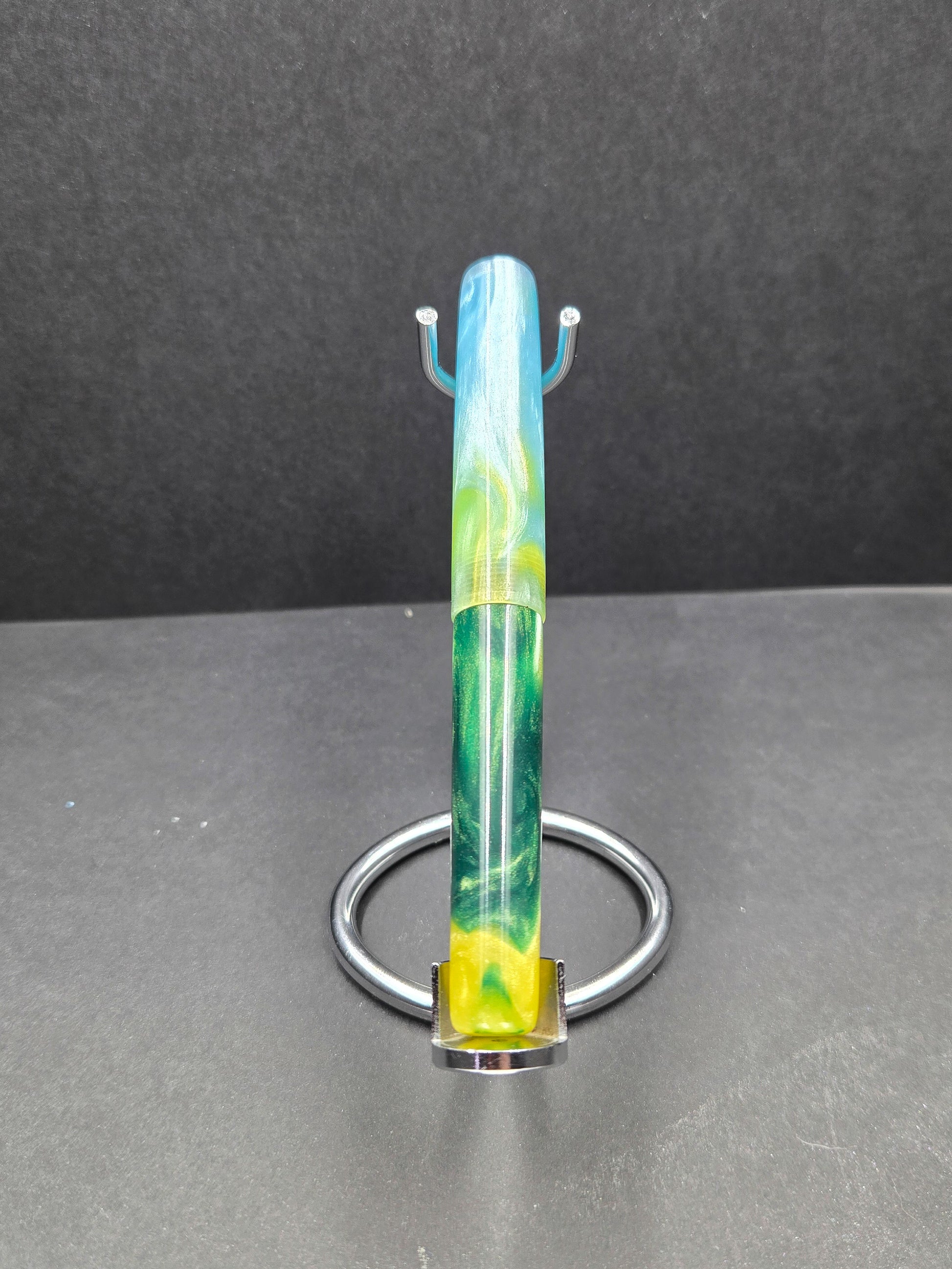 Springtime in a pocket—this F14 Prototype #4 is a delightful mystery born from year-end inventory clearing. Green, baby blue, white, and yellow swirl together in an unexpectedly harmonious dance, creating a cheerful palette that feels fresh and full of possibility. The original purpose of this experimental resin blend remains unknown, but what emerged is pure joy in pen form. This one-of-a-kind pocket companion captures that perfect moment when seasons collide—think fresh grass meeting clear skies with hints of sunshine peeking through. Limited and unrepeatable, this prototype is the kind of happy accident that reminds us why we love collecting pens. Perfect for anyone who appreciates color combinations that shouldn't work but absolutely do, loves owning something genuinely unique, or simply wants a pen that brings a smile every time they reach for it. Don't miss this charming blend of serendipity and style—prototypes this playful don't come around often.