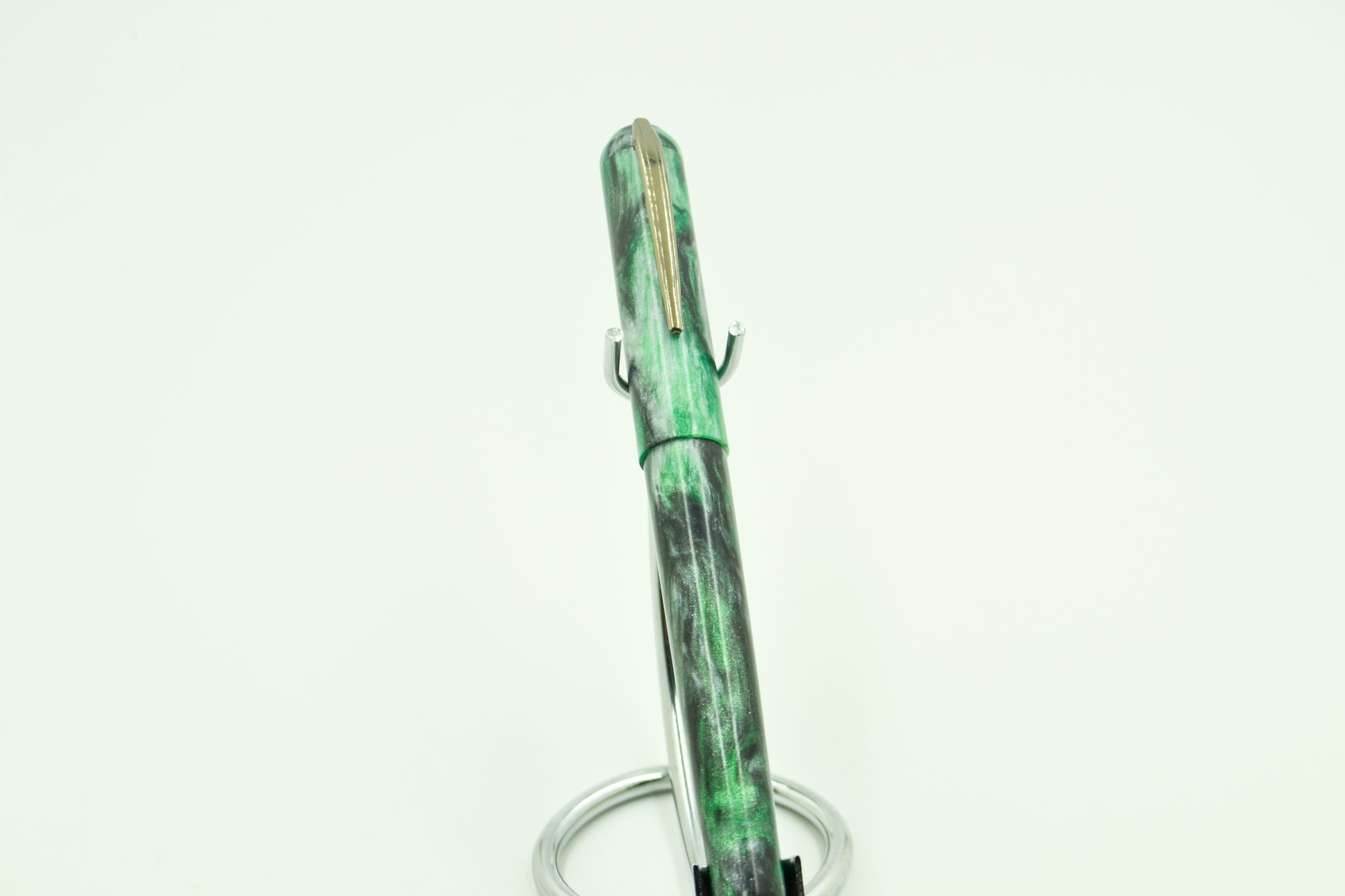 Beautiful material on this pen, Pictures do not do it justice. From our friends at DiamondCast, The deep emerald green, pearl white, and brilliant silver mix together in a swirling pattern reminiscent of stormy green seas, like you might find off the NC coast.