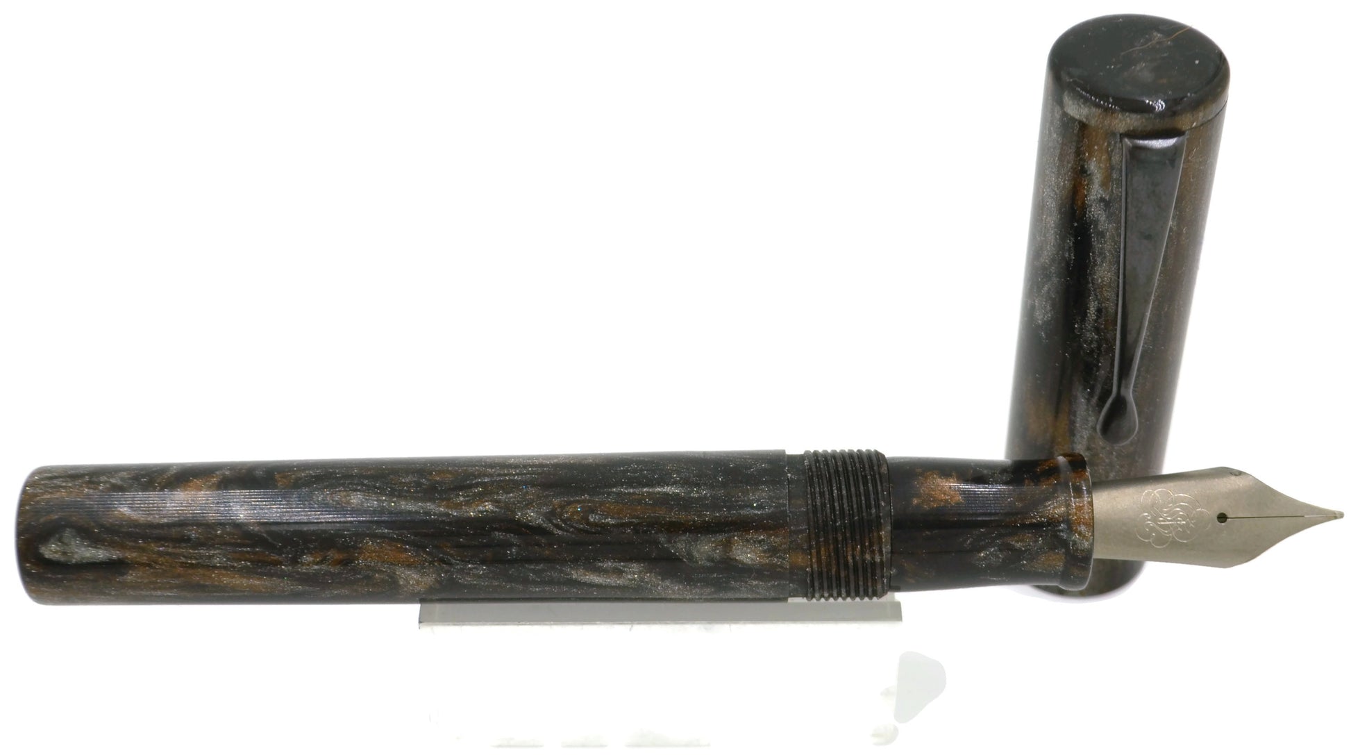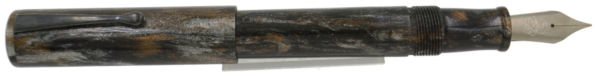 This is a custom diamond cast resin you will only find at Hinze Pens. The black, bronze, and silver swirls light up in direct sunlight. Pictures cannot do this pen justice.